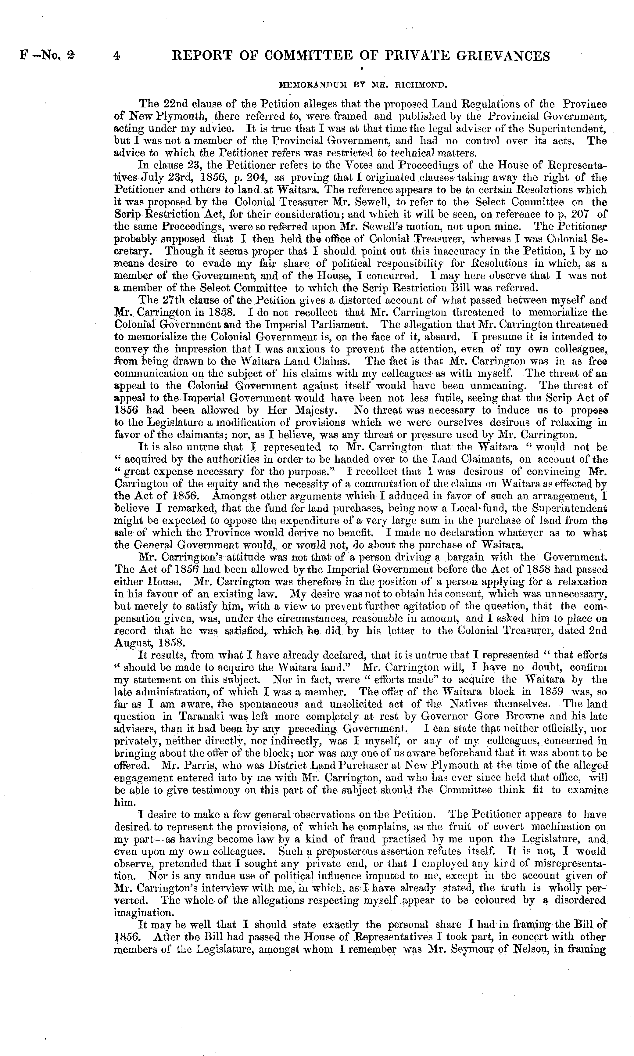 * MEMORANDUM BY ME. RICHMOND. The 22nd clause of the Petition alleges that the proposed Land Regulations of the Province of New Plymouth, there referred to, were framed and published by the Provincial Government, acting under my advice. It is true that I was at that time the legal adviser of the Superintendent, but I was not a member of the Provincial Government, and had no control over its acts. The advice to which the Petitioner refers was restricted to technical matters. In clause 23, the Petitioner refers to the Votes and Proceedings of the House of Representatives July 23rd, 1856, p. 204, as proving that I originated clauses taking away the right of the Petitioner and others to land at Waitara. The reference appears to be to certain Resolutions which it was proposed by the Colonial Treasurer Mr. Sewell, to refer to the Select Committee on the Scrip Restriction Act, for their consideration; and which it will be seen, on reference to p, 207 of the same Proceedings, were so referred upon Mr. SewelPs motion, not upon mine. The Petitioner probably supposed that I then held the office of Colonial Treasurer, whereas I was Colonial Secretary. Though it seems proper that I should point out this inaccuracy in the Petition, Iby no means desire to evade my fair share of political responsibility for Resolutions in which, as a member of the Government, and of the House, I concurred. I may here observe that I was not a member of the Select Committee to which the Scrip Restriction Bill was referred. The 27th clause of the Petition gives a distorted account of what passed between myself and Mr. Carrington in 1858. Ido not recollect that Mr. Carrington threatened to memorialize the Colonial Government and the Imperial Parliament. The allegation that Mr. Carrington threatened to memorialize the Colonial Government is, on the face of it, absurd. I presume it is intended to convey the impression that I was anxious to prevent the attention, even of my own colleagues, from being drawn to the Waitara Land Claims. The fact is that Mr. Carrington was in as free communication on the subject of his claims with my colleagues as with myself. The threat of an appeal to the Colonial Government against itself would have been unmeaning. The threat of appeal to the Imperial Government would have been not less futile, seeing that the Scrip Act of 1856 had been allowed by Her Majesty. No threat was necessary to induce us to propose to the Legislature a modification of provisions which we were ourselves desirous of relaxing in favor of the claimants; nor, as I believe, was any threat or pressure used by Mr. Carrington. It is also untrue that I represented to Mr. Carrington that the Waitara " would not be " acquired by the authorities in order to be handed over to the Land Claimants, on account of the " great expense necessary for the purpose." I recollect that I was desirous of convincing Mr. Carrington of the equity and the necessity of a commutation of tho claims on Waitara as effected by the Act of 1856. Amongst other arguments which I adduced in favor of such an arrangement, I believe I remarked, that the fund for land purchases, being now a Local-fund, the Superintendent might be expected to oppose tho expenditure of a very large sum in the purchase of land from the sale of which the Province would derive no benefit. I made no declaration whatever as to what the General Government would, or would not, do about the purchase of Waitara. Mr. Carrington's attitude was not that of a person driving a bargain with the Government. The Act of 1856 had been allowed by the Imperial Government before the Act of 1858 had passed either House. Mr. Carrington was therefore in the position of a person applying for a relaxation in his favour of an existing law. My desire was not to obtain his consent, which was unnecessary, but merely to satisfy him, with a view to prevent further agitation of the question, that the compensation given, was, under the circumstances, reasonable in amount, and I asked him to place on record that he was satisfied, which he did by his letter to the Colonial Treasurer, dated 2nd August, 1858. It results, from what I have already declared, that it is untrue that I represented " that efforts " should be made to acquire the Waitara land." Mr. Carrington will, I have no doubt, confirm my statement on this subject. Nor in fact, were " efforts made" to acquire the Waitara by the late administration, of which I was a member. The offer of the Waitara block in 1859 was, so far as I am aware, the spontaneous and unsolicited act of tho Natives themselves. The land question in Taranaki was left more completely at rest by Governor Gore Browne and his late advisers, than it had been by any preceding Government. I can state that neither officially, nor privately, neither directly, nor indirectly, was I myself, or any of my colleagues, concerned in bringing about the offer of the block; nor was any one of us aware beforehand that it was about to be offered. Mr. Parris, who was District Land Purchaser at New Plymouth at the time of the alleged engagement entered into by me with Mr. Carrington, and who has ever since held that office, will be able to give testimony on this part of the subject should the Committee think fit to examine him. I desire to make a few general observations on the Petition. The Petitioner appears to have desired to represent tho provisions, of which he complains, as the fruit of covert machination on my part —as having become law by a kind of fraud practised by me upon the Legislature, and even upon my own colleagues. Such a preposterous assertion refutes itself. It is not, I would observe, pretended that I sought any private end, or that I employed any kind of misrepresentation. Nor is any undue use of political influence imputed to me, except in the account given of Mr. Carrington's interview with me, in which, as I have already stated, the truth is wholly perverted. The whole of the allegation