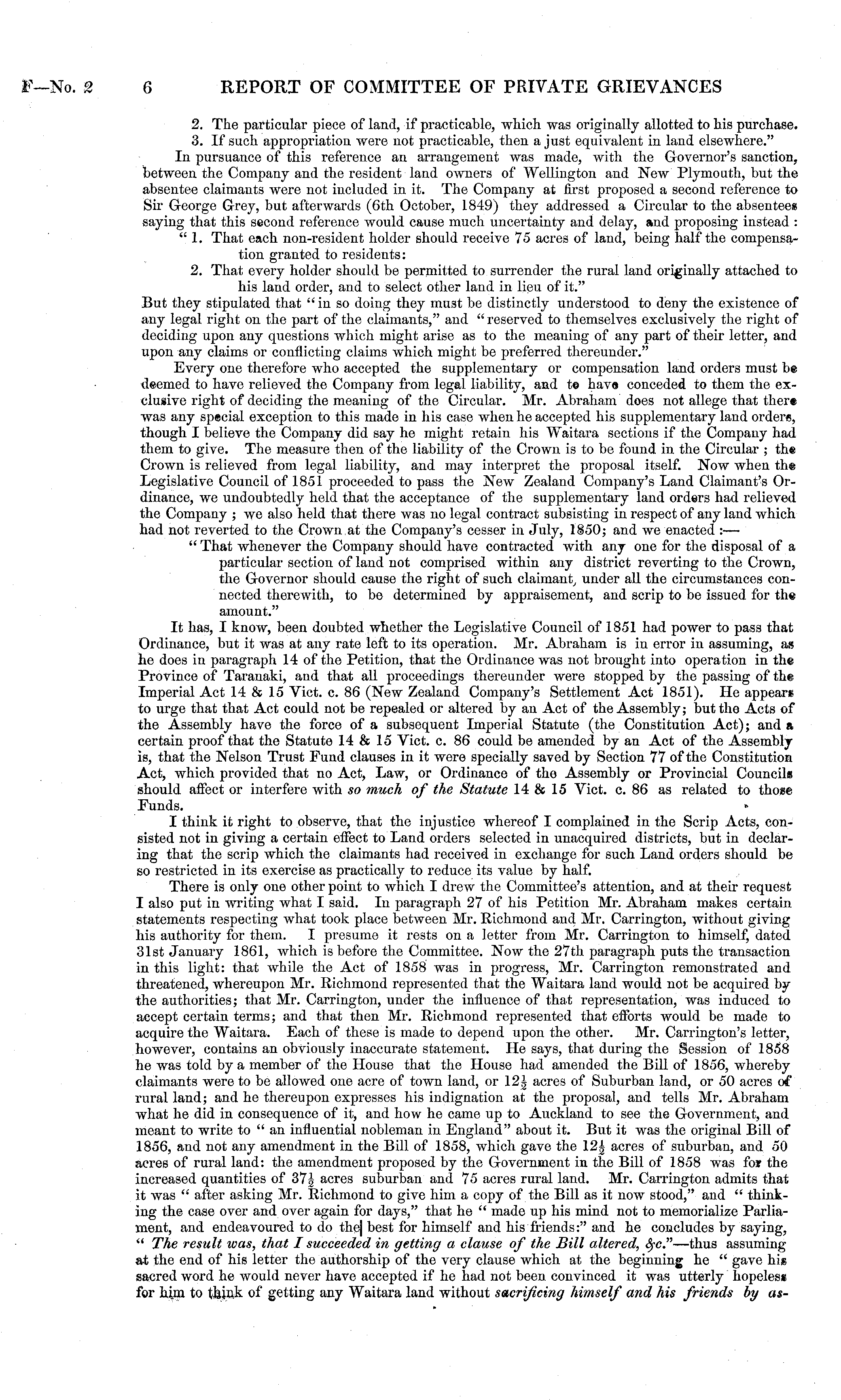 2. The particular piece of land, if practicable, which was originally allotted to his purchase. 3. If such appropriation were not practicable, then a just equivalent in land elsewhere." In pursuance of this reference an arrangement was made, with the Governor's sanction, between the Company and the resident land owners of Wellington and New Plymouth, but the absentee claimants were not included in it. The Company at first proposed a second reference to Sir George Grey, but afterwards (6th October, 1849) they addressed a Circular to the absentees saying that this second reference would cause much uncertainty and delay, and proposing instead : " 1. That each non-resident holder should receive 75 acres of land, being half the compensation granted to residents: 2. That every holder should be permitted to surrender the rural land originally attached to his land order, and to select other land in lieu of it." But they stipulated that "in so doing they must be distinctly understood to deny the existence of any legal right on the part of the claimants," and " reserved to themselves exclusively the right of deciding upon any questions which might arise as to the meaning of any part of their letter, and upon any claims or conflicting claims which might be preferred thereunder." Every one therefore who accepted the supplementary or compensation land orders must be deemed to have relieved the Company from legal liability, and t© have conceded to them the exclusive right of deciding the meaning of the Circular. Mr. Abraham does not allege that there was any special exception to this made in his case when he accepted his supplementary land orders, though I believe the Company did say he might retain his Waitara sections if the Company had them to give. The measure then of the liability of the Crown is to be found in the Circular ; the Crown is relieved from legal liability, and may interpret the proposal itself. Now when the Legislative Council of 1851 proceeded to pass the New Zealand Company's Land Claimant's Ordinance, we undoubtedly held that the acceptance of the supplementary land orders had relieved the Company ; we also held that there was no legal contract subsisting in respect of any land which had not reverted to the Crown at the Company's cesser in July, 1850; and we enacted :— " That whenever the Company should have contracted with any one for the disposal of a particular section of land not comprised within any district reverting to the Crown, the Governor should cause the right of such claimant, under all the circumstances connected therewith, to be determined by appraisement, and scrip to be issued for the amount." It has, I know, been doubted whether the Legislative Council of 1851 had power to pass that Ordinance, but it was at any rate left to its operation. Mr. Abraham is in error in assuming, as he does in paragraph 14 of the Petition, that the Ordinance was not brought into operation in the Province of Taranaki, and that all proceedings thereunder were stopped by the passing of the Imperial Act 14 &15 Vict. c. 86 (New Zealand Company's Settlement Act 1851). He appears to urge that that Act could not be repealed or altered by an Act of the Assembly; but the Acts of the Assembly have the force of a subsequent Imperial Statute (the Constitution Act); and a certain proof that the Statute 14 & 15 Vict. c. 86 could be amended by an Act of the Assembly is, that the Nelson Trust Fund clauses in it were specially saved by Section 77 of the Constitution Act, which provided that no Act, Law, or Ordinance of the Assembly or Provincial Councils should affect or interfere with so much of the Statute 14 & 15 Vict. c. 86 as related to those Funds. I think it right to observe, that the injustice whereof I complained in the Scrip Acts, consisted not in giving a certain effect to Land orders selected in unacquired districts, but in declaring that the scrip which the claimants had received in exchange for such Land orders should be so restricted in its exercise as practically to reduce its value by half. There is only one other point to which I drew the Committee's attention, and at their request I also put in writing what I said. In paragraph 27 of his Petition Mr. Abraham makes certain statements respecting what took place between Mr. Richmond and Mr. Carrington, without giving his authority for them. I presume it rests on a letter from Mr. Carrington to himself, dated 31st January 1861, which is before the Committee. Now the 27th paragraph puts the transaction in this light: that while the Act of 1858 was in progress, Mr. Carrington remonstrated and threatened, whereupon Mr. Richmond represented that the Waitara land would not be acquired by the authorities; that Mr. Carrington, under the influence of that representation, was induced to accept certain terms; and that then Mr. Richmond represented that efforts would be made to acquire the Waitara. Each of these is made to depend upon the other. Mr. Carrington's letter, however, contains an obviously inaccurate statement. He says, that during the Session of 1858 he was told by a member of the House that the House had amended the Bill of 1856, whereby claimants were to be allowed one acre of town land, or 12J acres of Suburban land, or 50 acres of rural land; and he thereupon expresses his indignation at the proposal, and tells Mr. Abraham what he did in consequence of it, and how he came up to Auckland to see the Government, and meant to write to "an influential nobleman in England" about it. But it was the original Bill of 1856, and not any amendment in the Bill of 1858, which gave the 12| acres of suburban, and 50 acres of rural land: the amendment proposed by the Government in the Bill of 1858 was fo* the increased quantities of 37J acres suburban and 75 acres rural land. Mr. Carrington admits that it was " after asking Mr. Richmond to give him a copy of the Bill as it now stood," and " thinking the case over and over again for days," that he
