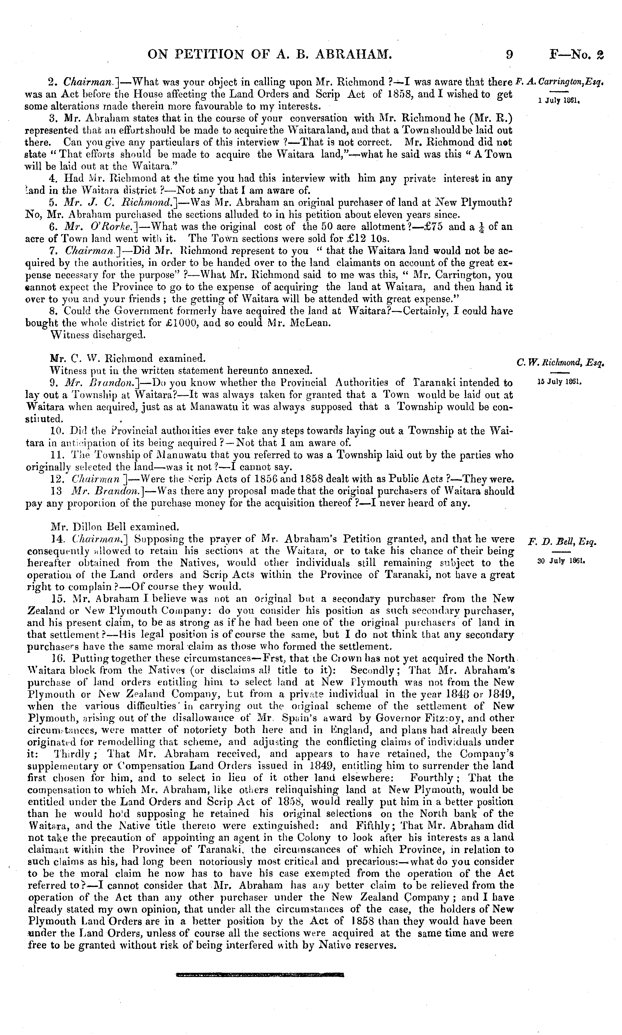 2. Chairman."] —What was your object in calling upon Mr. Richmond ?—I was aware that there. was an Act before the House affecting the Land Orders and Scrip Act of 1858, and I wished to get some alterations made therein more favourable to my interests. 3. Mr. Abraham states that in the course of your conversation with Mr. Richmond he (Mr. R.) represented that an effort should be made to acquire the Waitaraland, and that a Town should be laid out there. Can you give any particulars of this interview ?—That is not correct. Mr. Richmond did not state " That efforts should be made to acquire the Waitara land,"—what he said was this " A Town will be laid out at the Waitara," 4. Had Mr. Richmond at the time you had this interview with him any private interest in any iand in the Waitara district ?—Not any that I am aware of. 5. Mr. J. C. Richmond.'] —Was Mr. Abraham an original purchaser of land at New Plymouth? No, Mr. Abraham purchased the sections alluded to in his petition about eleven years since. 6. Mr. O'Rorke,] —What was the original cost of the 50 acre allotment ?—£7s and a J of an acre of Town land went with it. The Town sections were sold for £12 10s. 7. Chairman] —Did Mr. Richmond represent to you " that the Waitara land would not be acquired by the authorities, in order to be handed over to the land claimants on account of the great expense necessary for the purpose" ?—What Mr. Richmond said to me was this, " Air. Carrington, you cannot expect the Province to go to the expense of acquiring the land at Waitara, and then hand it over to you and your friends ; the getting of Waitara will be attended with great expense." 8. Could the Government formerly have acquired the land at Waitara?—Certainly, I could have bought the whole district for £1000, and so could Mr. McLean. Witness discharged. Mr. C. W. Richmond examined. Witness put in the written statement hereunto annexed. 9. Mr. Brandon.] —Do you know whether the Provincial Authorities of Taranaki intended to lay out a Township at Waitara?—lt was always taken for granted that a Town would be laid out at Waitara when acquired, just as at Manawatu it was always supposed that a Township would be constituted. 10. Did the Provincial authorities ever take any steps towards laying out a Township at the Waitara in anticipation of its being acquired ? —Not that I am aware of. 11. The Township of Manuwatu that you referred to was a Township laid out by the parties who originally selected the land—was it not ?—I cannot say. 12. Chairman ] —Were the Scrip Acts of 1856 and 1858 dealt with as Public Acts ?—They were. 13 Mr. Brandon.] —Was there any proposal made that the original purchasers of Waitara should pay any proportion of the purchase money for the acquisition thereof ?—I never heard of any. Mr. Dillon Bell examined. 14. Chairman.] Supposing the prayer of Mr. Abraham's Petition granted, and that he were consequently flowed to retain his sections at the Waitara, or to take his chance of their being hereafter obtained from the Natives, would other individuals still remaining subject to the operation of the Land orders and Scrip Acts within the Province of Taranaki, not have a great right to complain ?—Of course they would. 15. Mr. Abraham I believe was not an original but a secondary purchaser from the New Zealand or Sew Plymouth Company: do you consider his position as such secondary purchaser, and his present claim, to be as strong as if he had been one of the original purchasers of land in that settlement?— His legal position is of course the same, but I do not think that any secondary purchasers have the same moral claim as those who formed the settlement. 16. Putting together these circumstances—Frst, that the C'town has not yet acquired the North Waitara block from the Natives (or disclaims al) title to it): Secondly; That Mr. Abraham's purchase of land orders entitling him to select land at New Plymouth was not from the New Plymouth or New Zealand Company, hut from a private individual in the year 1848 or 1849, when the various difficulties' in carrying out the original scheme of the settlement of New Plymouth, arising out of the disallowance of Mr Spain's award by Governor Fitzroy, and other circumstances, were matter of notoriety both here and in England, and plans had already been originated for remodelling that scheme, and adjusting the conflicting claims of individuals under it: Thirdly; That Mr. Abraham received, and appears to have retained, the Company's supplementary or Compensation Land Orders issued in 1849, entitling him to surrender the land first chosen for him, and to select in lieu of it other land elsewhere: Fourthly ; That the compensation to which Mr. Abraham, like others relinquishing land at New Plymouth, would be entitled under the Land Orders and Scrip Act of 1858, would really put him in a better position than he would ho!d supposing he retained his original selections on the North bank of the Waitara, and the Native title thereto were extinguished: and Fifthly; That Mr. Abraham did not take the precaution of appointing an agent in the Colony to look after his interests as a land claimant within the Province of Taranaki, the circumstances of which Province, in relation to such claims as his, had long been notoriously most critical and precarious:—-what do you consider to be the moral claim he now has to have his case exempted from the operation of the Act referred to ?—I cannot consider that Mr. Abraham has any better claim to be relieved from the operation of the Act than any other purchaser under the New Zealand Company ; and I have already stated my own opinion, that under all the circumstances of the case, the holders of New Plymouth Land Orders are in a better position by the Act of 1858 than they would have been under the Land Orders, unless of course all the sections were acquired at the same time and were free to be granted without risk of being interf