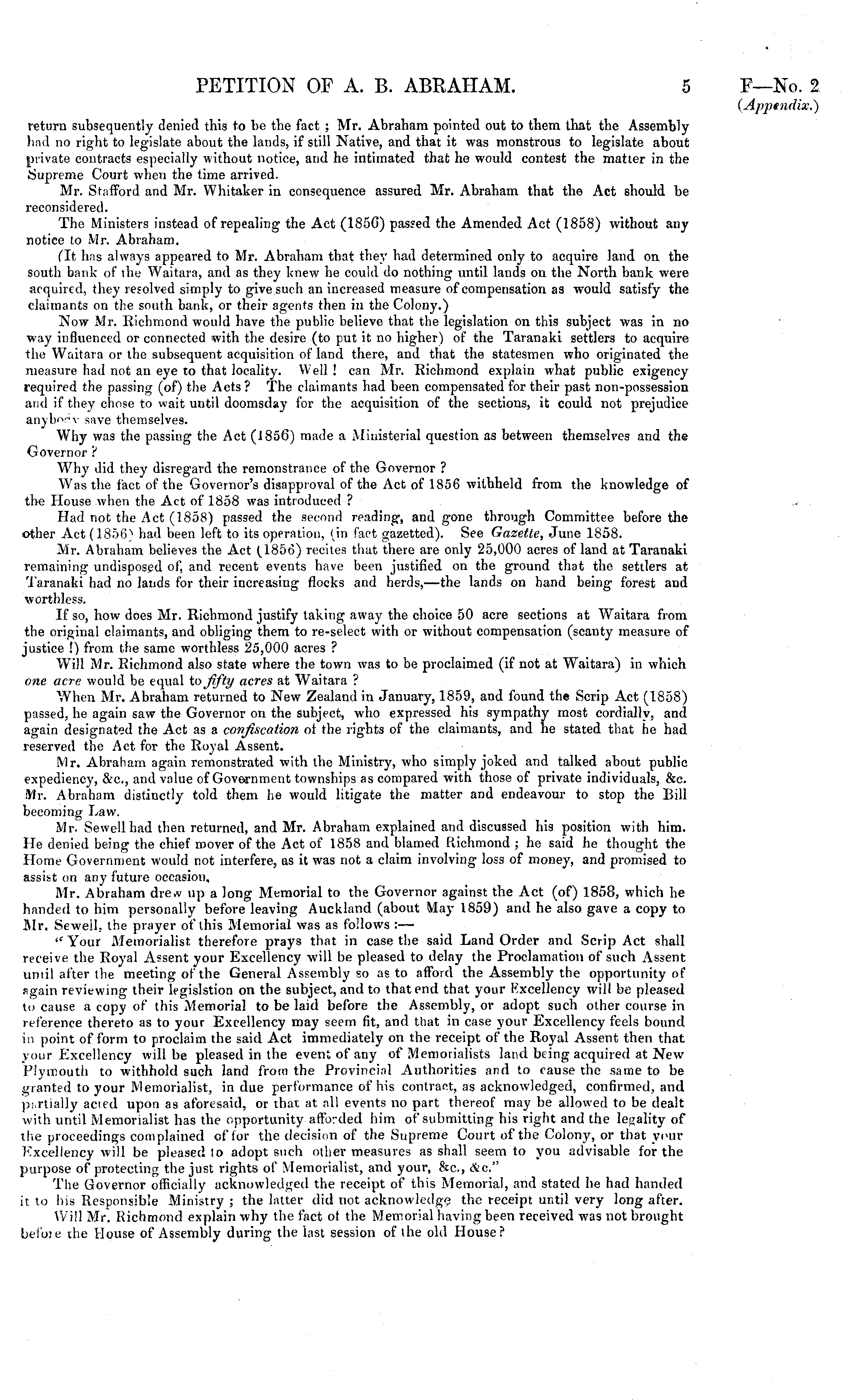 return subsequently denied this to be the fact ; Mr. Abraham pointed out to them that the Assembly had no right to legislate about the lands, if still Native, and that it was monstrous to legislate about private contracts especially without notice, and he intimated that he would contest the matter in the Supreme Court when the time arrived. Mr. Stafford and Mr. Whitaker in consequence assured Mr. Abraham that the Act should be reconsidered. The Ministers instead of repealing the Act (1850) passed the Amended Act (1858) without any notice to Mr. Abraham. fit has always appeared to Mr. Abraham that they had determined only to acquire land on the south bank of the Waitara, and as they knew he could do nothing until lands on the North bank were acquired, they resolved simply to give such an increased measure of compensation as would satisfy the claimants on the south bank, or their agents then in the Colony.) Now Mr. Richmond would have the public believe that the legislation on this subject was in no way influenced or connected with the desire (to put it no higher) of the Taranaki settlers to acquire the Waitara or the subsequent acquisition of land there, and that the statesmen who originated the measure had not an eye to that locality. Well ! can Mr. Richmond explain what public exigency required the passing (of) the Acts ? The claimants had been compensated for their past non-possession and if they chose to wait until doomsday for the acquisition of the sections, it could not prejudice anyb""v save themselves. Why was the passing the Act (1856) made a Ministerial question as between themselves and the Governor ? Why did they disregard the remonstrance of the Governor ? Was the fact of the Governor's disapproval of the Act of 1856 withheld from the knowledge of the House when the Act of 1858 was introduced ? Had not the Act (1858) passed the second reading, and gone through Committee before the other Act (1856) had been left to its operation, (in fact gazetted). See Gazette, June 1858. Mr. Abraham believes the Act (1856) recites that there are only 25,000 acres of land at Taranaki remaining undisposed of, and recent events have been justified on the ground that the settlers at Taranaki had no lands for their increasing flocks and herds, —the lands on hand being forest and worthless. If so, how does Mr. Richmond justify taking away the choice 50 acre sections at Waitara from the original claimants, and obliging them to re-select with or without compensation (scanty measure of justice !) from the same worthless 25,000 acres ? Will Mr. Richmond also state where the town was to be proclaimed (if not at Waitara) in which one acre would be equal to fifty acres at Waitara ? When Mr. Abraham returned to New Zealand in January, 1859, and found the Scrip Act (1858) passed, he again saw the Governor on the subject, who expressed his sympathy most cordially, and again designated the Act as a confiscation of the rights of the claimants, and he stated that he had reserved the Act for the Royal Assent. Mr. Abraham again remonstrated with the Ministry, who simply joked and talked about public expediency, &c, and value of Government townships as compared with those of private individuals, &c. Mr. Abraham distinctly told them he would litigate the matter and endeavour to stop the Bill becoming Law. Mr. Sewell had then returned, and Mr. Abraham explained and discussed his position with him. He denied being the chief mover of the Act of 1858 and blamed Richmond . ho said he thought the Home Government would not interfere, as it was not a claim involving loss of money, and promised to assist on any future occasion. Mr. Abraham drew up a long Memorial to the Governor against the Act (of) 1858, which he handed to him personally before leaving Auckland (about May 1859) and he also gave a copy to Mr. Sewell, the prayer of this Memorial was as follows :— " Your Memorialist therefore prays that in case the said Land Order and Scrip Act shall receive the Royal Assent your Excellency will be pleased to delay the Proclamation of such Assent until after the meeting of the General Assembly so as to afford the Assembly the opportunity of again reviewing their lfgislstion on the subject, and to that end that your Hxcellency will be pleased to cause a copy of this Memorial to be laid before the Assembly, or adopt such other course in reference thereto as to your Excellency may seem fit, and that in case your Excellency feels bound in point of form to proclaim the said Act immediately on the receipt of the Royal Assent then that your Excellency will be pleased in the event of any of Memorialists land being acquired at New Plymouth to withhold such land from the Provincial Authorities and to cause the same to be granted to your Memorialist, in due performance of his contract, as acknowledged, confirmed, and pirtially acted upon as aforesaid, or that, at all events no part thereof may be allowed to be dealt with until Memorialist has the opportunity afforded him of submitting his right and the legality of the proceedings complained of for the decision of the Supreme Court of the Colony, or that your Excellency will be pleased to adopt such other measures as shall seem to you advisable for the purpose of protecting the just rights of Memorialist, and your, &c, &c." The Governor officially acknowledged the receipt of this Memorial, and stated he had handed it to his Responsible Ministry ; the latter did not acknowledge the receipt until very long after. Will Mr. Richmond explain why the fact of the Memorial having been received was not brought befoie the House of Assembly during the last session of the old House?