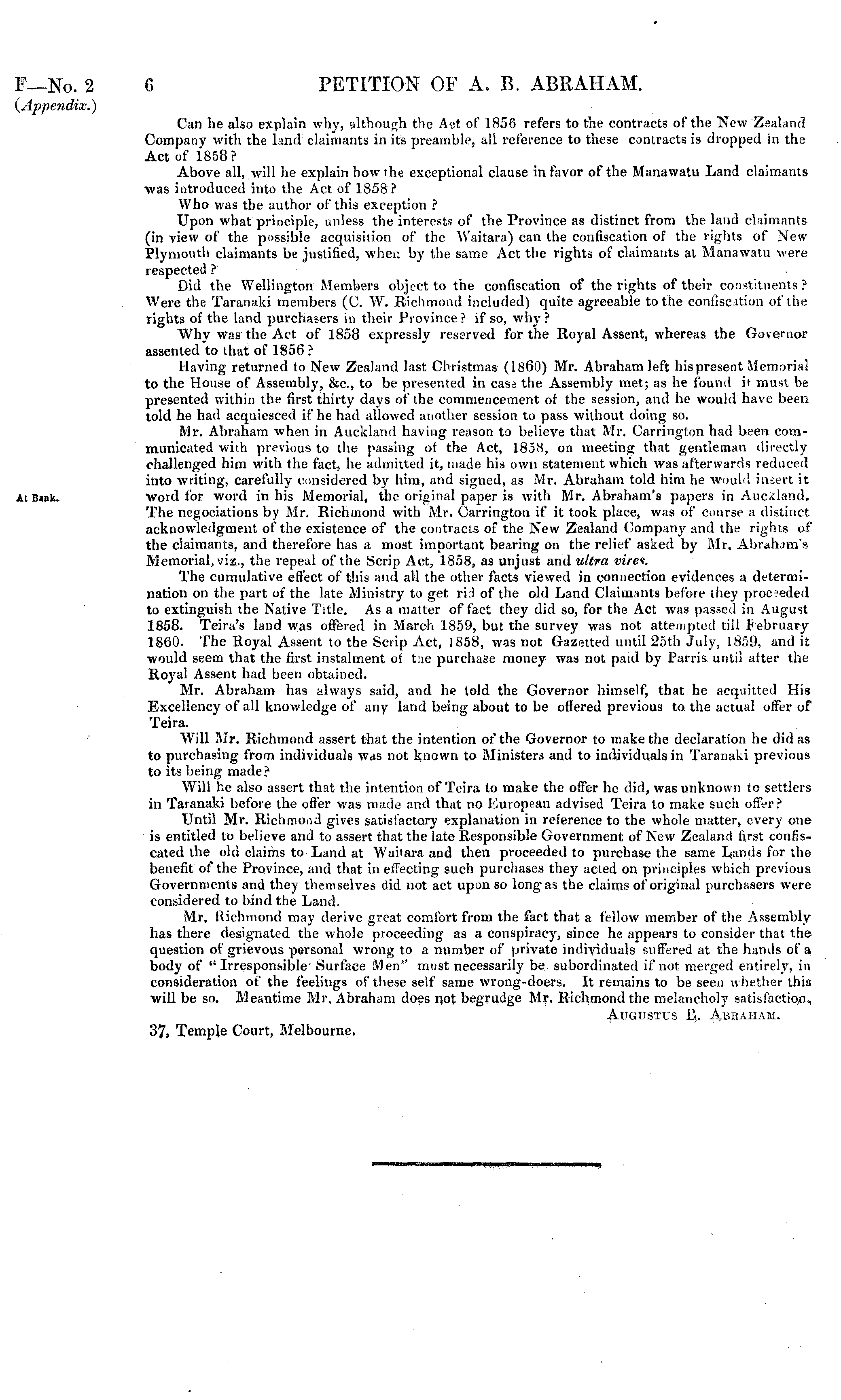 Can he also explain why, although the Act of 1856 refers to the contracts of the New Zealand Company with the land claimants in its preamble, all reference to these contracts is dropped in the Act of 1858? Above all, will he explain how the exceptional clause in favor of the Manawatu Land claimants was introduced into the Act of 1858? Who was the author of this exception ? Upon what principle, unless the interests of the Province as distinct from the land claimants (in view of the possible acquisition of the Waitara) can the confiscation of the rights of New Plymouth claimants be justified, when by the same Act the rights of claimants at Manawatu were respected ? Did the Wellington Members object to the confiscation of the rights of their constituents? Were the Taranaki members (C. W. Richmond included) quite agreeable to the confiscation of the rights of the land purchasers in their Province ? if so, why ? Why was the Act of 1858 expressly reserved for the Royal Assent, whereas the Governor assented to that of 1856 ? Having returned to New Zealand last Christmas (i860) Mr. Abraham left his present Memorial to the House of Assembly, &c, to be presented in cam the Assembly met; as he found it must be presented within the first thirty days of the commencement of the session, and he would have been told he had acquiesced if he had allowed another session to pass without doing so. Mr. Abraham when in Auckland having reason to believe that Mr. Carrington had been communicated with previous to the passing of the Act, 1858, on meeting that gentleman directly challenged him with the fact, he admitted it, made his own statement which was afterwards reduced into writing, carefully considered by him, and signed, as Mr. Abraham told him he would insert it word for word in his Memorial, the original paper is with Mr. Abraham's papers in Auckland. The negociations by Mr. Richmond with Mr. Carrington if it took place, was of course a distinct acknowledgment of the existence of the contracts of the New Zealand Company and the rights of the claimants, and therefore has a most important bearing on the relief asked by Mr. Abraham's Memorial, viz., the repeal of the Scrip Act, 1858, as unjust and ultra vires. The cumulative effect of this and all the other facts viewed in connection evidences a determination on the part of the late Ministry to get rid of the old Land Claimants before they proceeded to extinguish the Native Title. As a matter of fact they did so, for the Act was passed in August 1858. Teira's land was offered in March 1859, but the survey was not attempted till .February 1860. The Royal Assent to the Scrip Act, 1858, was not Gazetted until 25th July, 1859, and it would seem that the first instalment of the purchase money was not paid by Parris until after the Royal Assent had been obtained. Mr. Abraham has always said, and he told the Governor himself, that he acquitted His Excellency of all knowledge of any land being about to be offered previous to the actual offer of Teira. Will Mr. Richmond assert that the intention of the Governor to make the declaration he did as to purchasing from individuals was not known to Ministers and to individuals in Taranaki previous to its being made? Will he also assert that the intention of Teira to make the offer he did, was unknown to settlers in Taranaki before the offer was made and that no European advised Teira to make such offer? Until Mr. Richmond gives satisfactory explanation in reference to the whole matter, every one is entitled to believe and to assert that the late Responsible Government of New Zealand first confiscated the old claims to Land at Waitara and then proceeded to purchase the same Lands for the benefit of the Province, and that in effecting such purchases they acted on principles which previous Governments and they themselves did not act upon so long as the claims of original purchasers were considered to bind the Land. Mr. Richmond may derive great comfort from the fact that a fellow member of the Assembly has there designated the whole proceeding as a conspiracy, since he appears to consider that the question of grievous personal wrong to a number of private individuals suffered at the hands of a, body of "Irresponsible Surface Men" must necessarily be subordinated if not merged entirely, in consideration of the feelings of these self same wrong-doers. It remains to be seen whether this will be so. Meantime Mr. Abraham does not begrudge Mr. Richmond the melancholy satisfaction, Augustus B. Abraham. 37, Temple Court, Melbourne.
