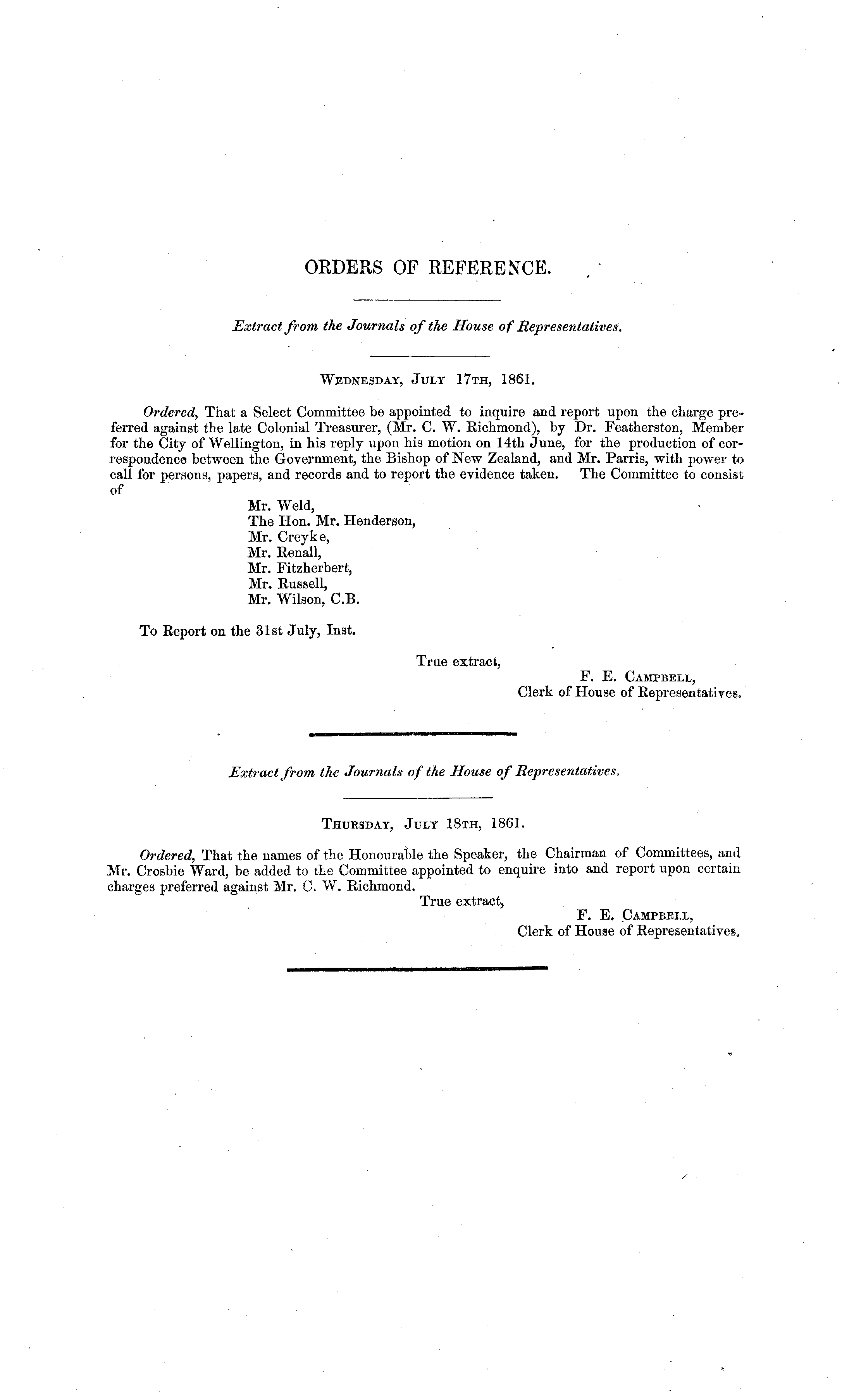 Wednesday, July 17th, 1861. Ordered, That a Select Committee be appointed to inquire and report upon the charge preferred against the late Colonial Treasurer, (Mr. C. W. Richmond), by Dr. Featherston, Member for the City of Wellington, in his reply upon his motion on 14th June, for the production of correspondence between the Government, the Bishop of New Zealand, and Mr. Parris, with power to call for persons, papers, and records and to report the evidence taken. The Committee to consist of Mr. Weld, The Hon. Mr. Henderson, Mr. Creyke, Mr. Renall, Mr. Fitzherbert, Mr. Russell, Mr. Wilson, C.B. To Report on the 31st July, Inst. True extract, F. E. Campbell, Clerk of House of Representatives.
