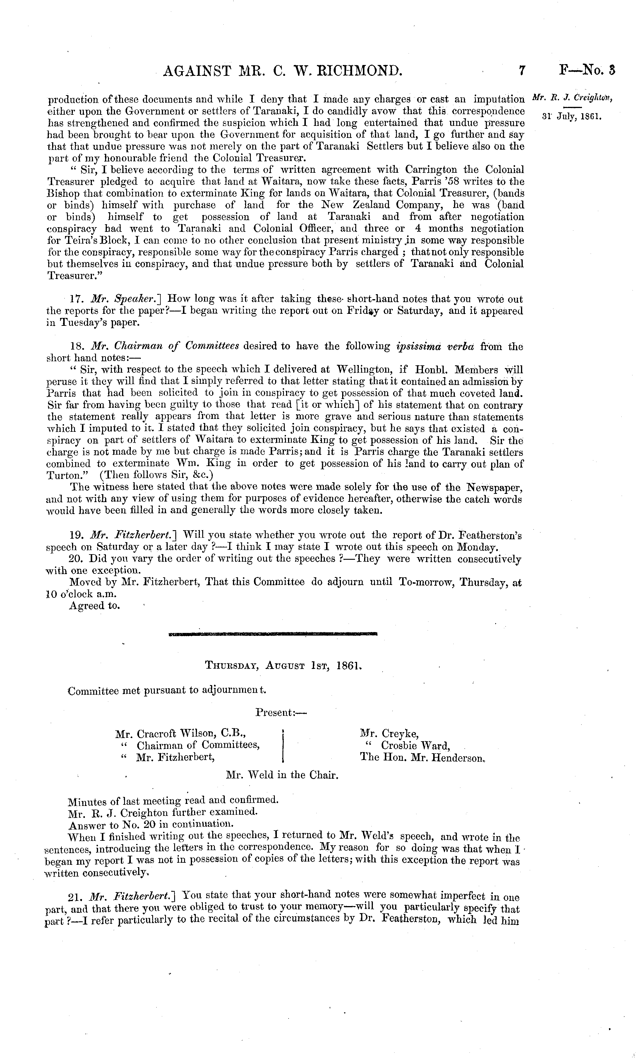 Thursday, August Ist, 186U Committee met pursuant to adjournment. Present:— Mr. Cracroft Wilson, C.8., Mr. Creyke, " Chairman of Committees, " Crosbie Ward, " Mr. Fitzherbert, The Hon. Mr. Henderson, i • Mr. Weld in the Chair. Minutes of last meeting read and confirmed. Mr. R. J. Creighton further examined. Answer to No. 20 in continuation. When I finished writing out the speeches, I returned to Mr. Weld's speech, and wrote in the sentences, introducing the letters in the correspondence. My reason for so doing was that when I - began my report I was not in possession of copies of the letters; with this exception the report was written consecutively. 21. Mr. Fitzherbert.] You state that your short-hand notes were somewhat imperfect in one part, and that there you were obliged to trust to your memory—will you particularly specify that part ? I refer particularly to the recital of the circumstances by Dr. Featherston, which led him