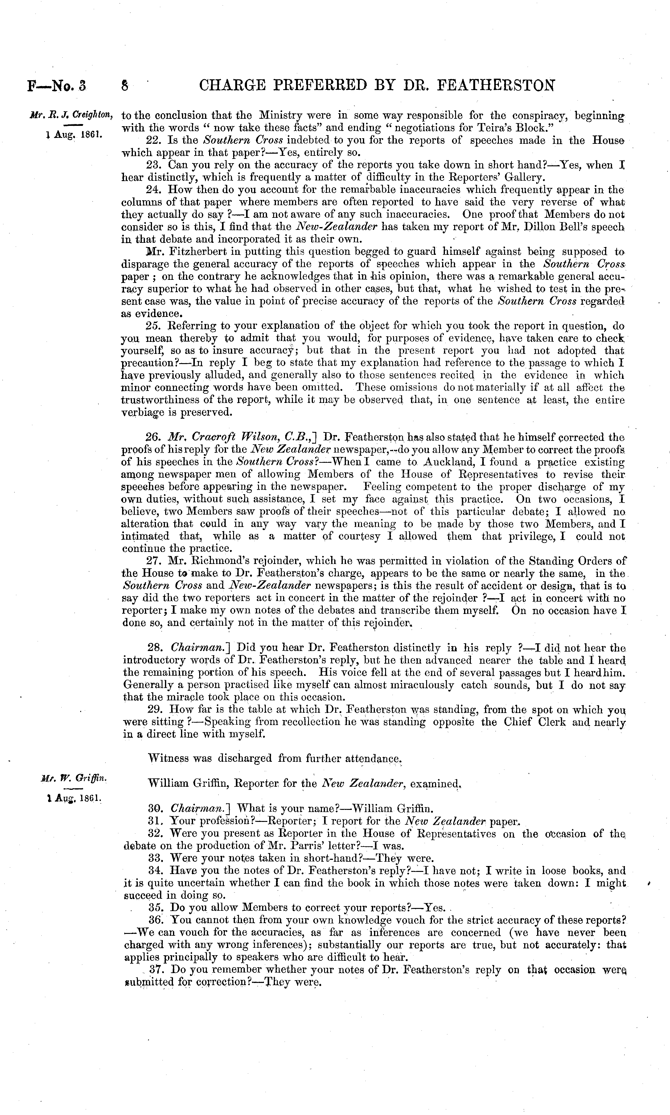 to the conclusion that the Ministry were in some way responsible for the conspiracy, beginning with the words " now take these facts" and ending " negotiations for Teira's Block." 22. Is the Southern Cross indebted to you for the reports of speeches made in the House which appear in that paper?— Yes, entirely so. 23. Can you rely on the accuracy of the reports you take down in short hand? —Yes, when I hear distinctly, which is frequently a matter of difficulty in the Reporters' Gallery. 24. How then do you account for the remarbable inaccuracies which frequently appear in the columns of that paper where members are often reported to have said the very reverse of what they actually do say ?—I am not aware of any such inaccuracies. One proof that Members do not consider so is this, I find that the Neio-Zealander has taken my report of Mr. Dillon Bell's speech in that debate and incorporated it as their own. Mr. Fitzherbert in putting this question begged to guard himself against being supposed to disparage the general accuracy of the reports of speeches which appear in the Southern Cross paper ; on the contrary he acknowledges that in his opinion, there was a remarkable general accuracy superior to what he had observed in other cages, but that, what he wished to test in the pre-, sent case was, the value in point of precise accuracy of the reports of the Southern Cross regarded as evidence. 25. Referring to your explanation of the object for which you took the report in question, do you mean thereby to admit that you would, for purposes of evidence, have taken care to check yourself, so as to insure accuracy; but that in the present report you had not adopted that precaution?—ln reply I beg to state that my explanation had reference to the passage to which I have previously alluded, and generally also to those sentences recited, in the evidence in which minor connecting words have been omitted. These omissions do not materially if at all afi'ect the trustworthiness of the report, while it may be observed that, in one sentence at least, the entire verbiage is preserved. 26. Mr. Cracroft Wilson, C.8.,] Dr. Featherston has also stated that he himself corrected the proofs of his reply for the New Zealander newspaper,-~do you allow any Member to correct the proofs of his speeches in the Southern Cross? — When I came to Auckland, I found a practice existing among newspaper men of allowing Members of the House of Representatives to revise their speeches before appearing in the newspaper. Feeling competent to the proper discharge of my own duties, without such assistance, I set my face against this practice. On two occasions, I helieve, two Members saw proofs of their speeches—not of this particular debate; I allowed no alteration that could in any way vary the meaning to be made by those two Members, and I intimated that, while as a matter of courtesy I allowed them that privilege, I could not continue the practice. 27. Mr. Richmond's rejoinder, which he was permitted in violation of the Standing Orders of the House to make to Dr. Featherston's charge, appears to be the same or nearly the same, in the Southern Cross and New-Zealander newspapers; is this the result of accident or design, that is to say did the two reporters act in concert in the matter of the rejoinder ?—I act in concert with no reporter; I make my own notes of the debates and transcribe them myself. On no occasion have I done so, and certainly not in the matter of this rejoinder. 28. Chairman.] Did you hear Dr. Featherston distinctly in his reply ?—I did not hear the introductory words of Dr. Featherston's reply, but he then advanced nearer the table and I heard the remaining portion of his speech. His voice fell at the end of several passages but I heard him. Generally a person practised like myself can almost miraculously catch sounds, but Ido not say that the miracle took place on this occasion. 29. How far is the table at which Dr. Featherston was standing, from the spot on which jow were sitting ?—Speaking from recollection he was standing opposite the Chief Clerk and nearly in a direct line with myself. Witness was discharged from further attendance. William Griffin, Reporter for the New Zealander, examined, 30. Chairman.] What is your name? —William Griffin. 31. Your profession?— Reporter; I report for the Neic Zealander paper. 32. Were you present as Reporter in the House of Representatives on the occasion of the debate on the production of Mr. Parris' letter?—l was. 33. Were your notes taken in short-hand?— They were. 34. Have you the notes of Dr. Featherston's reply?—l have not; I write in loose books, and it is quite uncertain whether I can find the book in which those notes were taken down: I might succeed in doing so. 35. Do you allow Members to correct your reports?— Yes. . 36. You cannot then from your own knowledge vouch for the strict accuracy of these reports? —We can vouch for the accuracies, as far as inferences are concerned (we have never been charged with any wrong inferences); substantially our reports are true, but not accurately: that applies principally to speakers who are difficult to hear. 37. Do you remember whether your notes of Dr. Featherston's reply on that occasion werq .submitted for correction? —They were.