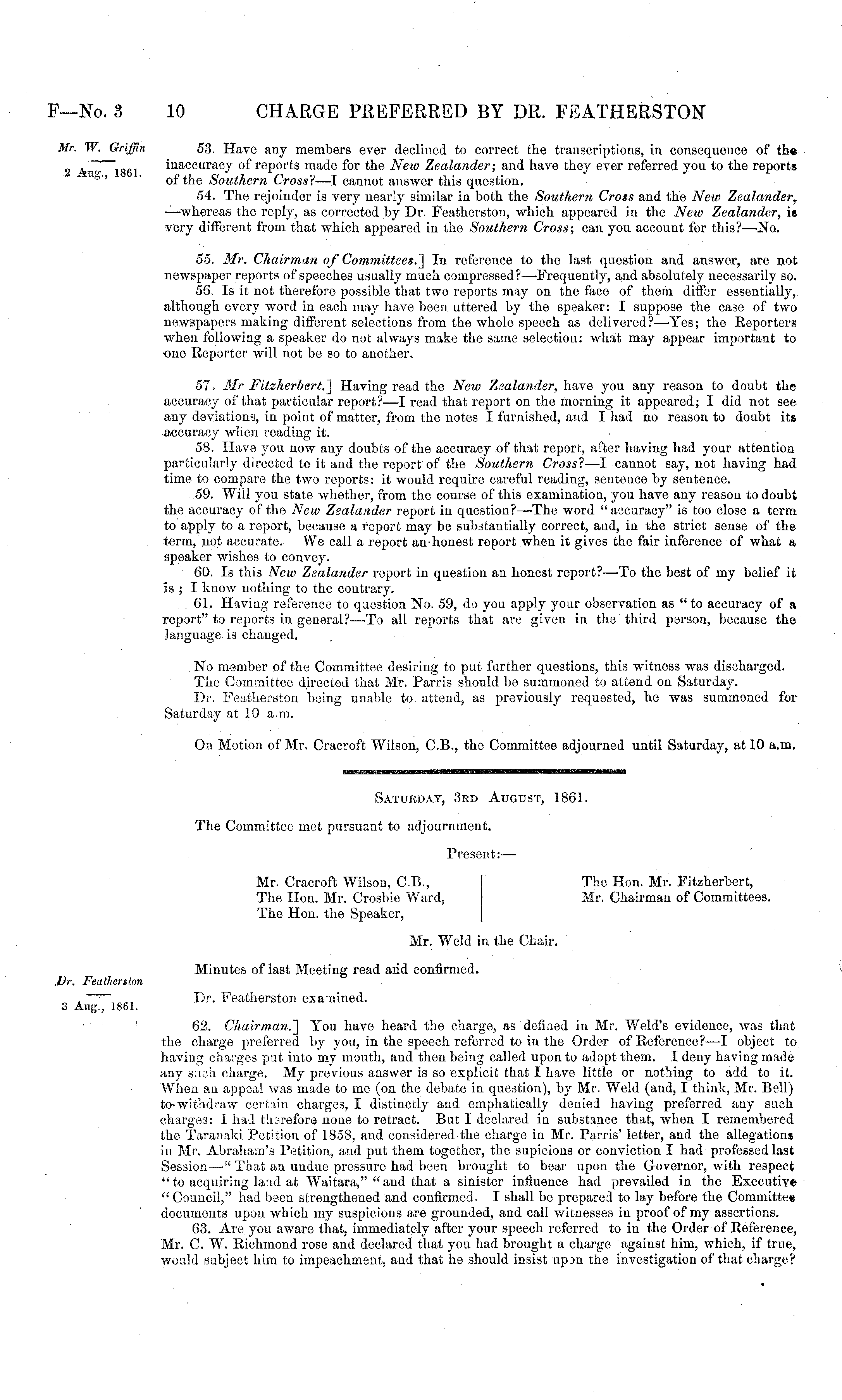 Saturday, 3rd August, 1861. The Committee met pursuant to adjournment. Present: — Mr. Cracroft Wilson, C.8., The Hon. Mr. Fitzherbert, The Hon. Mr. Crosbie Ward, Mr. Chairman of Committees. The Hon. the Speaker, Mr. Weld in the Chair. Minutes of last Meeting read and confirmed. Dr. Featherston examined. 62. Chairman.] You have heard the charge, as defined in Mr. Weld's evidence, was that the charge preferred by you, in the speech referred to in the Order of Reference ?—I object to having charges put into my mouth, and then being called upon to adopt them. I deny having made any such charge. My previous answer is so explicit that I have little or nothing to add to it. When an appeal was made to me (on the debate in question), by Mr. Weld (and, I think, Mr. Bell) to-withdraw certain charges, I distinctly and emphatically denied having preferred any such charges: I had therefore none to retract. But I declared in substance that, when I remembered the Taranaki Petition of 1858, and considered the charge in Mr. Parris' letter, and the allegations in Mr. Abraham's Petition, and put them together, the supicions or conviction I had professed last Session —" That an undue pressure had been brought to bear upon the Governor, with respect "to acquiring land at Waitara," "and that a sinister influence had prevailed in the Executive " Council," had been strengthened and confirmed, I shall be prepared to lay before the Committee documents upon which my suspicions are grounded, and call witnesses in proof of my assertions. 63. Are you aware that, immediately after your speech referred to in the Order of Reference, Mr. C. W. Richmond rose and declared that you had brought a charge against him, which, if true, would subject him to impeachment, and that he should insist upon the investigation of that charge?