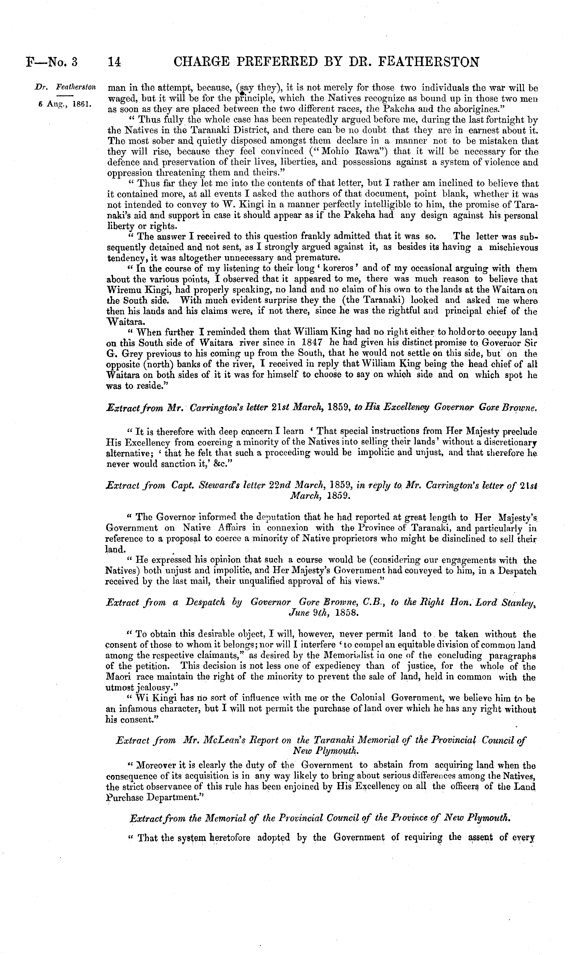 man in the attempt, because, (say they), it is not merely for those two individuals the war will be waged, but it will be for the principle, which the Natives recognize as bound up in those two men as soon as they are placed between the two different races, the Pakeha and the aborigines." " Thus fully the whole case has been repeatedly argued before me, during the last fortnight by the Natives in the Taranaki District, and there can be no doubt that they are in earnest about it. The most sober and quietly disposed amongst them declare in a manner not to be mistaken that they will rise, because they feel convinced (" Mohio Rawa") that it will be necessary for the defence and preservation of their lives, liberties, and possessions against a system of violence and oppression threatening them and theirs." " Thus far they let me into the contents of that letter, hut I rather am inclined to believe that it contained more, at all events I asked the authors of that document, point blank, whether it was not intended to convey to W. Kingi in a manner perfectly intelligible to him, the promise of Taranaki's aid and support in case it should appear as if the Pakeha had any design against his personal liberty or rights. " The answer I received to this question frankly admitted that it was so. The letter was subsequently detained and not sent, as I strongly argued against it, as besides its having a mischievous tendency, it was altogether unnecessary and premature. "In the course of my listening to their long ' koreros' and of my occasional arguing with them about the various points, I observed that it appeared to me, there was much reason to believe that Wiremu Kingi, had properly speaking, no land and no claim of his own to the lands at the Waitara on the South side. With much evident surprise they the (the Taranaki) looked and asked me where then his lauds and his claims were, if not there, since he was the rightful and principal chief of the Waitara. " When further I reminded them that William King had no right either to holdorto occupy land on this South side of Waitara river since in 1847 he had given his distinct promise to Governor Sir G. Grey previous to his coming up from the South, that he would not settle on this side, but on the opposite (north) banks of the river, I received in reply that William King being the head chief of all Waitara on both sides of it it was for himself to choose to say on which side and on which spot he was to reside." Extract from Mr. Carrington's letter 21st March, 1859, to His Excellency Governor Gore Browne. " It is therefore with deep concern I learn ' That special instructions from Her Majesty preclude His Excellency from coercing a minority of the Natives into selling their lands' without a discretionary alternative; ' that he felt that such a proceeding would be impolitic and unjust, and that therefore he never would sanction it,' &c." Extract from Capt. Steward's letter 22nd March, 1859, in reply to Mr. Carrington's letter of 2lst March, 1859. " The Governor informed the deputation that he had reported at great length to Her Majesty's Government on Native Affairs in connexion with the Province of Taranaki, and particularly in reference to a proposal to coerce a minority of Native proprietors who might be disinclined to sell their land. " He expressed his opinion that such a course would be (considering our engagements with the Natives) both unjust and impolitic, and Her Majesty's Government had conveyed to him, in a Despatch received by the last mail, their unqualified approval of his views." Extract from a Despatch by Governor Gore Browne, C.8., to the Right Hon. Lord Stanley ', June 9th, 1858. " To obtain this desirable object, I will, however, never permit land to. be taken without the consent of those to whom it belongs; nor will I interfere 'to compel an equitable division of common land among the respective claimants," as desired by the Memorialist in one of the concluding paragraphs of the petition. This decision is not less one of expediency than of justice, for the whole of the Maori race maintain the right of the minority to prevent the sale of land, held in common with the utmost jealousy." " Wi Kingi has no sort of influence with me or the Colonial Government, we believe him to be an infamous character, but I will not permit the purchase of land over which he has any right without his consent." Extract from Mr. McLean's Report on the Taranaki Memorial of the Provincial Council of New Plymouth. " Moreover it is clearly the duty of the Government to abstain from acquiring land when the consequence of its acquisition is in any way likely to bring about serious differences among the Natives, the strict observance of this rule has been enjoined by His Excellency on all the officers of the Land Purchase Department." Extract from the Memorial of the Provincial Council of the Province of New Plymouth. " That the system heretofore adopted by the Government of requiring the assent of every
