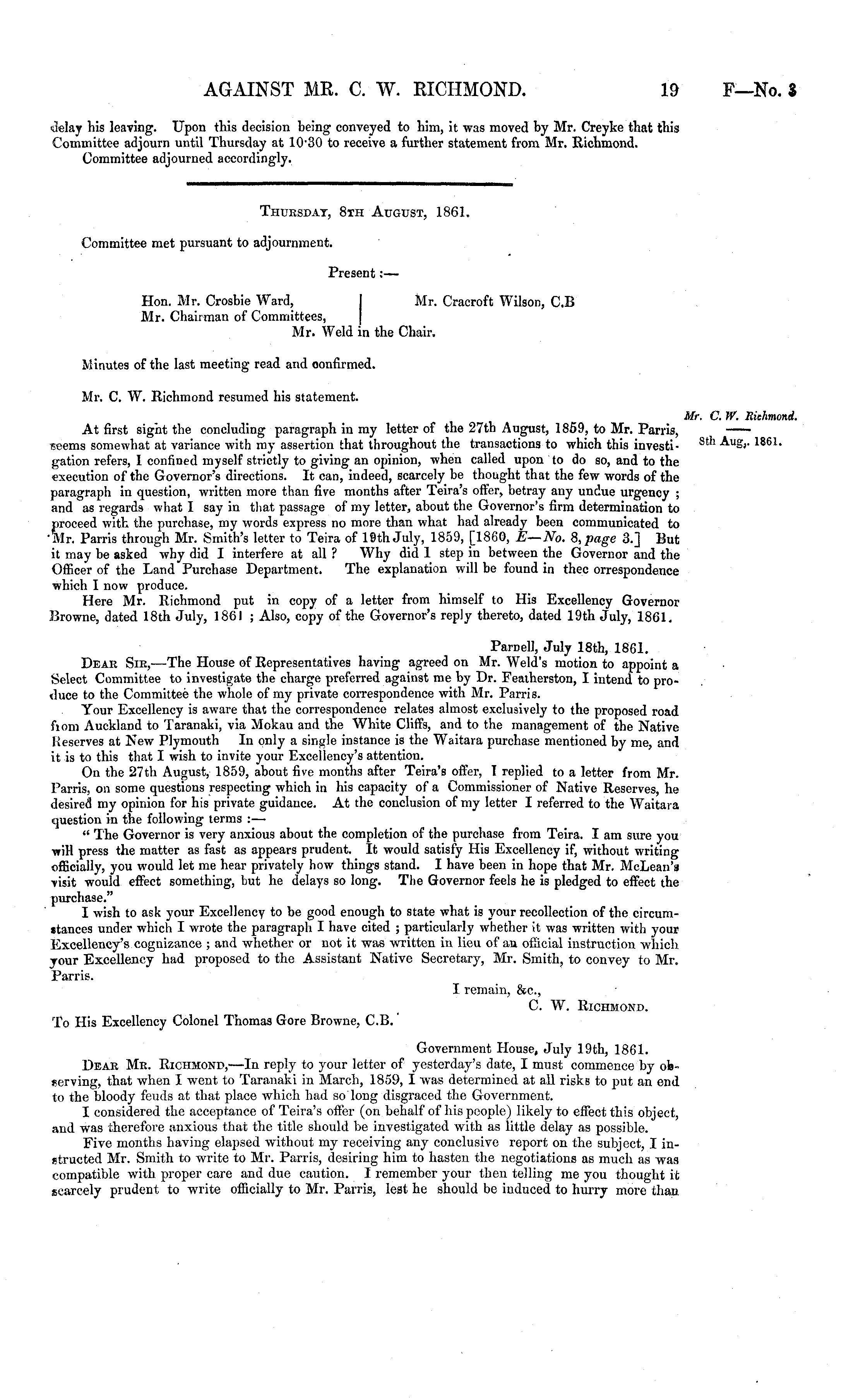 Thursday, Bth August, 1861. Committee met pursuant to adjournment. Present:— Hon. Mr. Crosbie Ward, Mr. Cracroft Wilson, C.B Mr. Chairman of Committees, Mr. Weld in the Chair. Minutes of the last meeting read and oonfirmed. Mr. C. W. Richmond resumed his statement. At first sight the concluding paragraph in my letter of the 27th August, 1859, to Mr. Parris, seems somewhat at variance with my assertion that throughout the transactions to which this investigation refers, I confined myself strictly to giving an opinion, when called upon to do so, and to the execution of the Governor's directions. It can, indeed, scarcely be thought that the few words of the paragraph in question, written more than five months after Teira's offer, betray any undue urgency ; and as regards what I say in that passage of my letter, about the Governor's firm determination to proceed with the purchase, my words express no more than what had already been communicated to •Mr. Parris through Mr. Smith's letter to Teira of 19th July, 1859, [1860, E—No. B,page 3.] But it may be asked why did I interfere at all ? Why did 1 step in between the Governor and the Officer of the Land Purchase Department. The explanation will be found in thee orrespondence which I now produce. Here Mr. Richmond put in copy of a letter from himself to His Excellency Governor Browne, dated 18th July, 1861 ; Also, copy of the Governor's reply thereto, dated 19th July, 1861. PameD, July 18th, 1861. Dear Sir,—The House of Representatives having agreed on Mr. Weld's motion to appoint a Select Committee to investigate the charge preferred against me by Dr. Featherston, I intend to produce to the Committee the whole of my private correspondence with Mr. Parris. Your Excellency is aware that the correspondence relates almost exclusively to the proposed road fiom Auckland to Taranaki, via Mokau and the White Cliffs, and to the management of the Native Reserves at New Plymouth In only a single instance is the Waitara purchase mentioned by me, and it is to this that I wish to invite your Excellency's attention. On the 27th August, 1859, about five months after Teira's offer, I replied to a letter from Mr. Parris, on some questions respecting which in his capacity of a Commissioner of Native Reserves, he desired my opinion for his private guidance. At the conclusion of my letter I referred to the Waitara question in the following terms : — " The Governor is very anxious about the completion of the purchase from Teira. I am sure you •will press the matter as fast as appears prudent. It would satisfy His Excellency if, without writing officially, you would let me hear privately how things stand. I have been in hope that Mr. McLean's visit would effect something, but he delays so long. The Governor feels he is pledged to effect the purchase." I wish to ask your Excellency to be good enough to state what is your recollection of the circumttances under which I wrote the paragraph I have cited ; particularly whether it was written with your Excellency's cognizance ; and whether or not it was written in lieu of an official instruction which your Excellency had proposed to the Assistant Native Secretary, Mr. Smith, to convey to Mr. Parris. I remain, &c, C. W. Richmond. To His Excellency Colonel Thomas Gore Browne, C.B. Government House, July 19th, 1861. Dear Mr. Richmond, —In reply to your letter of yesterday's date, I must commence by observing, that when I went to Taranaki in March, 1859, I was determined at all riskis to put an end to the bloody feuds at that place which had so long disgraced the Government. I considered the acceptance of Teira's offer (on behalf of his people) likely to effect this object, and was therefore anxious that the title should be investigated with as little delay as possible. Five months having elapsed without my receiving any conclusive report on the subject, I instructed Mr. Smith to write to Mr. Parris, desiring him to hasten the negotiations as much as was compatible with proper care and due caution. I remember your then telling me you thought it scarcely prudent to write officially to Mr. Parris, lest he should be induced to hurry more than