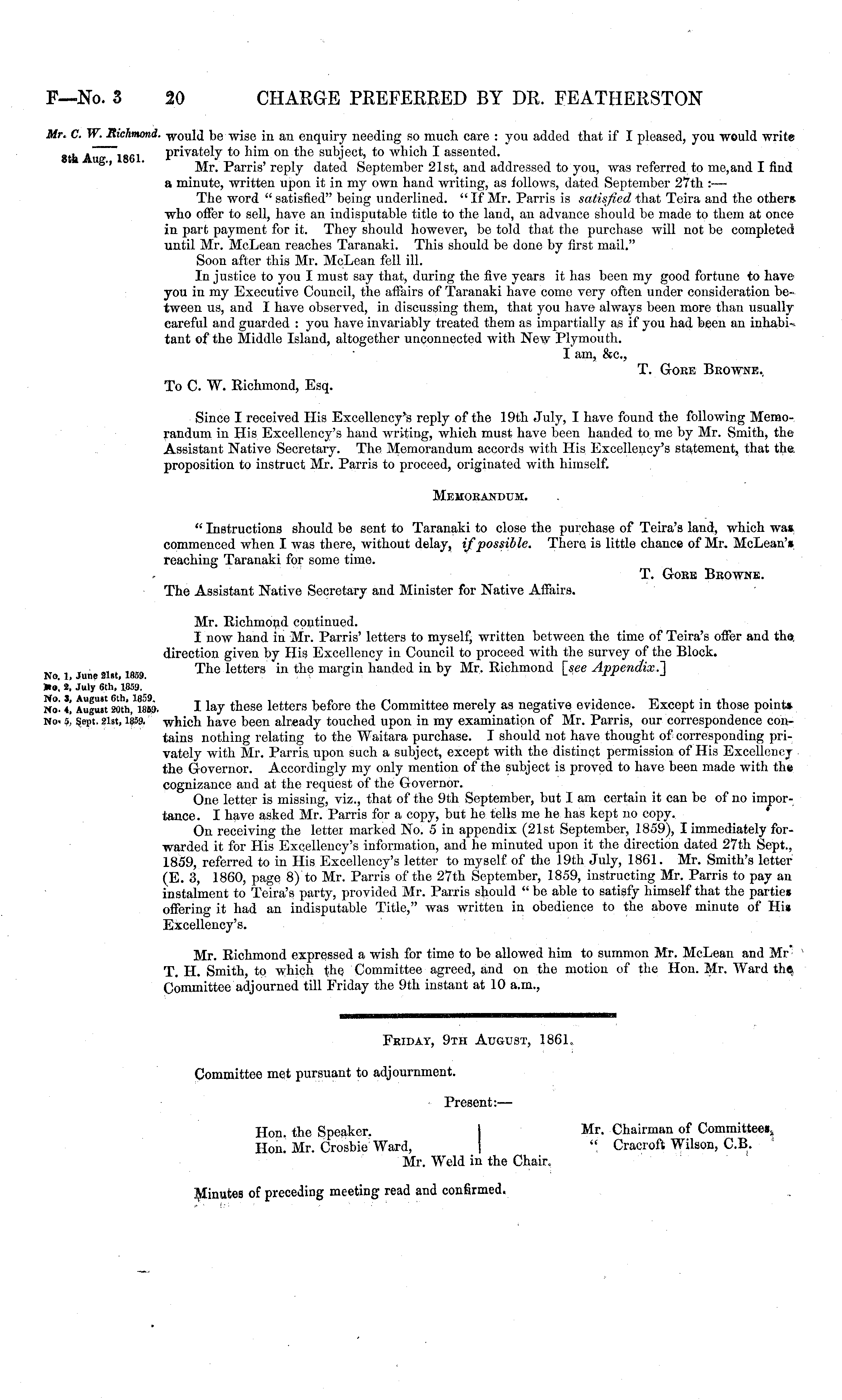 would be wise in an enquiry needing so much care : you added that if I pleased, you would write privately to him on the subject, to which I assented. Mr. Parris' reply dated September 21st, and addressed to you, was referred to me,and I find a minute, written upon it in my own hand writing, as follows, dated September 27th :— The word " satisfied" being underlined. "If Mr. Parris is satisfied that Teira and the others who offer to sell, have an indisputable title to the land, an advance should be made to them at once in part payment for it. They should however, be told that the purchase will not be completed until Mr. McLean reaches Taranaki. This should be done by first mail." Soon after this Mr. McLean fell ill. In justice to you I must say that, during the five years it has been my good fortune to have you in my Executive Council, the affairs of Taranaki have come very often under consideration between us, and I have observed, in discussing them, that you have always been more than usually careful and guarded : you have invariably treated them as impartially as if you had been an inhabit tant of the Middle Island, altogether unconnected with New Plymouth. I am, &c, T. Gore Browne. To C. W. Richmond, Esq. Since I received His reply of the 19th July, I have found the following Memorandum in His Excellency's hand writing, which must have been handed to me by Mr. Smith, the Assistant Native Secretary. The Memorandum accords with His Excellency's statement, that the. proposition to instruct Mr. Parris to proceed, originated with himself. Memorandum. " Instructions should be sent to Taranaki to close the purchase of Teira's land, which wa» commenced when I was there, without delay, if possible. There is little chance of Mr, McLean'* reaching Taranaki for some time. T. Gore Browne. The Assistant Native Secretary and Minister for Native Affairs. Mr. Richmond continued. I now hand in Mr. Parris' letters to myself, written between the time of Teira's offer and the. direction given by His Excellency in Council to proceed with the survey of the Block. The letters in the margin handed in by Mr, Richmond [see Appendix.] I lay these letters before the Committee merely as negative evidence. Except in those point* which have been already touched upon in my examination of Mr. Parris, our correspondence contains nothing relating to the Waitara purchase. I should not have thought of corresponding privately with Mr. Parris. upon such a subject, except with the distinct permission of His Excellency the Governor. Accordingly my only mention of the subject is proved to have been made with the cognizance and at the request of the Governor. One letter is missing, viz., that of the 9th September, but I am certain it can be of no importance. I have asked Mr. Parris for a copy, but he tells me he has kept no copy. On receiving the letter marked No. 5 in appendix (21st September, 1859), I immediately forwarded it for His Excellency's information, and he minuted upon it the direction dated 27th Sept., 1859, referred to in His Excellency's letter to myself of the 19th July, 1861. Mr. Smith's letter (E. 3, 1860, page 8) to Mr. Parris of the 27th September, 1859, instructing Mr. Parris to pay an instalment to Teira's party, provided Mr. Parris should " be able to satisfy himself that the parties offering it had an indisputable Title," was written in obedience to the above minute of His Excellency's. Mr. Richmond expressed a wish for time to be allowed him to summon Mr. McLean and Mr" T. H. Smith, to which the Committee agreed, and on the motion of the Hon. Mr. Ward ths Committee adjourned till Friday the 9th instant at 10 a.m.,