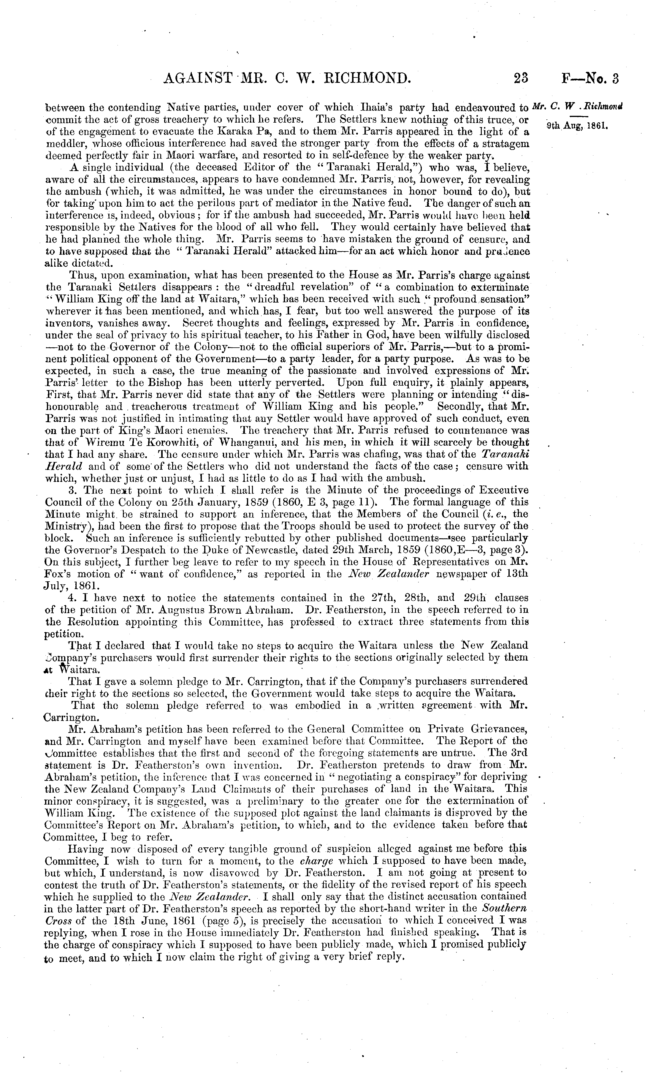 between the contending Native parties, under cover of which Ihaia's party had endeavoured to Mr, commit the act of gross treachery to which he refers. The Settlers knew nothing of this truce, or of the engagement to evacuate the Karaka Pa, and to them Mr. Parris appeared in the light of a meddler, whose officious interference had saved the stronger party from the effects of a stratagem deemed perfectly fair in Maori warfare, and resorted to in self-defence by the weaker party. A single individual (the deceased Editor of the " Taranaki Herald,") who was, I believe, aware of all the circumstances, appears to have condemned Mr. Parris, not, however, for revealing the ambush (which, it was admitted, he was under the circumstances in honor bound to do), but for taking'upon him to act the perilous part of mediator in the Native feud. The danger of such an interference is, indeed, obvious ; for if the ambush had succeeded, Mr. Parris would have been held responsible by the Natives for the blood of all who fell. They would certainly have believed that he had planned the whole thing. Mr. Parris seems to have mistaken the ground of censure, and to have supposed that the " Taranaki Herald" attacked him—for an act which honor and praJence alike dictated. Thus, upon examination, what has been presented to the House as Mr. Parris's charge against the Taranaki Settlers disappears : the " dreadful revelation" of " a combination to exterminate "William King off the land at Waitara," which has been received with such ." profound sensation" wherever it has been mentioned, and which has, I fear, but too well answered the purpose of its inventors, vanishes away. Secret thoughts and feelings, expressed by Mr. Parris in confidence, under the seal of privacy to his spiritual teacher, to his Father in God, have been wilfully disclosed —not to the Governor of the Colony—not to the official superiors of Mr. Parris, —but to a prominent political opponent of the Government —to a party leader, for a party purpose. As was to be expected, in such a case, the true meaning of the passionate and involved expressions of Mr, Parris' letter to the Bishop has been utterly perverted. Upon full enquiry, it plainly appears, First, that Mr. Parris never did state that any of the Settlers were planning or intending "dishonourable and treacherous treatmont of William King and his people." Secondly, that Mr. Parris was not justified in intimating that any Settler would have approved of such conduct, even on the part of King's Maori enemies. The treachery that Mr. Parris refused to countenance was that of Wiremu Te Korowhiti, of Whanganui, and his men, in which it will scarcely be thought that I had any share. The censure under which Mr, Parris was chafing, was that of the Taranaki Herald and of some of the Settlers who did not understand the facts of the case; censure with which, whether just or unjust, I had as little to do as I had with the ambush. 3. The next point to which I shall refer is the Minute of the proceedings of Executive Council of the Colony on 25th January, 1859 (1860, E3, page 11). The formal language of this Minute might be strained to support an inference, that the Members of the Council (i. c., the Ministry), had been the first to propose that the Troops should be used to protect the survey of the block. Such an inference is sufficiently rebutted by other published documents—'see particularly the Governor's Despatch to the Duke of Newcastle, dated 29th March, 1859 (1860,E- —3, page 3). On this subject, I further beg leave to refer to my speech in the House of Representatives on Mr, Fox's motion of " want of confidence," as reported in the New Zealander newspaper of 13th July, 1861. 4. I have next to notice the statements contained in the 27th, 28th, and 29th clauses of the petition of Mr. Augustus Brown Abraham. Dr. Featherston, in the speech referred to in the Resolution appointing this Committee, has professed to extract three statements from this petition. That I declared that I would take no steps to acquire the Waitara unless the New Zealand Company's purchasers would first surrender their rights to the sections originally selected by them M Waitara. That I gave a solemn pledge to Mr. Carrington, that if the Company's purchasers surrendered their right to the sections so selected, the Government would take steps to acquire the Waitara. That the solemn pledge referred to was embodied in a .written agreement with Mr. Carrington. Mr. Abraham's petition has been referred to the General Committee on Private Grievances, and Mr. Carrington and myself have been examined before that Committee. The Report of the \Jommittee establishes that the first and second of the foregoing statements are untrue. The 3rd statement is Dr. Featherston's own invention. Dr. Featherston pretends to draw from Mr. Abraham's petition, the inference that I was concerned in " negotiating a conspiracy" for depriving • the New Zealand Company's Land Claimants of their purchases of land in the Waitara. This minor conspiracy, it is suggested, was a preliminary to the greater one for the extermination of William King. The existence of the supposed plot against the land claimants is disproved by the Committee's Report on Mr. Abraham's petition, to which, and to the evidence taken before that Committee, I beg to refer. Having now disposed of every tangible ground of suspicion alleged against me before this Committee, I wish to turn for a moment, to the charge which I supposed to have been made, but which, I understand, is now disavowed by Dr. Featherston. I am not going at present to contest the truth of Dr. Featherston's statements, or the fidelity of the revised report of his speech which ho supplied to the New Zealander. I shall only say that the distinct accusation contained in the latter part of Dr. Featherston's speech as reported by the short-hand writer in the Southern Cross of the 18th June, 1861 (page 5), is precisely the
