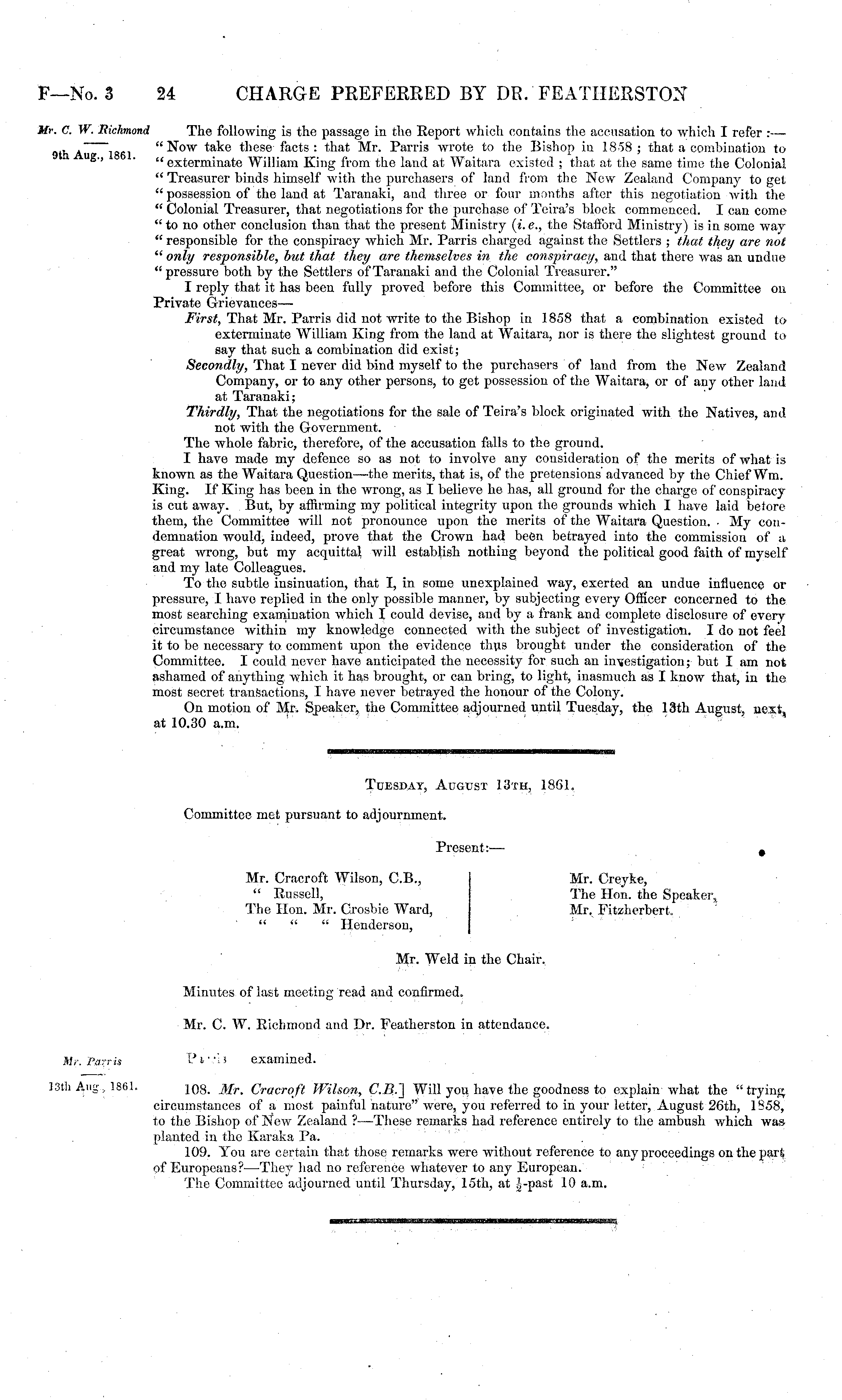 Tuesday, August 13th, 1861. Committee met pursuant to adjournment. Present:— Mr. Cracroft Wilson, C.8., Mr. Creyke, " Russell, The Hon. the Speaker, The Hon. Mr. Crosbie Ward, Mr, Fitzherbert. " " " Henderson, Mr. Weld in the Chair. Minutes of last meeting read and confirmed. Mr. C. W. Richmond and Dr. Featherston in attendance. Pk'.'h examined.