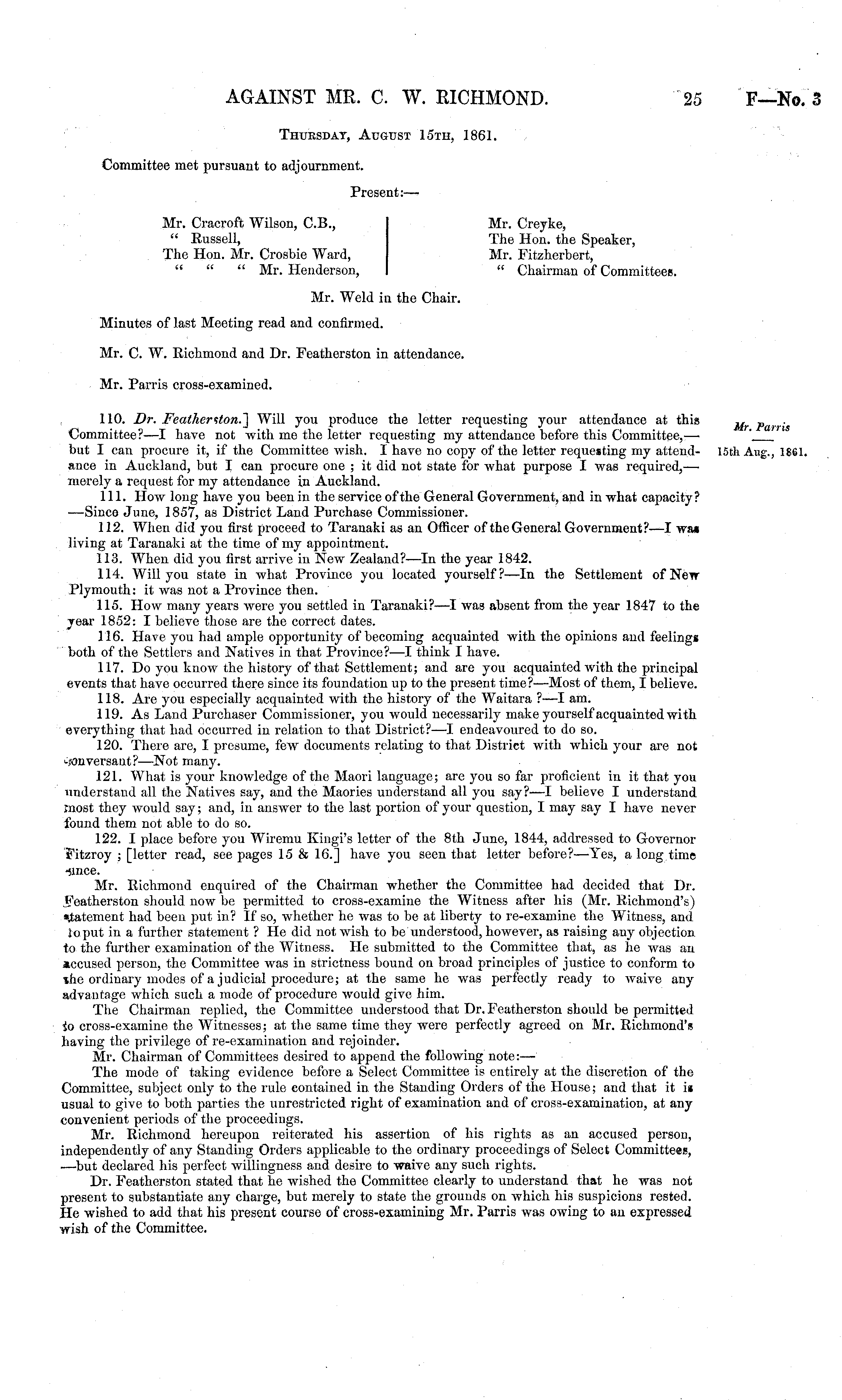 Thursday, August 15th, 1861. Committee met pursuant to adjournment. Present: — Mr. Cracroft Wilson, C.8., Mr. Creyke, " Russell, The Hon. the Speaker, The Hon. Mr. Crosbie W T ard, Mr. Fitzherbert, " " " Mr. Henderson, " Chairman of Committees. Mr. Weld in the Chair. Minutes of last Meeting read and confirmed. Mr. C. W. Richmond and Dr. Featherston in attendance. Mr. Parris cross-examined. 110. Dr. Feather<ston.] Will you produce the letter requesting your attendance at this Committee?—l have not with me the letter requesting my attendance before this Committee, — but I can procure it, if the Committee wish. I have no copy of the letter requesting my attendance in Auckland, but I can procure one ; it did not state for what purpose I was required,— merely a request for my attendance in Auckland. 111. How long have you been in the service of the General Government, and in what capacity? —Since June, 1857, as District Land Purchase Commissioner. 112. When did you first proceed to Taranaki as an Officer of the General Government?—l was living at Taranaki at the time of my appointment. 113. When did you first arrive in New Zealand?—ln the year 1842. 114. Will you state in what Province you located yourself? —In the Settlement of NewPlymouth: it was not a Province then. 115. How many years were you settled in Taranaki? —I was absent from the year 1847 to the year 1852: I believe those are the correct dates. 116. Have you had ample opportunity of becoming acquainted with the opinions and feelings both of the Settlers and Natives in that Province? —I think I have. 117. Do you know the history of that Settlement; and are you acquainted with the principal events that have occurred there since its foundation up to the present time?— Most of them, I believe. 118. Are you especially acquainted with the history of the Waitara ?—I am. 119. As Land Purchaser Commissioner, you would necessarily make yourself acquainted with everything that had occurred in relation to that District? —I endeavoured to do so. 120. There are, I presume, few documents relating to that District with which your are not —Not many. 121. What is your knowledge of the Maori language; are you so far proficient in it that you understand all the Natives say, and the Maories understand all you say?—l believe I understand most they would say; and, in answer to the last portion of your question, I may say I have never found them not able to do so. 122. I place before you Wiremu Kingi's letter of the Bth June, 1844, addressed to Governor Fitzroy ; [letter read, see pages 15 & 16.] have you seen that letter before?— Yes, a long time ■jmce. Mr. Richmond enquired of the Chairman whether the Committee had decided that Dr. Featherston should now be permitted to cross-examine the Witness after his (Mr. Richmond's) •tatement had been put in? If so, whether he was to be at liberty to re-examine the Witness, and loput in a further statement ? He did not wish to be understood, however, as raising any objection to the further examination of the Witness. He submitted to the Committee that, as he was an accused person, the Committee was in strictness bound on broad principles of justice to conform to *he ordinary modes of a judicial procedure; at the same he was perfectly ready to waive any advantage which such a mode of procedure would give him. The Chairman replied, the Committee understood that Dr. Featherston should be permitted io cross-examine the Witnesses; at the same time they were perfectly agreed on Mr. Richmond's having the privilege of re-examination and rejoinder. Mr. Chairman of Committees desired to append the following note: — The mode of taking evidence before a Select Committee is entirely at the discretion of the Committee, subject only to the rule contained in. the Standing Orders of the House; and that it is usual to give to both parties the unrestricted right of examination and of cross-examination, at any convenient periods of the proceedings. Mr. Richmond hereupon reiterated his assertion of his rights as an accused person, independently of any Standing Orders applicable to the ordinary proceedings of Select Committees, —but declared his perfect willingness and desire to waive any such rights. Dr. Featherston stated that he wished the Committee clearly to understand that he was not present to substantiate any charge, but merely to state the grounds on which his suspicions rested. He wished to add that his present course of cross-examining Mr. Parris was owing to an expressed wish of the Committee.
