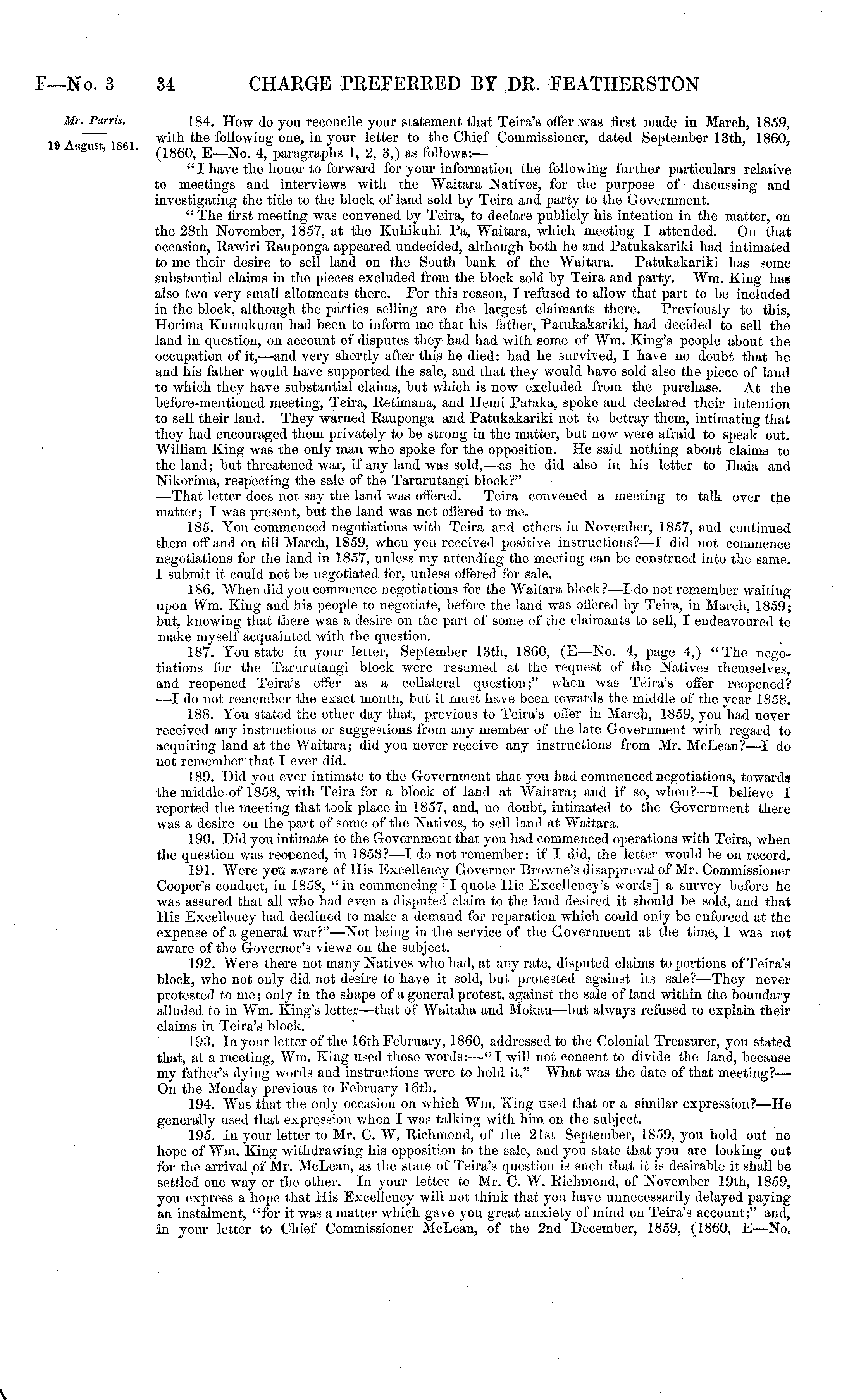 184. How do you reconcile your statement that Teira's offer was first made in March, 1859, with the following one, in your letter to the Chief Commissioner, dated September 13th, 1860, (1860, E—No. 4, paragraphs 1, 2, 3,) as follows:— " I have the honor to forward for your information the following further particulars relative to meetings and interviews with the Waitara Natives, for the purpose of discussing and investigating the title to the block of land sold by Teira and party to the Government. " The first meeting was convened by Teira, to declare publicly his intention in the matter, on the 28th November, 1857, at the Kuhikuhi Pa, Waitara, which meeting I attended. On that occasion, Rawiri Rauponga appeared undecided, although both ho and Patukakariki had intimated to me their desire to sell land, on the South bank of the Waitara. Patukakariki has some substantial claims in the pieces excluded from the block sold by Teira and party. Wm. King has also two very small allotments there. For this reason, I refused to allow that part to be included in the block, although the parties selling are the largest claimants there. Previously to this, Horima Kumukumu had been to inform me that his father, Patukakariki, had decided to sell the land in question, on account of disputes they had had with some of Wm. King's people about the occupation of it, —and very shortly after this he died: had he survived, I have no doubt that he and his father would have supported the sale, and that they would have sold also the piece of land to which they have substantial claims, but which is now excluded from the purchase. At the before-mentioned meeting, Teira, Retimana, and Hemi Pataka, spoke and declared their intention to sell their land. They warned Rauponga and Patukakariki not to betray them, intimating that they had encouraged them privately to be strong in the matter, but now were afraid to speak out. William King was the only man who spoke for the opposition. He said nothing about claims to the land; but threatened war, if any land was sold, —as he did also in his letter to Ihaia and Nikorima, respecting the sale of the Tarurutangi block?" -—That letter does not say the land was offered. Teira convened a meeting to talk over the matter; I was present, but the land was not offered to me. 185. You commenced negotiations with Teira and others in November, 1857, and continued them off and on till March, 1859, when you received positive instructions? —I did not commence negotiations for the land in 1857, unless my attending the meeting can be construed into the same. I submit it could not be negotiated for, unless offered for sale. 186. When did you commence negotiations for the Waitara block?—l do not remember waiting upon Wm. King and his people to negotiate, before the land was offered by Teira, in March, 1859; but, knowing that there was a desire on the part of some of the claimants to sell, I endeavoured to make myself acquainted with the question. 187. You state in your letter, September 13th, 1860, (E —No. 4, page 4,) "The negotiations for the Tarurutangi block were resumed at the request of the Natives themselves, and reopened Teira's offer as a collateral question;" when was Teira's offer reopened? —I do not remember the exact month, but it must have been towards the middle of the year 1858. 188. You stated the other day that, previous to Teira's offer in March, 1859, you had never received any instructions or suggestions from any member of the late Government with regard to acquiring land at the W T aitara; did you never receive any instructions from Mr. McLean?—l do not remember that I ever did. 189. Did you ever intimate to the Government that you had commenced negotiations, towards the middle of 1858, with Teira for a block of land at Waitara; and if so, when?—l believe I reported the meeting that took place in 1857, and, no doubt, intimated to the Government there was a desire on the part of some of the Natives, to sell land at Waitara. 190. Did you intimate to the Government that you had commenced operations with Teira, when the question was reopened, in 1858? —I do not remember: if I did, the letter would be on record. 191. Were yoci aware of His Excellency Governor Browne's disapproval of Mr. Commissioner Cooper's conduct, in 1858, "in commencing [I quote His Excellency's words] a survey before he was assured that all who had even a disputed claim to the land desired it should be sold, and that His Excellency had declined to make a demand for reparation which could only be enforced at the expense of a general war?" —Not being in the service of the Government at the time, I was not aware of the Governor's views on the subject. 192. Were there not many Natives who had, at any rate, disputed claims to portions of Teira's block, who not only did not desire to have it sold, but protested against its sale?— They never protested to me; only in the shape of a general protest, against the sale of land within the boundary alluded to in Wm. King's letter—that of Waitaha and Mokau —but always refused to explain their claims in Teira's block. 193. In your letter of the 16th February, 1860, addressed to the Colonial Treasurer, you stated that, at a meeting, Wm. King used those words:—"l will not consent to divide the land, because my father's dying words and instructions were to hold it." What was the date of that meeting?— • On the Monday previous to February 16th. 194. Was that the only occasion on which Wm. King used that or a similar expression?—He generally used that expression when I was talking with him on the subject. 195. In your letter to Mr. C. W, Richmond, of the 21st September, 1859, you hold out no hope of Wm. King withdrawing his opposition to the sale, and you state that you are looking out for the arrival of Mr. McLean, as the state of Teira's question is such that it is desirable it shall be settled one way or the other. In your letter to Mr. C.