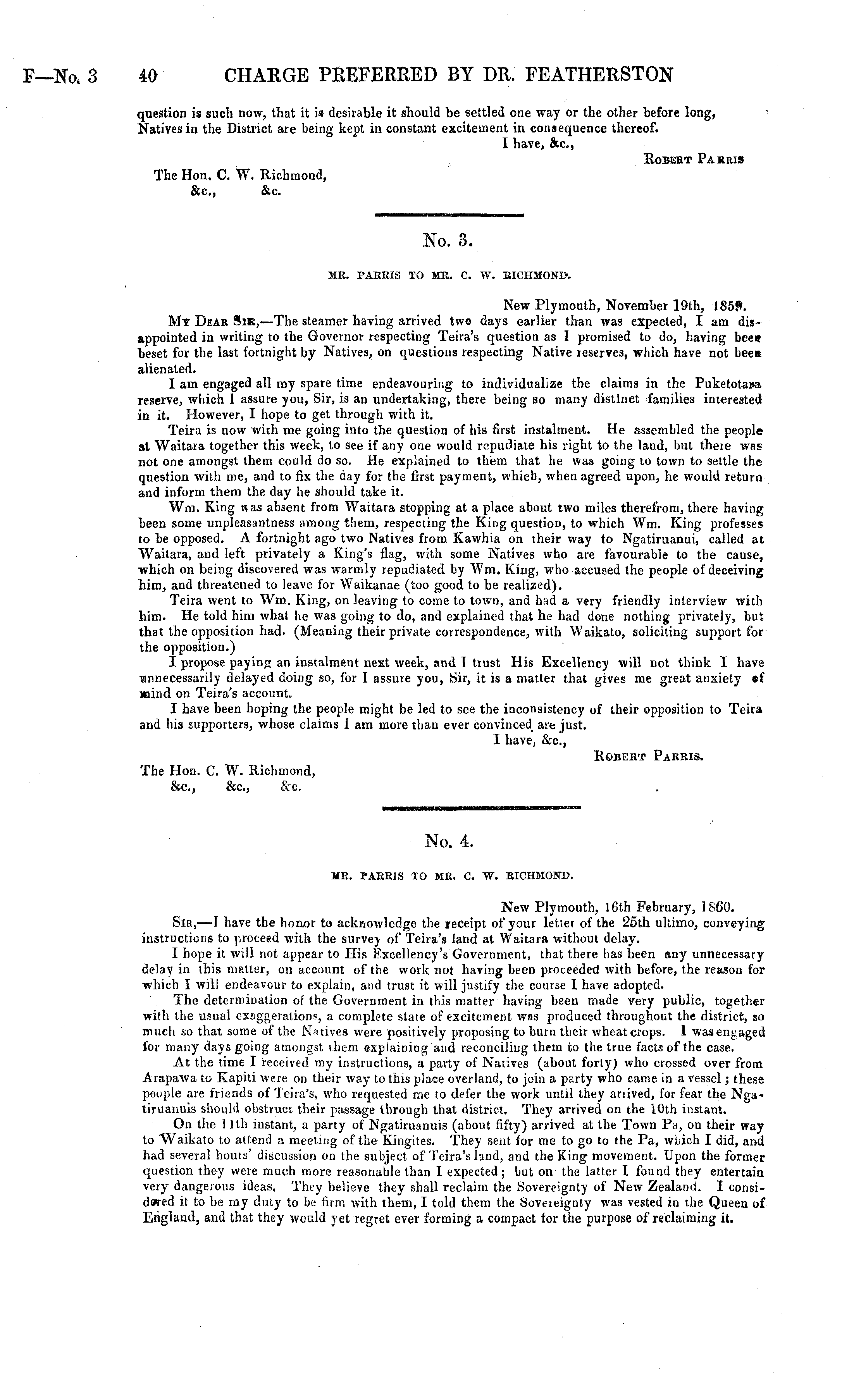 No. 4. ME. PAEEIS TO ME. C. W. EICHMOND. New Plymouth, 16th February, 1860. Sir, —I have the honor to acknowledge the receipt of your lettet of the 25th ultimo, conveying instructions to proceed with the survey of Teira's land at Waitara without delay. I hope it will not appear to His Excellency's Government, that there has been any unnecessary delay in this matter, on account of the work not having been proceeded with before, the reason for which I will endeavour to explain, and trust it will justify the course I have adopted. The determination of the Government in this matter having been made very public, together with the usual exsggeration?, a complete state of excitement was produced throughout the district, so much so that some of the Natives were positively proposing to burn their wheat crops. 1 was engaged for many days going amongst them explaining and reconciling them to the true facts of the case. At the time I received my instructions, a party of Natives (about forty) who crossed over from Arapawa to Kapiti were on their way to this place overland, to join a party who came in a vessel; these people are friends of Teira's, who requested me to defer the work until they arrived, for fear the Ngatiruanuis should obstruct their passage through that district. They arrived on the 10th instant. On the 11th instant, a party of Ngatiruanuis (about fifty) arrived at the Town Pa, on their way to Waikato to attend a meeting of the Kingites. They sent for me to go to the Pa, which I did, and had several hours' discussioa on the subject of Teira's land, and the King movement. Upon the former question they were much more reasonable than I expected ; but on the latter I found they entertain very dangerous ideas. They believe they shall reclaim the Sovereignty of New Zealand. I considered it to be my duty to be firm with them, I told them the Soveieignty was vested in the Queen of England, and that they would yet regret ever forming a compact for the purpose of reclaiming it.