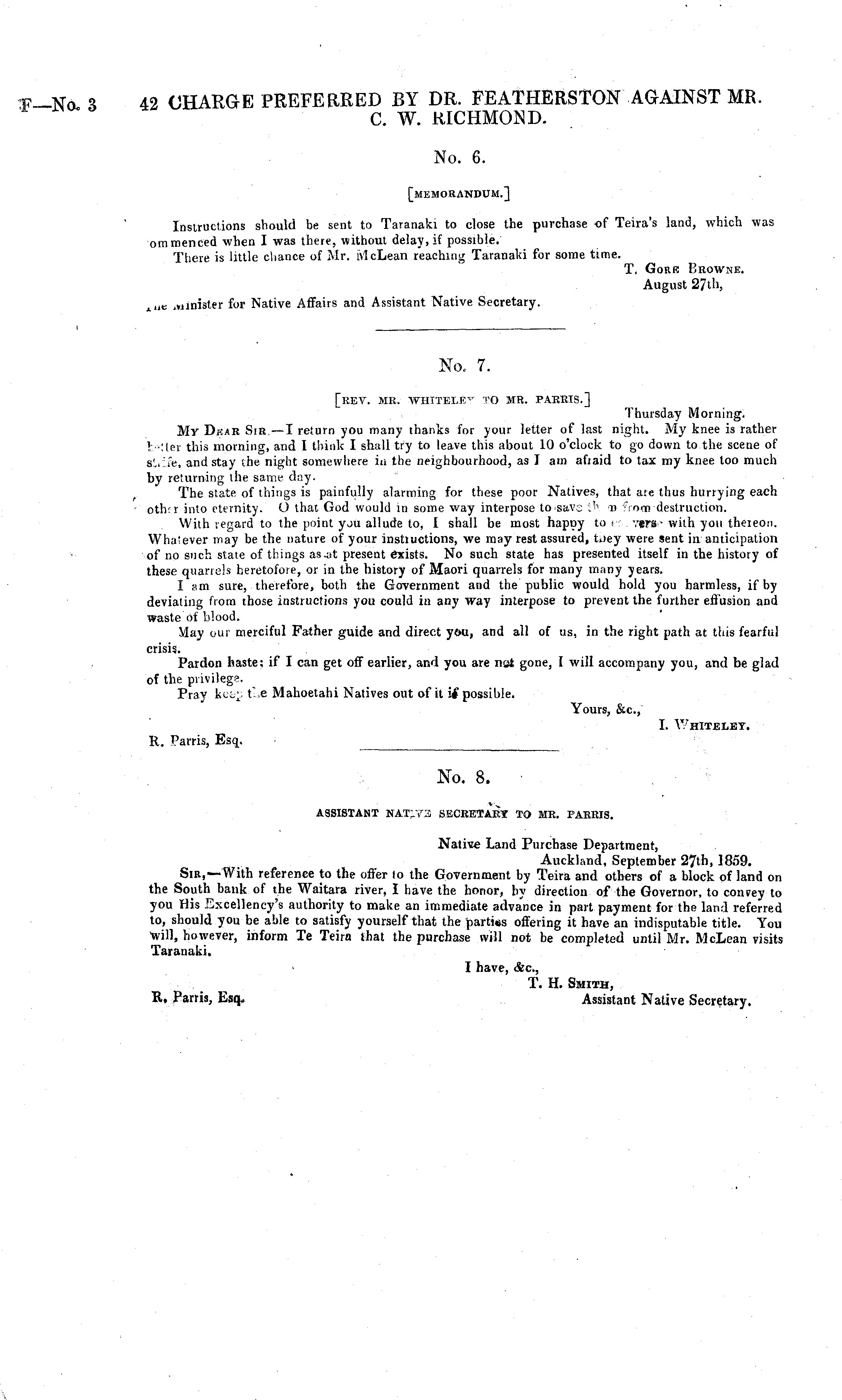 No. 8. ASSISTANT NATJ.TE SECEETAEY TO ME. PAEEIS. Native Land Purchase Department, Auckland, September 27th, 1859. Sir,—With reference to the offer to the Government by Teira and others of a block of land on the South bank of the Waitara river, I have the honor, by direction of the Governor, to convey to you His Excellency's authority to make an immediate advance in part payment for the land referred to, should you be able to satisfy yourself that the partks offering it have an indisputable title. You Will, however, inform Te Teira that the purchase will not be completed until Mr. McLean visits Taranaki. I have, &c, T. H. Smith, R. Parris, Esq. Assistant Native Secretary.