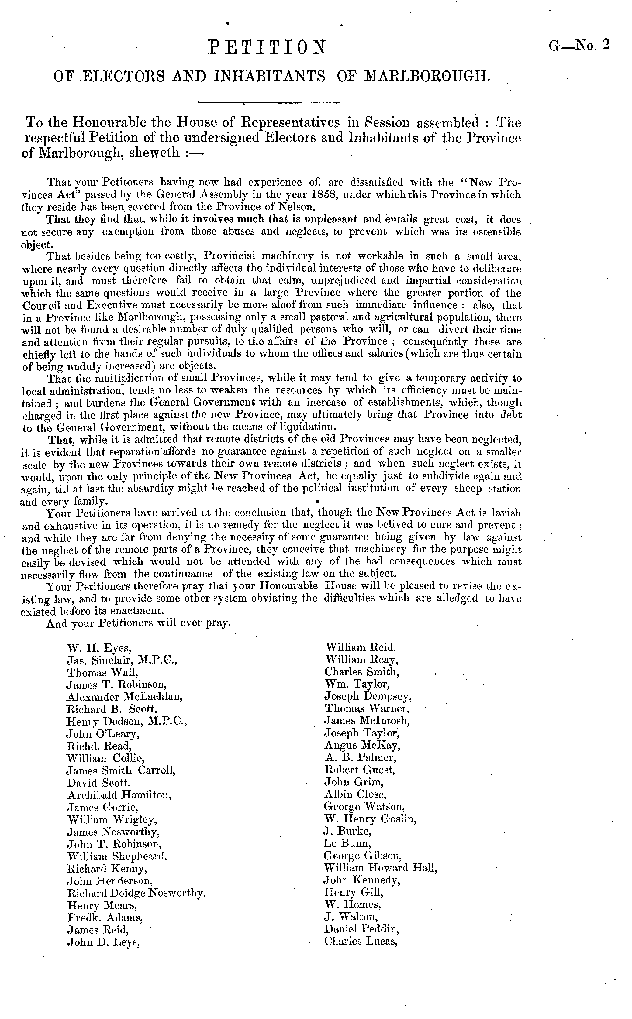 To the Honourable the House of Representatives in Session assembled : The respectful Petition of the undersigned Electors and Inhabitants of the Province of Marlborough, sheweth : — That your Petitoners having now had experience of, are dissatisfied with the " New Provinces Act" passed by the General Assembly in the year 1858, under which this Province in which they reside has been severed from the Province of Nelson. That they find that, while it involves much that is unpleasant and entails great cost, it does not secure any exemption from those abuses and neglects, to prevent which was its ostensible object. That besides being too coetly, Provincial machinery is not workable in such a small area, where nearly every question directly affects the individual interests of those who have to deliberate upon it, and must therefore fail to obtain that calm, unprejudiced and impartial consideration which the same questions would receive in a large Province where the greater portion of the Council and Executive must necessarily be more aloof from such immediate influence : also, that in a Province like Marlborough, possessing only a small pastoral and agricultural population, there will not be found a desirable number of duly qualified persons who will, or can divert their time and attention from their regular pursuits, to the affairs of the Province ; consequently these are chiefly left to the hands of such individuals to whom the offices and salaries (which are thus certain. of being unduly increased) are objects. That the multiplication of small Provinces, while it may tend to give a temporary activity to local administration, tends no less to weaken the resources by which its efficiency must be maintained ; and burdens the General Government with an increase of establishments, which, though charged in the first place against the new Province, may ultimately bring that Province into debt to the General Government, without the means of liquidation. That, while it is admitted that remote districts of the old Provinces may have been neglected, it is evident that separation affords no guarantee against a repetition of such neglect on a smaller scale by the new Provinces towards their own remote districts ; and when such neglect exists, it would, upon the only principle of the New Provinces Act, be equally just to subdivide again and till at last the absurdity might be reached of the political institution of every sheep station and every family. • Your Petitioners have arrived at the conclusion that, though the New Provinces Act is lavish and exhaustive in its operation, it is no remedy for the neglect it was belived to cure and prevent ; and while they are far from denying the necessity of some guarantee being given by law against the neglect of the remote parts of a Province, they conceive that machinery for the purpose might easily be devised which would not be attended with any of the bad consequences which must necessarily flow from the continuance of the existing law on the subject. Your Petitioners therefore pray that your Honourable House will be pleased to revise the existing law, and to provide some other system obviating the difficulties which are alledged to have existed before its enactment. And your Petitioners will ever pray. W. H. Eyes, William Eeid, Jas. Sinclair, M.P.C., William Eeay, Thomas Wall, Charles Smith, James T. Robinson, Wm. Taylor, Alexander McLachlan, Joseph Dempsey, Eichard B. Scott, Thomas Warner, Henry Dodson, M.P.C., James Mclntosh, John O'Leary, Joseph Taylor, Eichd. Eead, Angus McKay, William Collie, A. B. Palmer, James Smith Carroll, Eobert Guest, David Scott, John Grim, Archibald Hamilton, Albin Close, James Gorrie, George Watson, William Wrigley, W. Henry Goslin, James Nosworthy, . J. Burke, John T. Eobinson, Le Bunn, William Shepheard, George Gibson, Eichard Kenny, William Howard Hall, John Henderson, John Kennedy, Eichard Doidge Nosworthy, Henry Gill, Henry Mears, W. Homes, Fredk. Adams, J. Walton, James Eeid, Daniel Peddin, John D. Leys, Charles Lucas,