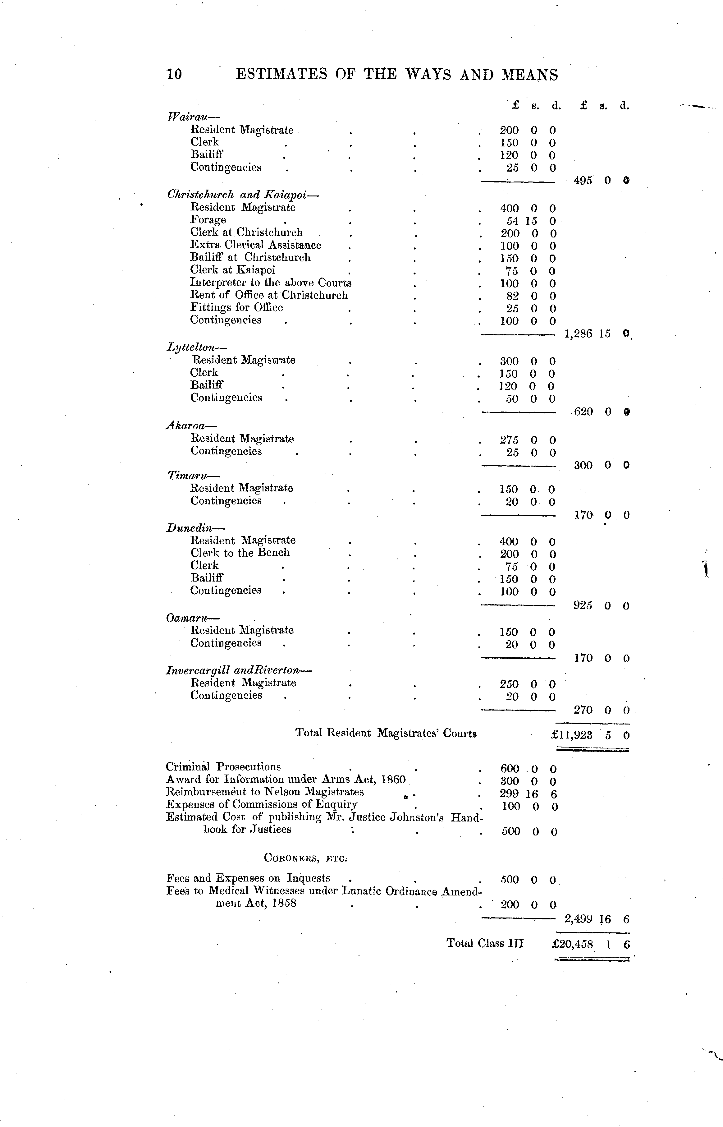 £ s. d. £ s. d. Wairau — Resident Magistrate . . . 200 0 0 Clerk . . . 150 0 0 Bailiff . . . 120 0 0 Contingencies . . . 25 0 0 495 0 © Christchurch and Kaiapoi — Resident Magistrate . . . 400 0 0 Forage . . . . 54 15 0 Clerk at Christchurch . . . 200 0 0 Extra Clerical Assistance . . 100 0 0 Bailiff at Christchurch . . 150 0 0 Clerk at Kaiapoi . . 75 0 0 Interpreter to the above Courts . 100 0 0 Rent of Office at Christchurch . 82 0 0 Fittings for Office . . 25 0 0 Contingencies . . . 100 0 0 1,286 15 0 Lyttelton — Resident Magistrate . . . 300 0 0 Clerk . . . 150 0 0 Bailiff . . . 120 0 0 Contingencies . . . . 50 0 0 620 0 9 Akaroa —■ Resident Magistrate . . . 275 0 0 Contingencies . . . 25 0 0 300 0 0 Timaru — Resident Magistrate . . 150 0 0 Contingencies . . . 20 0 0 170 0 0 Dunedin — Resident Magistrate . . . 400 0 0 Clerk to the Bench . . . 200 0 0 Clerk . . . 75 0 0 Bailiff . . . 150 0 0 Contingencies . . . . 100 0 0 925 o 0 Oarnaru — Resident Magistrate . . . 150 0 0 Contingencies . . . ' . 20 0 0 170 0 0 Invercargill andßiverton — Resident Magistrate . . . 250 0 0 Contingencies . . . 20 0 0 270 0 0 Total Resident Magistrates' Courts £11,923 5 0 Criminal Prosecutions . . . 600 0 0 Award for Information under Arms Act, 1860 . 300 0 0 Reimbursement to Nelson Magistrates . . 299 16 6 Expenses of Commissions of Enquiry . _ 100 0 0 Estimated Cost of publishing Mr. Justice Johnston's Handbook for Justices '. . . 500 0 0 Coroners, etc Fees and Expenses on Inquests . . . 500 0 0 Fees to Medical Witnesses under Lunatic Ordinance Amendment Act, 1858 . . . 200 0 0 — 2,499 16 6 Total Class 111 £20,458 1 6