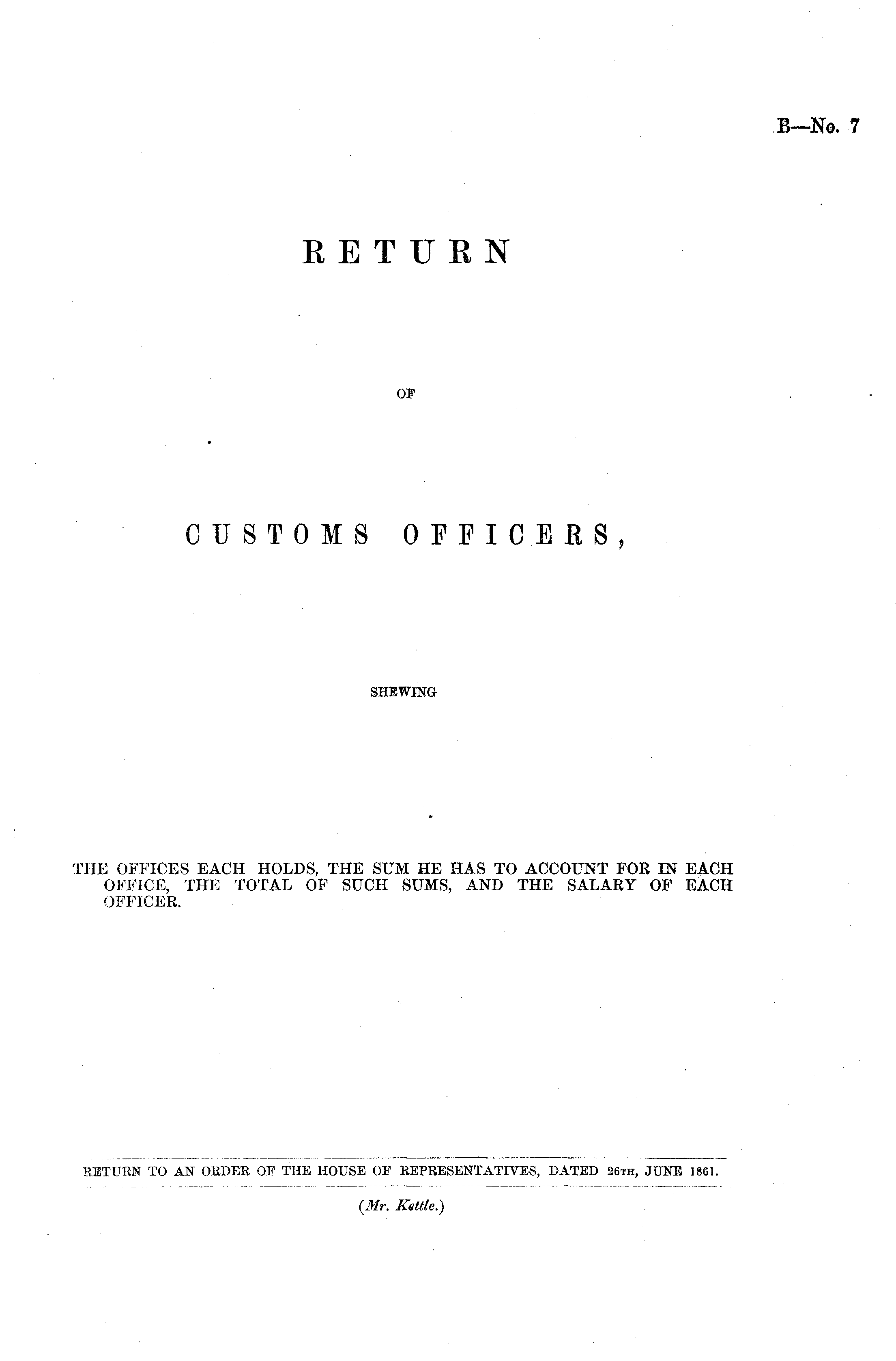 RETURN OF CUSTOMS OFFICERS, SHEWING THE OFFICES EACH HOLDS, THE SUM HE HAS TO ACCOUNT FOR IN EACH OFFICE, THE TOTAL OF SUCH SUMS, AND THE SALARY OF EACH OFFICER.