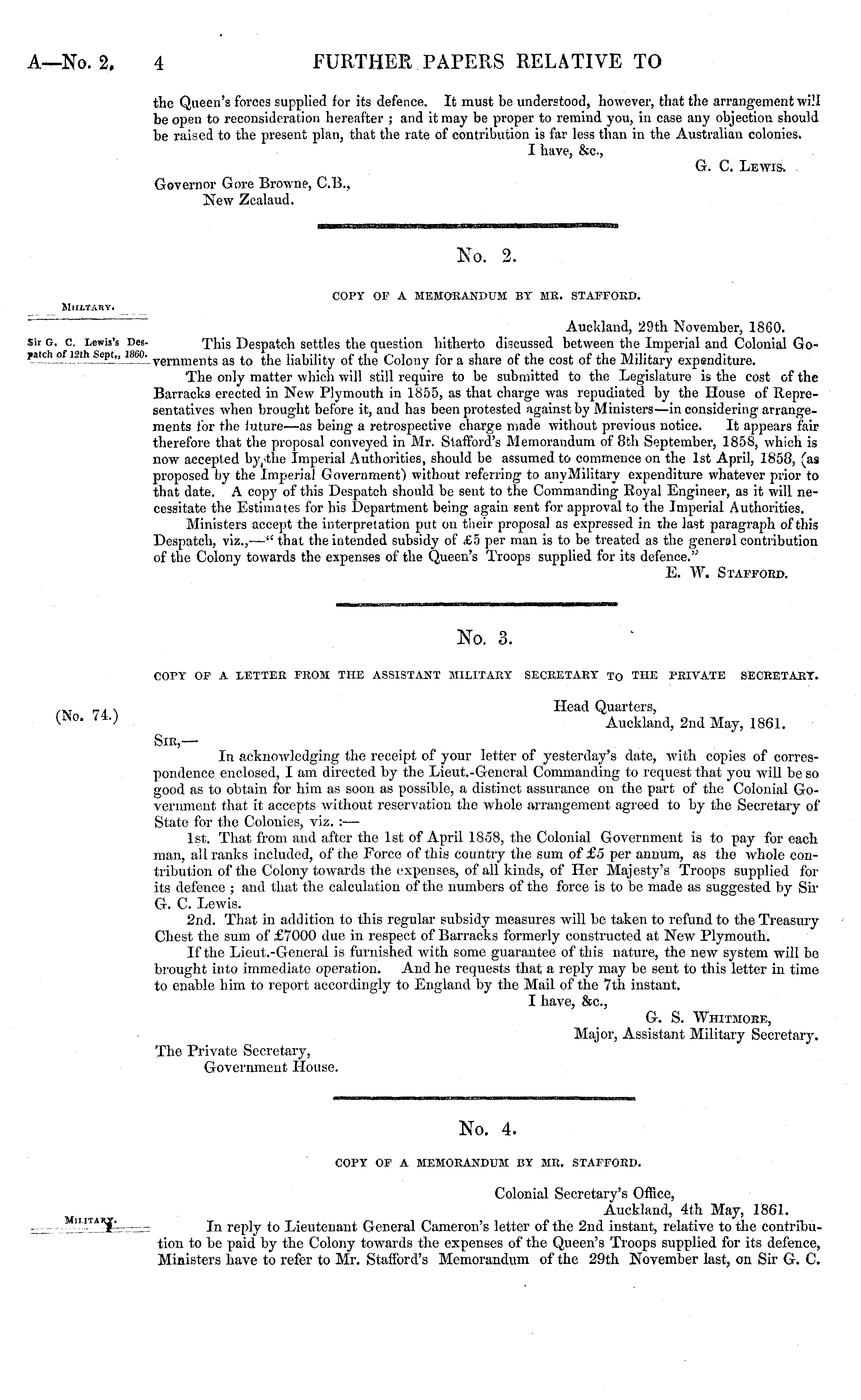 No. 4. COPY OF A MEMORANDUM BY MR. STAFFOED. Colonial Secretary's Office, Auckland, 4th May, 1861. In reply to Lieutenant General Cameron's letter of the 2nd instant, relative to the contribution to be paid by the Colony towards the expenses of the Queen's Troops supplied for its defence, Ministers have to refer to Mr. Stafford's Memorandum of the 29th November last, on Sir G. C.