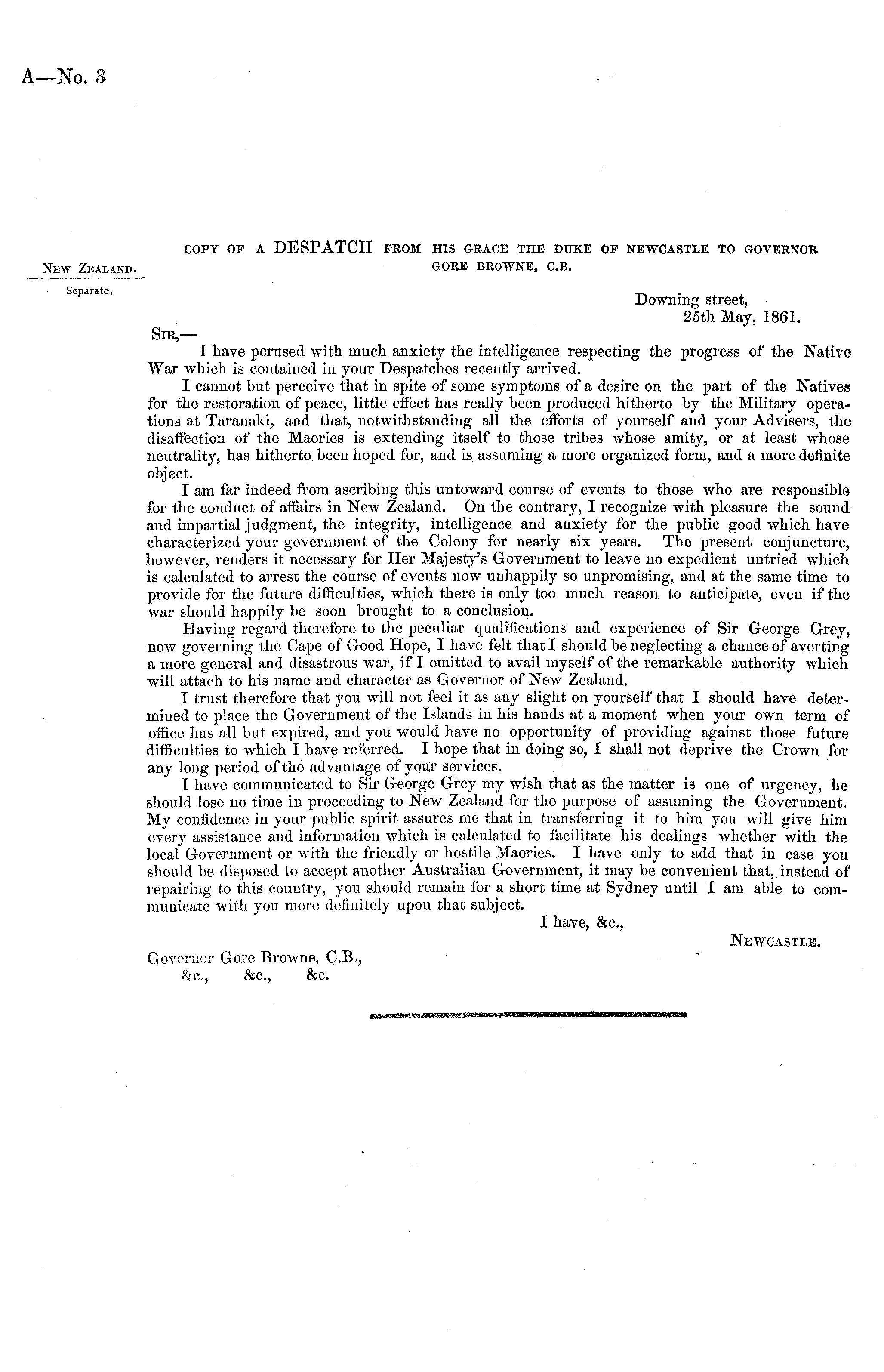 copy of a DESPATCH from his grace the duke of Newcastle to governor GOEE BROWNE, C.B. Downing street, 25th May, 1861. Sir,— I have perused with much anxiety the intelligence respecting the progress of the Native War which is contained in your Despatches recently arrived. I cannot but perceive that in spite of some symptoms of a desire on the part of the Natives for the restoration of peace, little effect has really been produced hitherto by the Military operations at Taranaki, and that, notwithstanding all the efforts of yourself and your Advisers, the disaffection of the Maories is extending itself to those tribes whose amity, or at least whose neutrality, has hitherto been hoped for, and is assuming a more organized form, and a more definite object. I am far indeed from ascribing this untoward course of events to those who are responsible for the conduct of affairs in New Zealand. On the contrary, I recognize with pleasure the sound and impartial judgment, the integrity, intelligence and auxiety for the public good which have characterized your government of the Colony for nearly six years. The present conjuncture, however, renders it necessary for Her Majesty's Government to leave no expedient untried which is calculated to arrest the course of events now unhappily so unpromising, and at the same time to provide for the future difficulties, which there is only too much reason to anticipate, even if the war should happily be soon brought to a conclusion. Having regard therefore to the peculiar qualifications and experience of Sir George Grey, now governing the Cape of Good Hope, I have felt that I should be neglecting a chance of averting a more general and disastrous war, if I omitted to avail myself of the remarkable authority which will attach to his name and character as Governor of New Zealand. I trust therefore that you will not feel it as any slight on yourself that I should have determined to place the Government of the Islands in his hands at a moment when your own term of office has all but expired, and you would have no opportunity of providing against those future difficulties to which I have referred. I hope that in doing so, I shall not deprive the Crown for any long period of the advantage of your services. I have communicated to Sir George Grey my wish that as the matter is one of urgency, he should lose no time in proceeding to New Zealand for the purpose of assuming the Government. My confidence in your public spirit assures me that in transferring it to him you will give him every assistance and information which is calculated to facilitate his dealings whether with the local Government or with the friendly or hostile Maories. I have only to add that in case you should be disposed to accept another Australian Government, it may be convenient that, instead of repairing to this country, you should remain for a short time at Sydney until I am able to communicate with you more definitely upou that subject. I have, &c, Newcastle. Governor Gore Browne, C.B , &c, &c, &c.