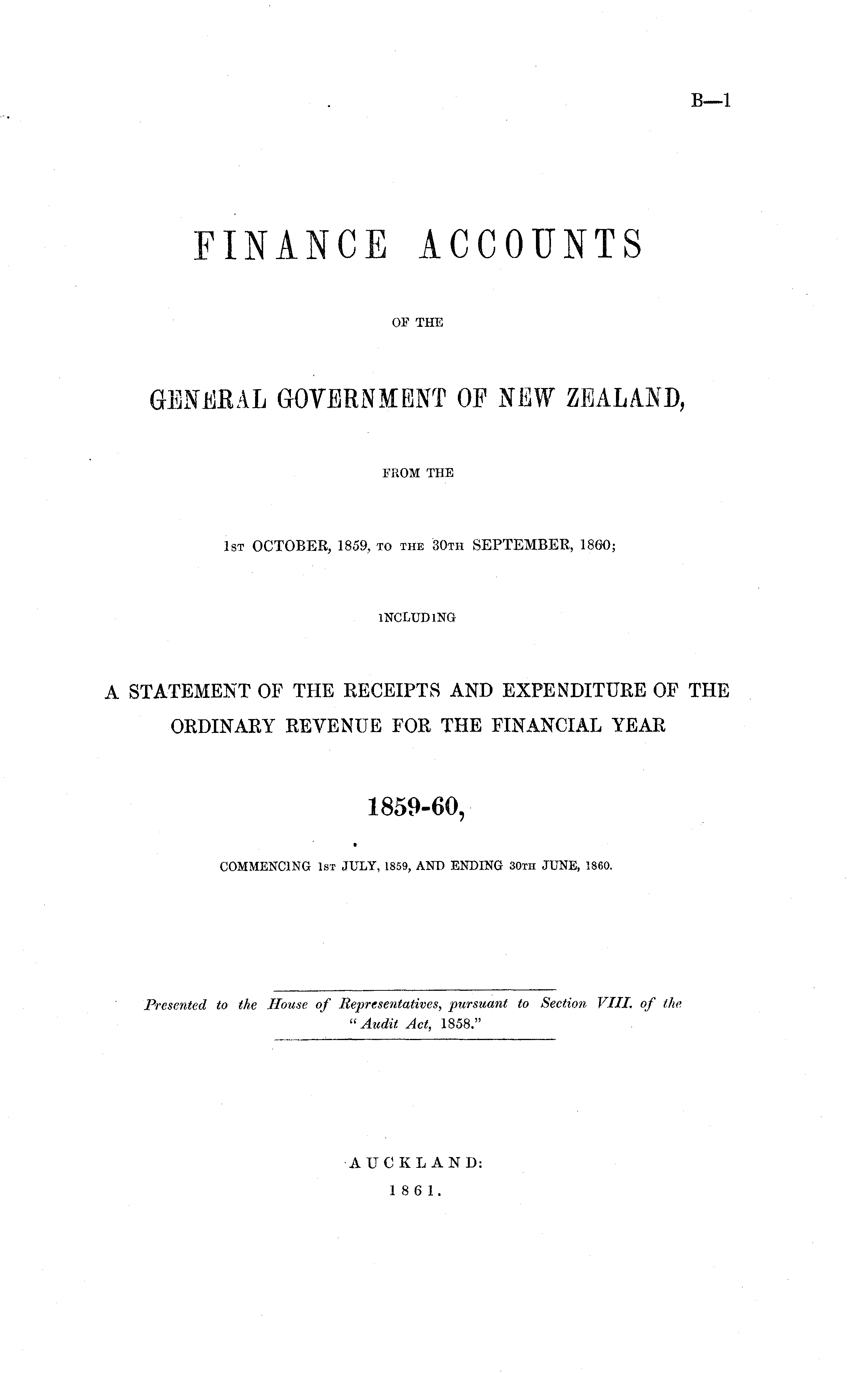 FINANCE ACCOUNTS OF THE GENERAL GOVERNMENT OF NEW ZEALAND, FROM THE 1st OCTOBER, 1859, to the 30th SEPTEMBER, 1860; INCLUDING A STATEMENT OF THE RECEIPTS AND EXPENDITURE OF THE ORDINARY REVENUE FOR THE FINANCIAL YEAR 1859-60, COMMENCING 1st JULY, 1859, AND ENDING 30th JUNE, 1860.