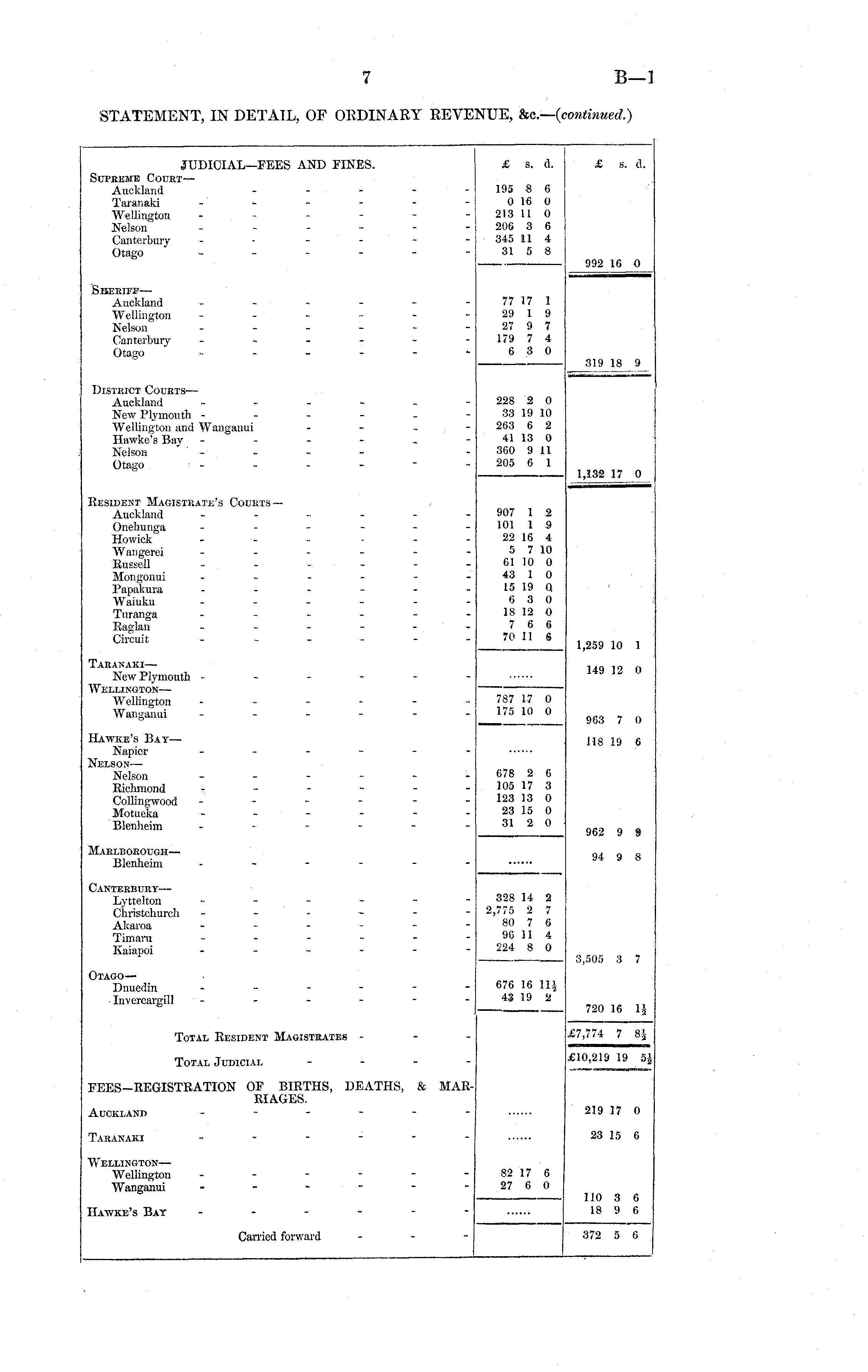 JUDICIAL—FEES AND FINES. SurREME Court— Auckland - - - Taranaki Wellington - - - - Nelson - Canterbury - Otago . . - £ s. d. £ s. d. 195 8 6 0 16 0 213 11 0 206 3 6 345 11 4 31 5 8 992 16 0 Sheriff— Auckland - - - Wellington - - - Nelson - Canterbury - Otago - 77 17 1 29 1 9 27 9 7 179 7 4 6 3 0 319 18 9 District Courts — Auckland - Now Plymouth - - - - Wellington and Wanganui Hawke's Bay - - - - Nelson - Otago 228 2 0 33 19 10 263 6 2 41 13 0 360 9 11 205 6 1 1,132 17 0 Resident Magistrate's Courts — Auckland - Onebunga - Howick Wangerei . _ - - Russell - Mongonui - Papakura - Waiuku _ _ . - Turanga - Raglan - Circuit - 907 1 2 101 1 9 22 16 4 5 7 10 61 10 0 43 1 0 15 19 Q 6 3 0 18 12 0 7 6 6 70 11 6 1,259 10 1 Taranaki— New Plymouth - - - - Wellington— Wellington - Wanganui - - - - 149 12 0 787 17 0 175 10 0 963 7 0 Hawke's Bay— Napier - Nelson— Nelson -..-.- Richmond V - - ■ Collingwood - - - - Motueka - Blenheim - 678 2 6 105 17 3 123 13 0 23 15 0 31 2 0 118 19 6 962 9 9 Marlborough— Blenheim - 94 9 8 Canterbury— Lyttelton - Cliristchurch _ - - - Akaroa - Timaru - - Kaiapoi - 328 14 2 2,775 2 7 80 7 6 96 11 4 224 8 0 Otago— Dnuedin - Invercargill 3,505 3 7 676 16 111 43 19 2 720 16 1J Total Resident Magistrates - £7,774 7 8J Total Judicial £10,219 19 Sf FEES-REGISTRATION OF BIRTHS, DEATHS, RIAGES. & MAR219 17 0 Auckland - Taranaki - - - - 23 15 6 Wellington— Wellington - - - - Wanganui . - - - 82 17 6 27 6 0 110 3 6 18 9 6 Hawke's Bay . - - - Carried forward 372 5 6