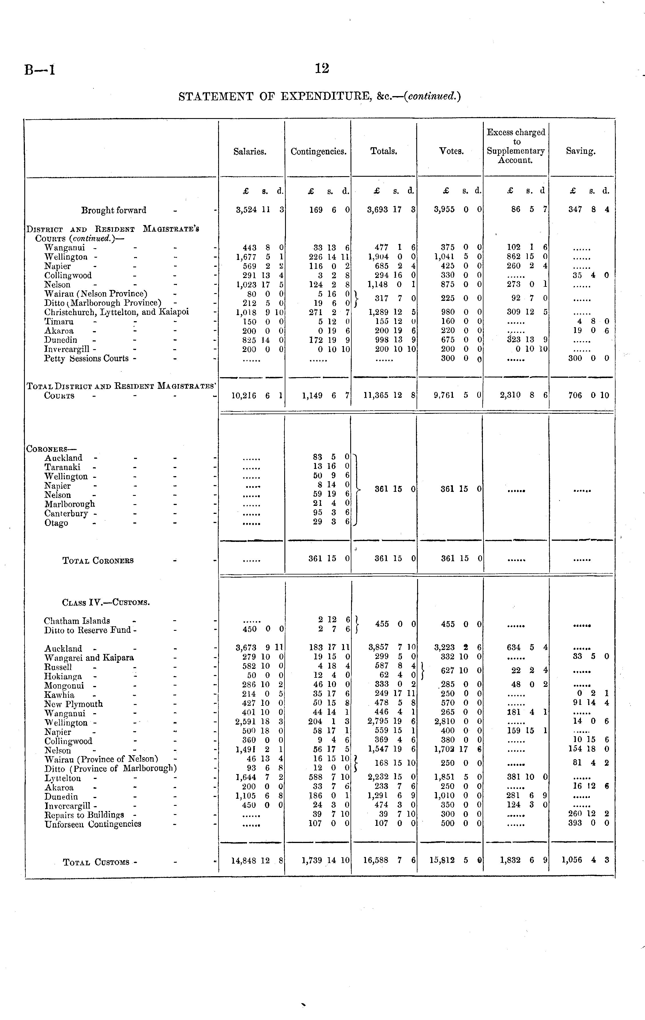 Excess charged to Supplementary Account. Salaries. Contingencies. Totals. Votes. Saving. £ s. d. £ s. d. £ s. d. £ s. d. £ s. d £ s. d. Bronght forward 3,524 11 3 169 6 0 3,693 17 3 3,955 0 0 86 5 7 347 8 4 )ISTRICT AND RESIDENT MAGISTRATE'S Courts (continued.)— Wanganui - Wellington - - - - Napier - Collingwood - - - Nelson - - - - Wairau (Nelson Province) Ditto (, Marlborough Province) Christehurch, Lyttelton, and Kaiapoi Timaru - Akaroa - - - - Dunedin - Invercargill - - - - Petty Sessions Courts - - - 443 8 0 1,677 5 1 569 2 2 291 13 4 1,023 17 5 80 0 0 212 5 0 1,018 9 10 150 0 0 200 0 0 825 14 0 200 0 0 33 13 6 226 14 11 116 0 2 3 2 8 124 2 8 5 16 0 19 6 0 271 2 7 5 12 0 0 19 6 172 19 9 0 10 10 } 477 1 6 1,904 0 0 685 2 4 294 16 0 1,148 0 1 317 7 0 375 O 0 1,041 5 0 425 0 0 330 0 0 875 0 0 225 0 0 102 1 6 862 15 0 260 2 4 273 0 1 92 7 0 35 4 0 1,289 12 5 155 12 0 200 19 6 998 13 9 200 10 10 980 0 0 160 0 0 220 0 0 675 0 0 200 0 0 300 0 o 309 12 5 4 8 0 19 0 6 323 13 9 0 10 10 300 0 0 'otal District and Resident Magistrates' Courts - - - - 10,216 6 1 1,149 6 7 11,365 12 8 9,761 5 0 2,310 8 6 706 0 10 Coroners— Auckland - - - - Taranaki - - - - Wellington - - - - Napier ------ Nelson - Marlborough - Canterbury - - - - Otago - - 83 5 0 13 16 0 50 9 6 8 14 0 59 19 6 21 4 0 95 3 6 29 3 6 361 15 0 361 15 0 Total Coroners 361 15 0 361 15 0 361 15 0 Class IV. —Customs. Chatham Islands - Ditto to Reserve Fund - 450 0 0 2 12 6 2 7 6 } 455 0 0 455 0 0 Auckland - - - - Wangarei and Kaipara Russell . - - - Hokianga - - - - Mongonui - Kawhia - - - - New Plymouth - - - Wanganui - - - - Wellington - Napier - Collingwood - Nelson ------ Wairau (Province of Nelson) Ditto (Province of Marlborough) Lyttelton - - - - Akaroa - Dunedin -"--'- Invercargill - - - Repairs to Buildings Unforseen Contingencies 3,673 9 11 279 10 0 582 10 0 50 0 0 286 10 2 214 0 5 427 10 0 401 10 0 2,591 18 3 500 18 0 360 0 0 1,491 2 1 46 13 4 93 6 8 1,644 7 2 200 0 0 1,105 6 8 450 0 0 183 17 11 19 15 0 4 18 4 12 4 0 46 10 0 35 17 6 50 15 8 44 14 1 204 1 3 58 17 1 9 4 6 56 17 5 16 15 10 12 0 0 588 7 10 33 7 6 186 0 1 24 3 0 39 7 10 107 0 0 3,857 7 10 299 5 0 587 8 4 62 4 0 333 0 2 249 17 11 478 5 8 446 4 1 2,795 19 6 559 15 1 369 4 6 1,547 19 6 3,223 2 6 332 10 0 634 5 4 33 5 0 } 627 10 0 22 2 4 .285 0 0 250 0 0 570 0 0 265 0 0 2,810 0 0 400 0 0 380 0 0 1,702 17 6 48 0 2 0 2 1 91 14 4 181 4 1 14 0 6 159 15 1 10 15 6 154 18 0 \ 168 15 10 250 0 0 81 4 2 2,232 15 0 233 7 6 1,291 6 9 474 3 0 39 7 10 107 0 0 1,851 5 0 250 0 0 1,010 0 0 350 0 0 300 0 0 500 0 0 381 10 0 16 12 6 281 6 9 124 3 0 260 12 2 393 0 0 Total Customs - - - 14,848 12 8 1,739 14 10 16,588 7 6 15,812 5 0 1,832 6 9 1,056 4 3