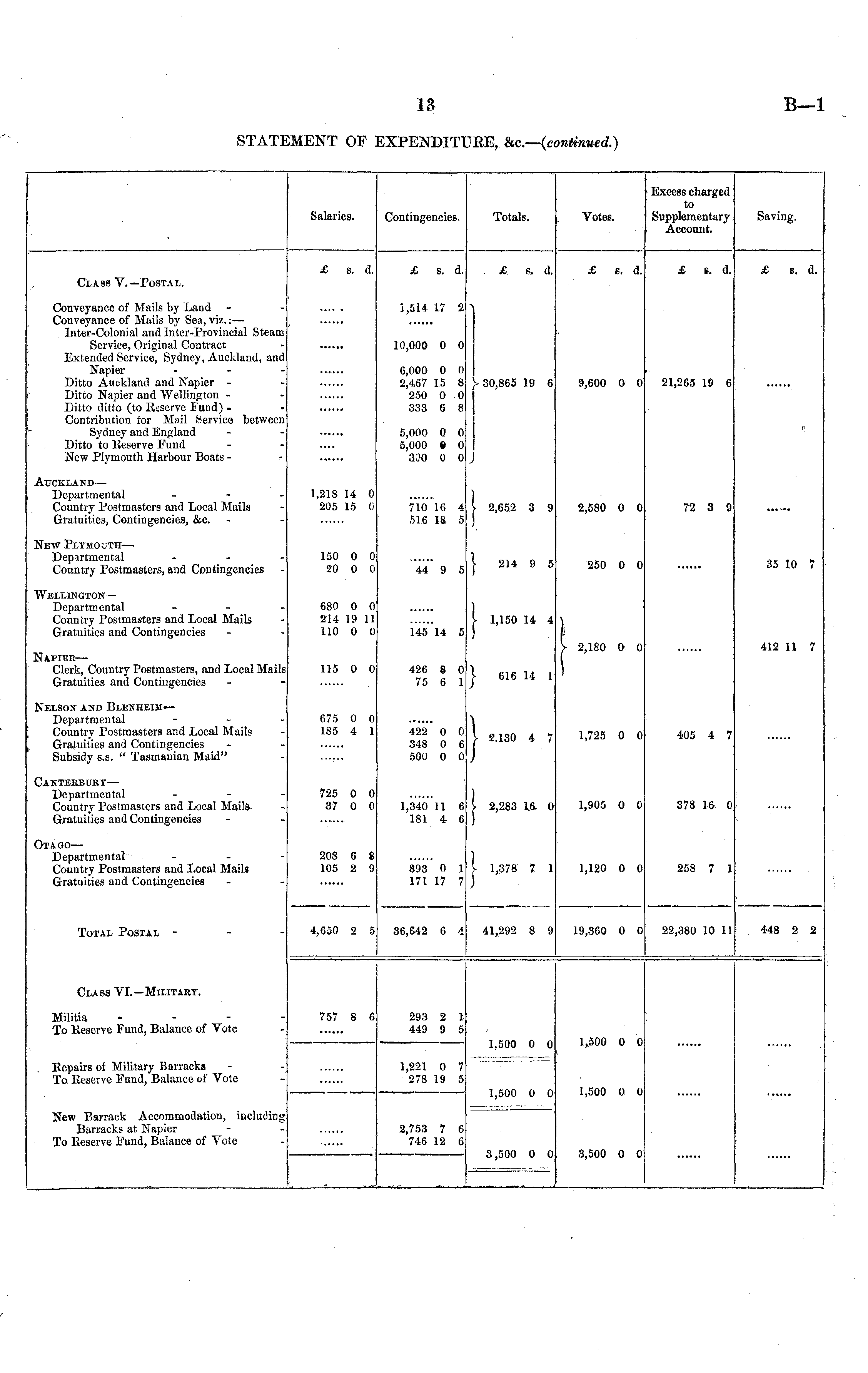Contingencies. Excess charged to Supplementary Account. Salaries. Totals. Votes. Saving. £ s. d. £ s. d. £ s. d. £ s. d. £ s. d. £ s. d. Class V.—Postal. I Conveyance of Mails by Land Conveyance of Mails by Sea, viz.:— Inter-Colonial and Inter-Provincial Steam Service, Original Contract Extended Service, Sydney, Auckland, and Napier Ditto Auckland and Napier - Ditto Napier and Wellington - Ditto ditto (to Reserve Fund) - Contribution for Mail Service between Sydney and England Ditto to Reserve Fund New Plymouth Harbour Boats - 1,514 17 2 > 30,865 19 6 J 10,000 0 0 6,080 0 0 2,467 15 8 250 0 0 333 6 8 9,600 0 0 21,265 19 6: 5,000 0 0 5,000 e o 0 0 n Auckland— Departmental ... Country Postmasters and Local Mails Gratuities, Contingencies, &c. 1,218 14 0 205 15 0 710 16 4 516 18 5 I 2,652 3 9 2,580 0 0 72 3 9 New Plymouth— Departmental - Country Postmasters, and Contingencies 150 0 0 20 0 0 44 9 5 | 214 9 5 250 0 0 35 10 7 Wellington— Departmental - Country Postmasters and Local Mails Gratuities and Contingencies 680 0 0 214 19 11 110 0 0 1 1,150 14 4 V 2,180 0 0 145 14 5 412 11 7 Napier— Clerk, Country Postmasters, and Local Mails Gratuities and Contingencies 115 0 0 426 8 0 75 6 1 1 616 14 1 Nelson and Blenheim— Departmental - Country Postmasters and Local Mails Gratuities and Contingencies Subsidy s.s. " Tasmanian Maid" 675 0 0 185 4 1 422 0 0 348 0 6 500 0 0 I 2.130 4 7 1,725 0 0 405 4 7 Canterbury— Departmental - - - Country Postmasters and Local Mails Gratuities and Contingencies 725 0 0 37 0 0 1,340 11 6 181 4 6 I 2,283 1.6 0 1,905 0 0 378 16 0 Otago— Departmental Country Postmasters and Local Mails Gratuities and Contingencies 208 6 8 105 2 9 893 0 1 171 17 7 I 1,378 7 1 1,120 0 0 258 7 1 Total Postal - - - 4,650 2 5 36,642 6 4 41,292 8 9 19,360 0 0 22,380 10 11 448 2 2 Class VI.— Military. Militia •..--- To Reserve Fund, Balance of Vote 757 8 6 293 2 1 449 9 5 1,500 0 0 1,500 0 0 Repairs of Military Barracks To Reserve Fund, Balance of Vote 1,221 0 7 278 19 5 1,500 0 0 1,500 0 0 New Barrack Accommodation, including Barracks at Napier To Reserve Fund, Balance of Vote 2,753 7 6 746 12 6 3,500 0 0 3,500 0 0 I