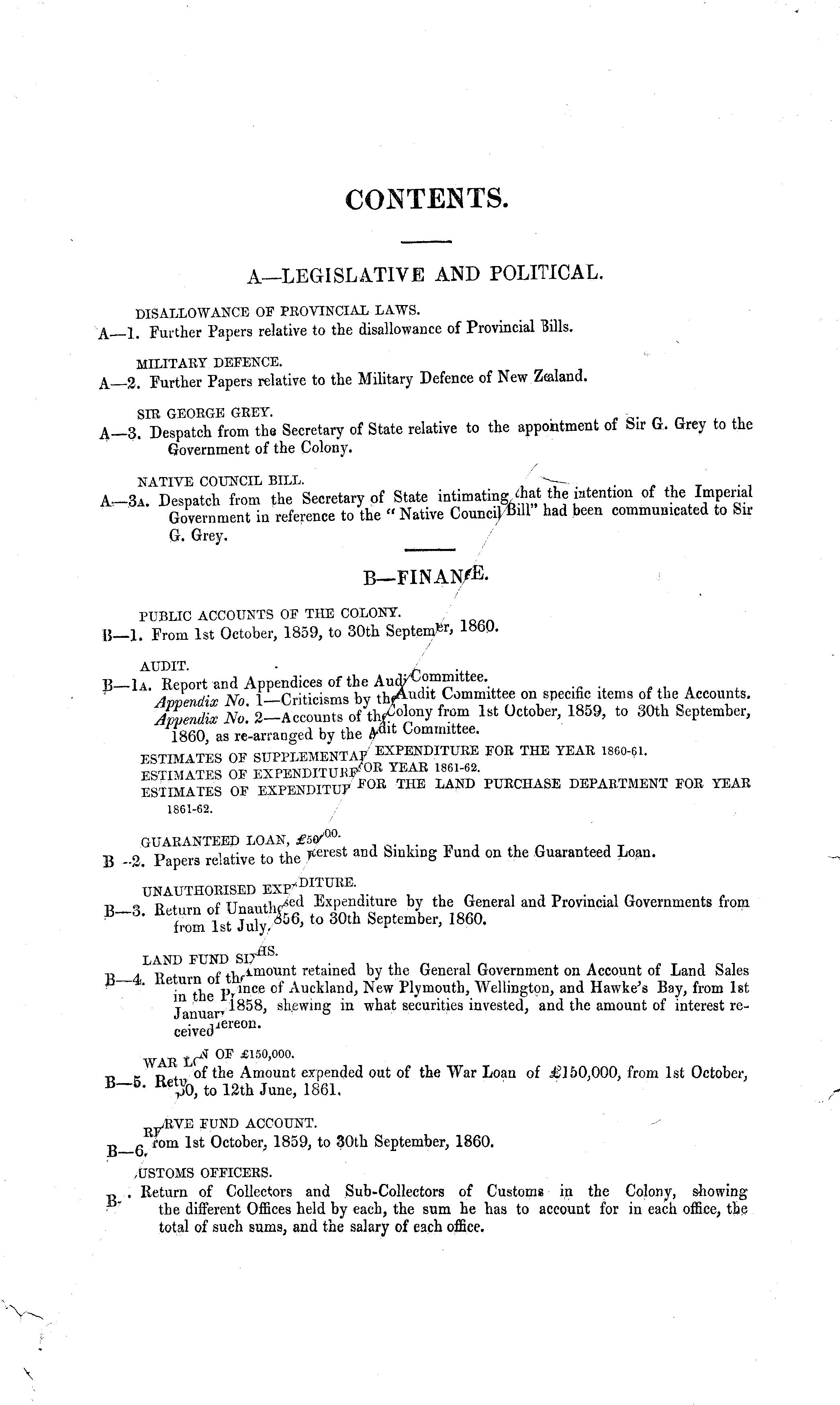 A—LEGISLATIVE AND POLITICAL. DISALLOWANCE OF PROVINCIAL LAWS. A—-1. Further Papers relative to the disallowance of Provincial Bills. MILITARY DEFENCE. A—2. Further Papers relative to the Military Defence of New Zealand. SIR GEORGE GREY. - A—3. Despatch from the Secretary of State relative to the appointment of bir (*. brey to the Government of the Colony. NATIVE COUNCIL BILL. . A,-3a. Despatch from the Secretary of State intimating the intention of the Impend Government in reference to the " Native Council Bill had been communicated to Sir G. Grey.