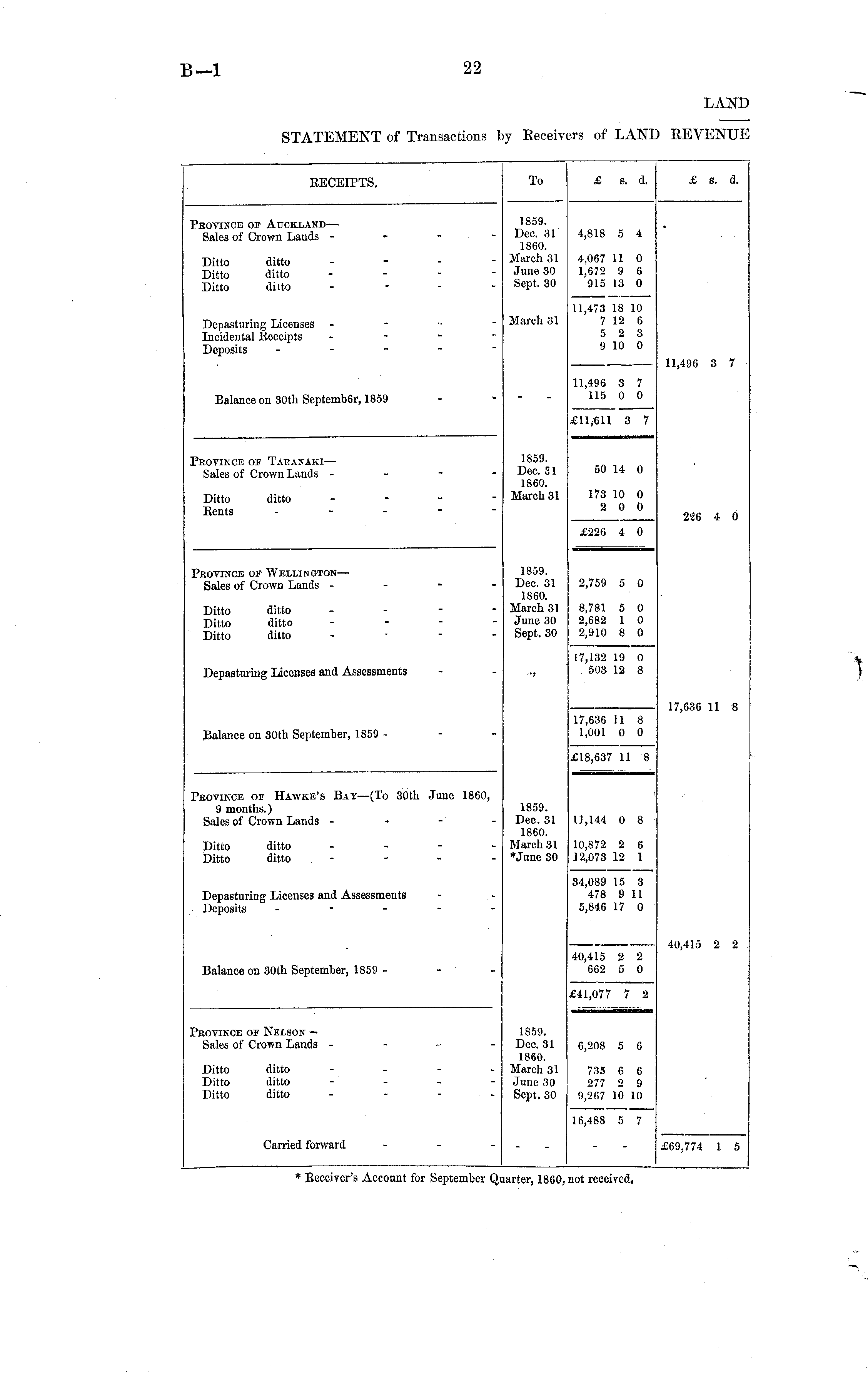 RECEIPTS. To £ s. d. £ s. d. •eovince of Auckland — Sales of Crown Lands - Ditto ditto Ditto ditto Ditto ditto 1859. Dec. 31 I860. March 31 June 30 Sept. 30 4,818 5 4 4,067 11 0 1,672 9 6 915 13 0 Depasturing Licenses Incidental Receipts Deposits - - - March 31 11,473 18 10 7 12 6 5 2 3 9 10 0 11,496 3 7 Balance on 30th Septemb6r, 1859 11,496 3 7 115 0 0 £11,611 3 7 'rovince of Taranaki— Sales of Crown Lands - 1859. Dec. 31 1860. March 31 50 14 0 Ditto ditto Rents 173 10 0 2 0 0 226 4 0 £226 4 0 Province of Wellington— Sales of Crown Lands - Ditto ditto Ditto ditto Ditto ditto 1859. Dee. 31 1860. March 31 June 30 Sept. 30 2,759 5 0 8,781 5 0 2,682 1 0 2,910 8 0 Depasturing Licenses and Assessments •i 17,132 19 0 503 12 8 17,636 11 8 Balance on 30th September, 1859 - 17,636 11 8 1,001 0 0 £18,637 11 8 'rovince of Hawke's Bay—(To 30th June 1860, 9 months.) Sales of Crown Lands - i 1859. Dec. 31 1860. March 31 *Juno 30 11,144 0 8 Ditto ditto - - - Ditto ditto - 10,872 2 6 12,073 12 1 34,089 15 3 478 9 11 5,846 17 0 Depasturing Licenses and Assessments Deposits . - - - . 40,415 2 2 662 5 0 40,415 2 2 Balance on 30th September, 1859 - £41,077 7 2 'rovince of Nelson — Sales of Crown Lands - 1859. Dec. 31 1860. March 31 June 30 Sept, 30 6,208 5 6 Ditto ditto Ditto ditto Ditto ditto 735 6 6 277 2 9 9,267 10 10 16,488 5 7 Carried forward £69,774 1 5 * Receiver's Account for September Qi tarter, 1860, not received.
