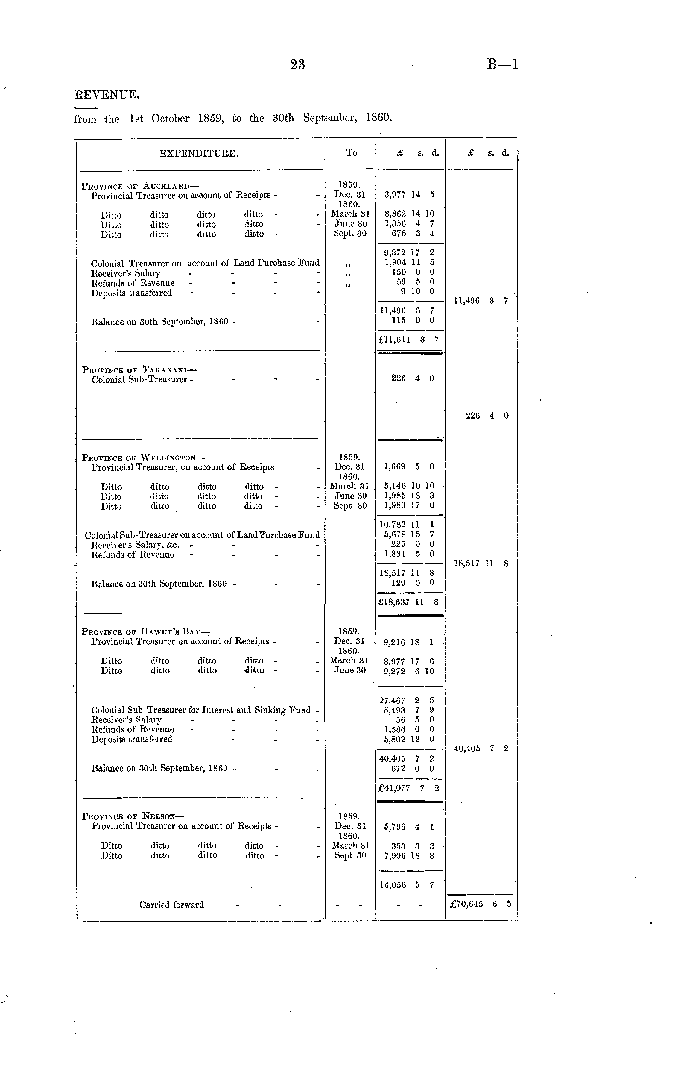 EXPENDITURE. To £ s. d. £ s. d. Province of Auckland— Provincial Treasurer on account of Receipts - Ditto ditto ditto ditto - Ditto ditto ditto ditto - Ditto ditto ditto ditto - 1859. Dec. 31 I860. March 31 June 30 Sept. 30 3,977 14 5 3,362 14 10 1,356 4 7 676 3 4 Colonial Treasurer on account of Land Purchase Fund Receiver's Salary - - - - Refunds of Revenue - - - - Deposits transferred ■;-"•- ii 9,372 17 2 1,904 11 5 150 0 0 59 5 0 9 10 0 13 11,496 3 7 Balance on 30th September, 1860 - - - 11,496 3 7 115 0 0 £11,611 3 7 Province of Taranaki— Colonial Sub-Treasurer - 226 4 0 226 4 0 Province of Wellington— Provincial Treasurer, on account of Receipts 1859. Dec. 31 1860. March 31 June 30 Sept. 30 1,669 5 0 Ditto ditto ditto ditto - Ditto ditto ditto ditto Ditto ditto ditto ditto - 5,146 10 10 1,985 18 3 1,980 17 0 10,782 11 1 5,678 15 7 225 0 0 1,831 5 0 Colonial Sub-Treasurer on account of Land Purchase Fund Receiver s Salary, &c. - - - - Refunds of Revenue - - - - 18,517 11 8 120 0 0 18,517 11 8 Balance on 30 th September, 1860 - £18,637 11 S Province of Hawke's Bay— Provincial Treasurer on account of Receipts - 1859. Dec. 31 1860. March 31 June 30 9,216 18 1 Ditto ditto ditto ditto - Ditto ditto ditto -ditto - 8,977 17 6 9,272 6 10 Colonial Sub-Treasurer for Interest and Sinking Fund - Receiver's Salary - Refunds of Revenue - Deposits transferred - 27,467 2 5 5,493 7 9 56 5 0 1,586 0 0 5,802 12 0 40,405 7 2 672 0 0 40,405 7 2 Balance on 30th September, 1860 - £41,077 7 2 Province of Nelson— Provincial Treasurer on account of Receipts - 1859. Dec. 31 1860. March 31 Sept. 30 5,796 4 1 Ditto ditto ditto ditto - Ditto ditto ditto ditto - 353 3 3 7,906 18 3 14,056 5 7 £70,645 6 Carried forward