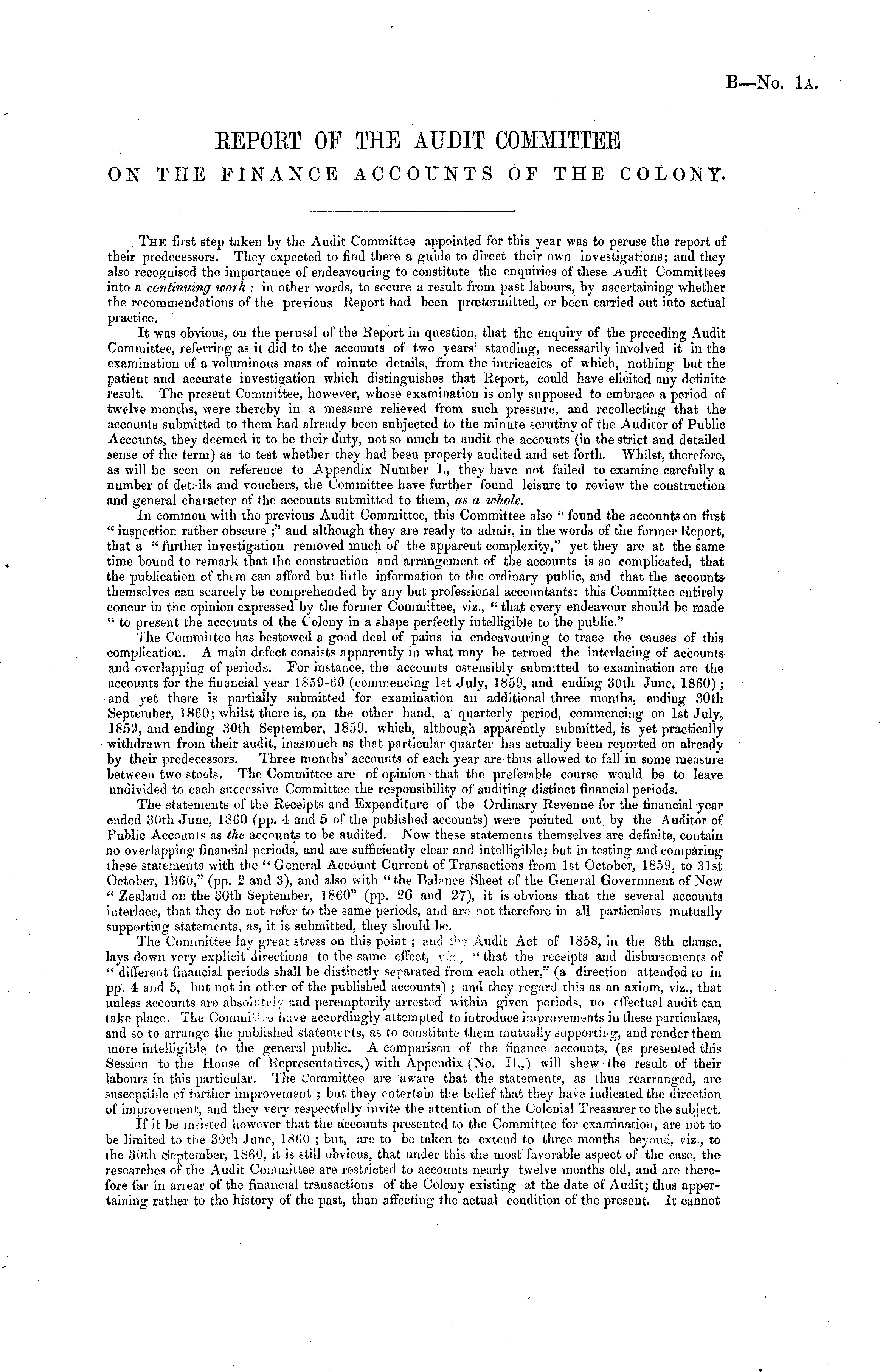 The first step taken by the Audit Committee appointed for this year was to peruse the report of their predecessors. They expected to find there a guide to direct their own investigations; and they also recognised the importance of endeavouring to constitute the enquiries of these .audit Committees into a continuing work : in other words, to secure a result from past labours, by ascertaining whether the recommendations of the previous Report had been prostermitted, or been carried out into actual practice. It was obvious, on the perusal of the Report in question, that the enquiry of the preceding Audit Committee, referring as it did to the accounts of two years' standing, necessarily involved it in the examination of a voluminous mass of minute details, from the intricacies of which, nothing but the patient and accurate investigation which distinguishes that Report, could have elicited any definite result. The present Committee, however, whose examination is only supposed to embrace a period of twelve months, were thereby in a measure relieved from such pressure, and recollecting that the accounts submitted to them had already been subjected to the minute scrutiny of the Auditor of Public Accounts, they deemed it to be their duty, not so much to audit the accounts (in the strict and detailed sense of the term) as to test whether they had been properly audited and set forth. Whikt, therefore, as will be seen on reference to Appendix Number 1., they have not failed to examine carefully a number of details and vouchers, the Committee have further found leisure to review the construction and general character of the accounts submitted to them, as a whole. In common with the previous Audit Committee, this Committee also " found the accounts on first " inspection rather obscure ;" and although they are ready to admit, in the words of the former Report, that a " further investigation removed much of the apparent complexity," yet they are at the same time bound to remark that the construction and arrangement of the accounts is so complicated, that the publication of thtm can afford but lit tie information to the ordinary public, and that the accounts themselves can scarcely be comprehended by any but professional accountants: this Committee entirely concur in the opinion expressed by the former Committee, viz., " that every endeavour should be made " to present the accounts of the Colony in a shape perfectly intelligible to the public." The Commhtee has bestowed a good deal of pains in endeavouring to trace the causes of thia complication. A main defect consists apparently in what may be termed the interlacing of accounts and overlapping of periods. For instance, the accounts ostensibly submitted to examination are the accounts for the financial year 1859-60 (commencing Ist July, 1859, and ending 30th June, 1860); and yet there is partially submitted for examination an additional three months, ending 30th September, 3860; whilst there is, on the other hand, a quarterly period, commencing on Ist July, 1859, and ending 30th September, 1859, which, although apparently submitted, is yet practically withdrawn from their audit, inasmuch as that particular quarter has actually been reported on already by their predecessors. Three momhs' accounts of each year are thus allowed to fall in some measure between two stools. The Committee are of opinion that the preferable course would be to leave undivided to each successive Committee the responsibility of auditing distinct financial periods. The statements of the Receipts and Expenditure of the Ordinary Revenue for the financial year ended 30th June, 1860 (pp. 4 and 5 of the published accounts) were pointed out by the Auditor of Public Accounts as the accounts to be audited. Now these statements themselves are definite, contain no overlapping financial periods, and are sufficiently clear and intelligible; but in testing and comparing these statements with the "General Account Current of Transactions from Ist October, 1859, to 31st October, 1&60," (pp. 2 and 3), and also with " the Balance Sheet of the General Government of New " Zealand on the 30th September, 1860" (pp. 26 and 27), it is obvious that the several accounts interlace, that they do not refer to the same periods, and are not therefore in all particulars mutually supporting statements, as, it is submitted, they should be. The Committee lay great stress on this point ; and the Audit Act of 1858, in the Bth clause, lays down very explicit directions to the same effect, vjz., "that the receipts and disbursements of " different financial periods shall be distinctly separated from each other," (a direction attended to in pp. 4 and 5, but not in other of the published accounts) ; and they regard this as an axiom, viz., that unless accounts are absolutely sad peremptorily arrested within given periods, no effectual audit can take place. The Committee have accordingly attempted to introduce improvements in these particulars, and so to arrange the published statements, as to constitute them mutually supporting, and render them more intelligible to the general public. A comparison of the finance accounts, (as presented this Session to the House of Representatives,) with Appendix (No. II.,) will shew the result of their labours in this particular. The Committee are aware that the statements, as thus rearranged, are susceptible of further improvement ; but they entertain the belief that they have indicated the direction of improvement, and they very respectfully invite the attention of the Colonial Treasurer to the subject. If it be insisted however that the accounts presented to the Committee for examination, are not to be limited to the 30th June, 1860 ; but, are to be taken to extend to three months beyond, viz,, to the 30th September, 1860, it is still obvious, that under this the most favorable aspect of the case, the researches of the Audit Committee are restricted to accounts nearly twelve months old, 