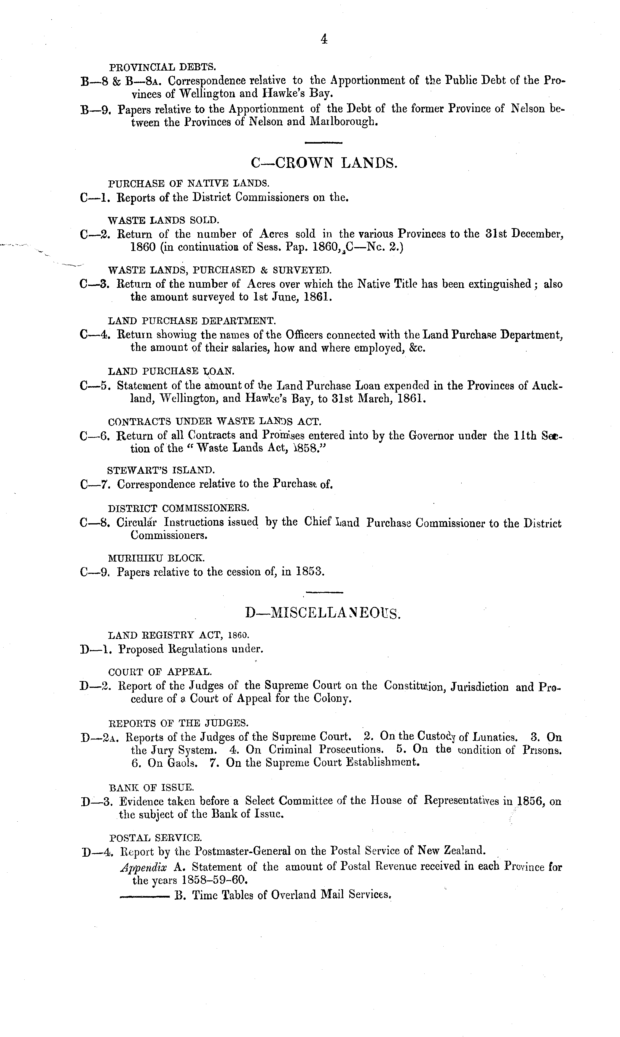 D—MISCELLANEOUS. LAND REGISTRY ACT, 1860. D—l. Proposed Regulations under. COURT OF APPEAL. D—2. Report of the Judges of the Supreme Court on the Constitution, Jurisdiction and Procedure of a Court of Appeal for the Colony. REPORTS OF THE JUDGES. D—-2a. Reports of the Judges of the Supreme Court. 2. On the Custody of Lunatics. 3. On the Jury System. 4. On Criminal Prosecutions. 5. On the tondition of Prisons. 6. On Gaols. 7. On the Supreme Court Establishment. BANK OF ISSUE. D—3. Evidence taken before a Select Committee of the House of Representatives in 1856, on the subject of the Bank of Issue. POSTAL SERVICE. j)—4, Report by the Postmaster-General on the Postal Service of New Zealand. Appendix A. Statement of the amount of Postal Revenue received in each Province for the years 1858-59-60. B. Time Tables of Overland Mail Services.