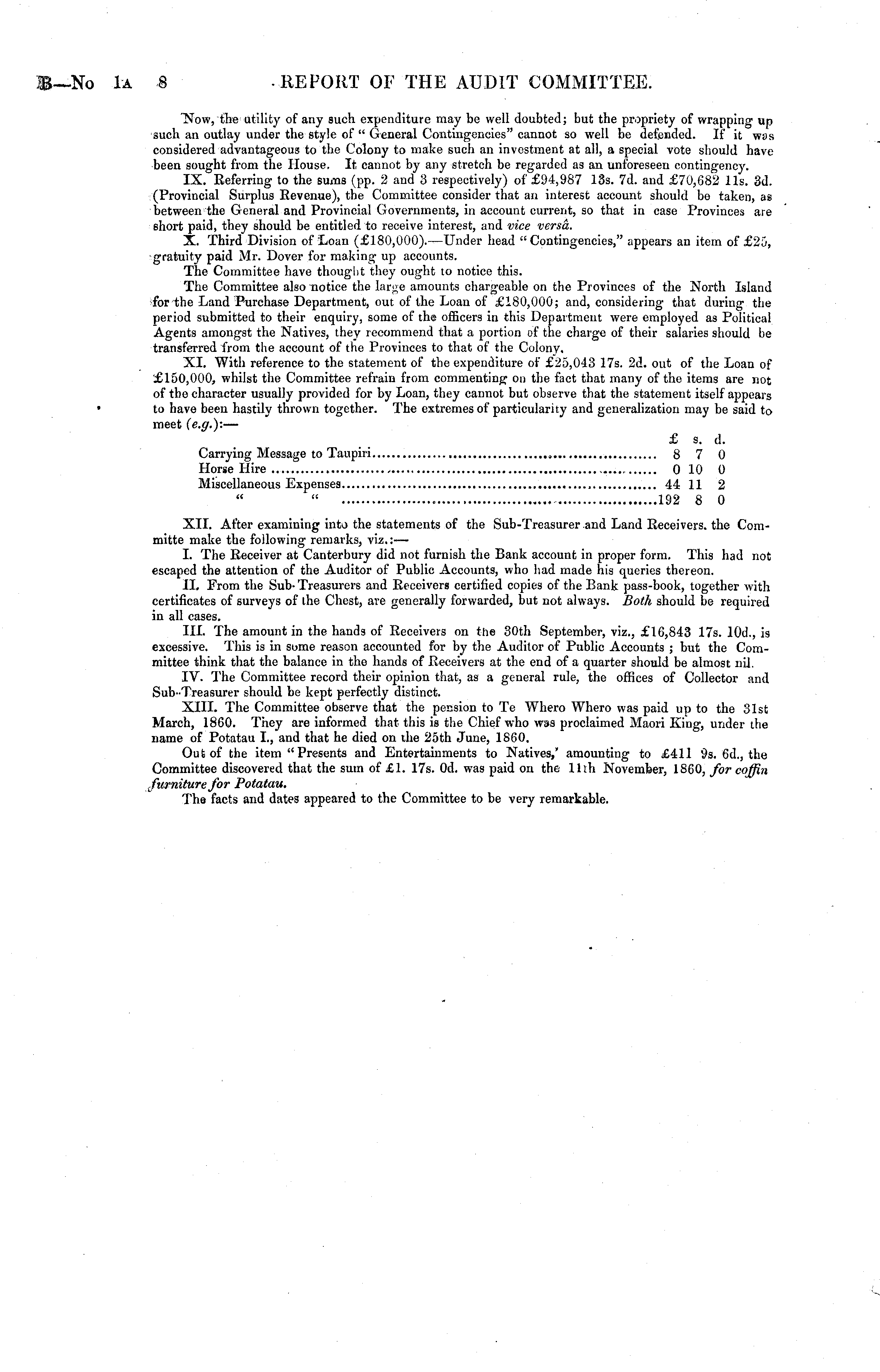 Now, the utility of any such expenditure may be well doubted; but the propriety of wrapping up such an outlay under the style of " General Contingencies" cannot so well be defended. If it was considered advantageous to the Colony to make such an investment at all, a special vote should have been sought from the House. It cannot by any stretch be regarded as an unforeseen contingency. IX. Referring to the sums (pp. 2 and 3 respectively) of £94,987 13s. 7d. and £70,682 lis. 3d. (Provincial Surplus Revenue), the Committee consider that an interest account should be taken, as between the General and Provincial Governments, in account current, so that in case Provinces are short paid, they should be entitled to receive interest, and vice versa. X. Third Division of Loan (£180,000). —Under head "Contingencies," appears an item of £25, gratuity paid Mr. Dover for making up accounts. The Committee have thought they ought to notice this. The Committee also notice the large amounts chargeable on the Provinces of the North Island for the Land Purchase Department, out of the Loan of £180,000; and, considering that during the period submitted to their enquiry, some of the officers in this Department were employed as Political Agents amongst the Natives, they recommend that a portion of the charge of their salaries should he transferred from the account of the Provinces to that of the Colony. XI. With reference to the statement of the expenditure of £25,043 17s. 2d. out of the Loan of £150,000, whilst the Committee refrain from commenting on the fact that many of the items are not of the character usually provided for by Loan, they cannot but observe that the statement itself appears to have been hastily thrown together. The extremes of particularity and generalization may be said to meet (e.g.): — £ s. d. Carrying Message to Taupiri 8 7 0 Horse Hire 0 10 0 Miscellaneous Expenses 44 11 2 " " .... 192 8 0 XII. After examining into the statements of the Sub-Treasurer and Land Receivers, the Committe make the following remarks, viz.:— I. The Receiver at Canterbury did not furnish the Bank account in proper form. This had not escaped the attention of the Auditor of Public Accounts, who had made his queries thereon. 11. From the Sub- Treasurers and Receivers certified copies of the Bank pass-book, together with certificates of surveys of the Chest, are generally forwarded, but not always. Both should be required in all cases. 111. The amount in the hands of Receivers on the 30th September, viz., £16,843 17s. 10d., is excessive. This is in some reason accounted for by the Auditor of Public Accounts ; but the Committee think that the balance in the hands of Receivers at the end of a quarter should be almost nil. IV. The Committee record their opinion that, as a general rule, the offices of Collector and Sub-Treasurer should be kept perfectly distinct. XIII. The Committee observe that the pension to Te Whero Whero was paid up to the 31st March, 1860. They are informed that this is the Chief who was proclaimed Maori King, under the name of Potatau 1., and that he died on the 25th June, 1860. Out of the item "Presents and Entertainments to Natives/ amounting to £411 9s. 6d., the Committee discovered that the sum of £1. 17s. Od. was paid on the 11th November, 1860, for coffin furniture for Potatau. The facts and dates appeared to the Committee to be very remarkable.