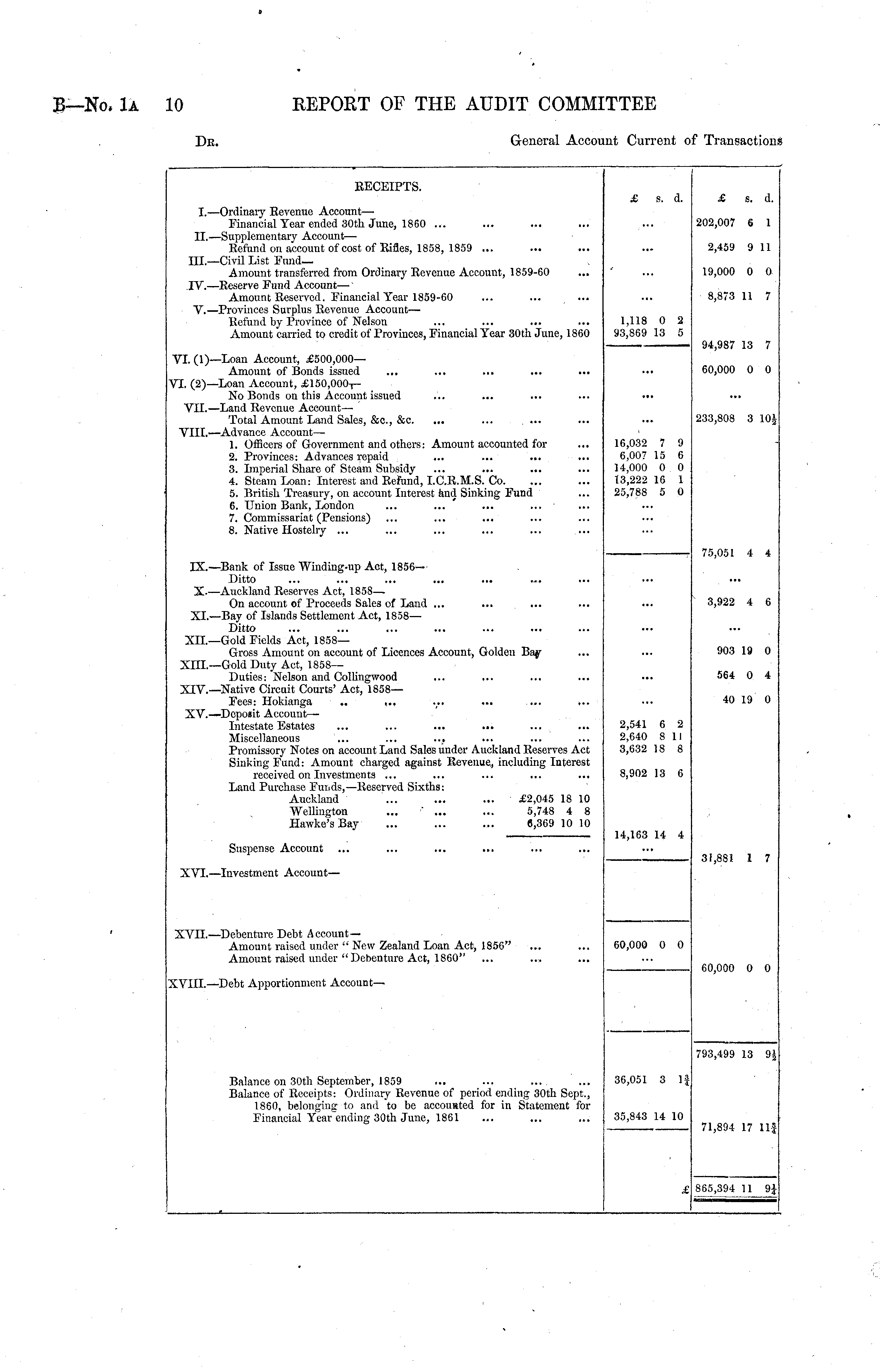 Dβ. EECEIPTS. £ s. d. I. —Ordinary Revenue Account— Financial Year ended 30th Juno, 1860 ... II. —Supplementary Account — Eefund on account of cost of Rifles, 1858, 1859 ... III.—Civil List FundAmount transferred from Ordinary Revenue Account, 1859-60 ... TV. —Reserve Fund Account— Amount Reserved. Financial Year 1859-60 V.—Provinces Surplus Revenue Account— Refund by Province of Nelson Amount carried to credit of Provinces, Financial Year 30th June, 1860 £ s. d. 202,007 6 1 2,459 9 11 19,000 0 0 8,873 11 7 1,118 0 2 93,869 13 5 94,987 13 7 VI. (1)—Loan Account, £500,000— Amount of Bonds issued VI. (2)—Loan Account, £150,000— No Bonds on this Account issued VII.—Land Revenue Account — Total Amount Land Sales, &c, &c. ... ... . . ... VIII. —Advance Account— 1. Officers of Government and others: Amount accounted for 2. Provinces: Advances repaid 3. Imperial Share of Steam Subsidy 4. Steam Loan: Interest and Refund, I.C.R.M.S. Co. 5. British Treasury, on account Interest and Sinking Fund 6. Union Bank, London 7. Commissariat (Pensions) 8. Native Hostelry ... 16,032 7 9 6,007 15 6 14,000 0 0 13,222 16 1 25,788 5 0 60,000 0 0 233,808 3 10J 75,051 4 4 IX.—Bank of Issue Winding-up Act, 1856— Ditto X- —Auckland Reserves Act, 1858— On account of Proceeds Sales of Land ... XL—Bay of Islands Settlement Act, 1858— Ditto XII.—Gold Fields Act, 1858— Gross Amount on account of Licences Account, Golden Bay XIII.—Gold Duty Act, 1858— Duties: Nelson and Collingwood XIV.—Native Circuit Courts' Act, 1858— Fees: Hokianga XV.—Deposit Account— Intestate Estates Miscellaneous Promissory Notes on account Land Sales under Auckland Reserves Act Sinking Fund: Amount charged against Revenue, including Interest received on Investments ... Land Purchase Funds, —Reserved Sixths: Auckland ... ... ... £2,045 18 10 Wellington ... ' ... ... 5,748 4 8 Hawke'sBay ... ... ... 6,369 10 10 3,922 4 6 903 19 0 564 0 4 40 19 0 2,541 6 2 2,640 8 11 3,632 18 8 8,902 13 6 14,163 14 4 Suspense Account 31,881 1 7 XVI. —Investment Account— XVII.—Debenture Debt Account— Amount raised under " New Zealand Loan Act, 1856" Amount raised under "Debenture Act, 1860" 60,000 0 0 60,000 0 0 XVIII. —Debt Apportionment Account— 36,051 3 1| 793,499 13 9J Balance on 30th September, 1859 Balance of Receipts: Ordinary Revenue of period ending 30th Sept., 1860, belonging to and to be accounted for in Statement for Financial Year ending 30th June, 1861 35,843 14 10 71,894 17 Hf £ 865,394 11 9j-
