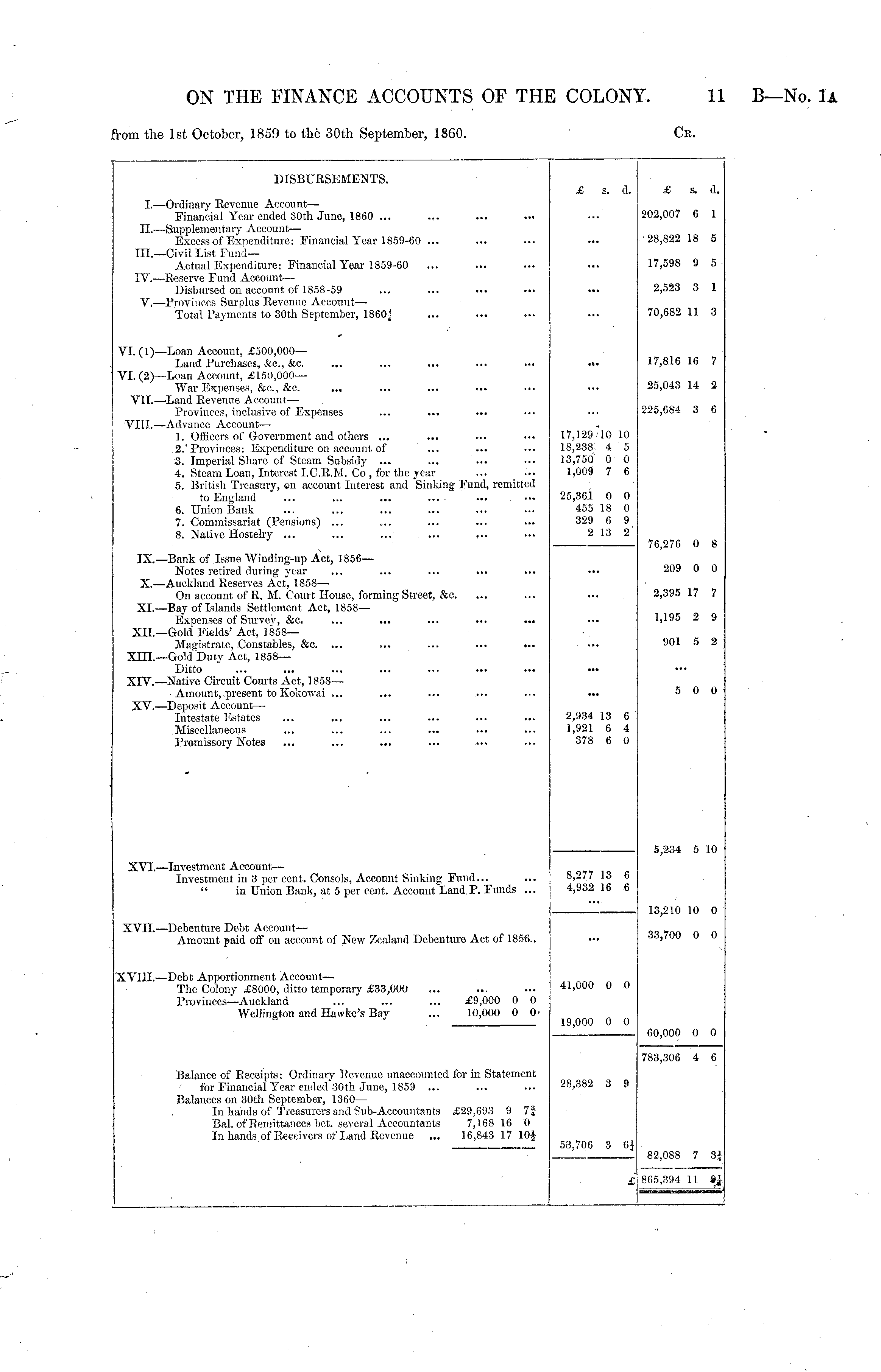 Ck. DISBURSEMENTS. I.—Ordinary Revenue Account— Financial Tear ended 30th June, 1860 ... II.—Supplementary Account—■ Excess of Expenditure: Financial Year 1859-60 ... III.—Civil List FundActual Expenditure: Financial Year 1859-60 IV.—Reserve Fund Account — Disbursed on account of 1858-59 V. —Provinces Surplus Revenue Account— Total Payments to 30th September, 1860^ £ s. d. £ s. d. 202,007 6 1 ■28,822 18 5 17,598 9 5 2,523 3 1 70,682 11 3 *■ VI. (1)—Loan Account, £500,000— Land Purchases, &c, &c. VI. (2)—Loan Account, £150,000— War Expenses, &c, &c. VII.—Land Revenue Account— Provinces, inclusive of Expenses VIII. —Advance Account— 1. Officers of Government and others ... 2.'Provinces: Expenditure on account of 3. Imperial Share of Steam Subsidy ... 4. Steam Loan, Interest I.C.R.M. Co , for the year 5. British Treasury, on account Interest and Sinking Fund, remitted to England 6. Union Bank 7. Commissariat (Pensions) ... 8. Native Hostelry ... •t. 17,816 16 7 25,043 14 2 225,684 3 6 17,129 10 10 18,238 4 5 13,750 0 0 1,009 7 6 25,361 0 0 455 18 0 329 6 9 2 13 2 IX.—Bank of Issue Winding-up Act, 1856— Notes retired during year X.—Auckland Reserves Act, 1858— On account of R. M. Court House, forming Street, &c. XI. —Bay of Islands Settlement Act, 1858— Expenses of Survey, &c. ... ... ... ... ... XII.—Gold Fields' Act, J858— Magistrate, Constables, &c. XIII.—Gold Duty Act, 1858— Ditto XIV.—Native Circuit Courts Act, 1858— Amount, present to Kokowai ... XV.—Deposit Account— Intestate Estates Miscellaneous Promissory Notes 76,276 0 8 209 0 0 2,395 17 7 1,195 2 9 901 5 2 5 0 0 2,934 13 6 1,921 6 4 378 6 0 XVI.—Investment Account— Investment in 3 per cent. Consols, Account Sinking Fund... " in Union Bank, at 5 per cent. Account Land,P. Funds ... 5,234 5 10 8,277 13 6 4,932 16 6 XVII. —Debenture Debt Account— Amount paid off on account of New Zealand Debenture Act of 1856.. 13,210 10 0 33,700 0 0 XVIII. —Debt Apportionment Account— The Colony £8000, ditto temporary £33,000 Provinces—Auckland ... ... ... £9,000 0 0 Wellington and Hawke's Bay ... 10,000 0 0> 41,000 0 0 19,000 0 0 Balance of Receipts: Ordinary , Revenue unaccounted for in Statement for Financial Year ended 30th June, 1859 ... Balances on 30th September, 1360 — In hands of Treasurers and Sub-Accountants £29,693 9 7-| Bal. of Remittances bet. several Accountants 7,168 16 0 In hands of Receivers of Land Revenue ... 16,843 17 10J 60,000 0 0 783,306 4 6 28,382 3 9 58,706 3 6} 82,088 7 3i £ 865,394 11 »j