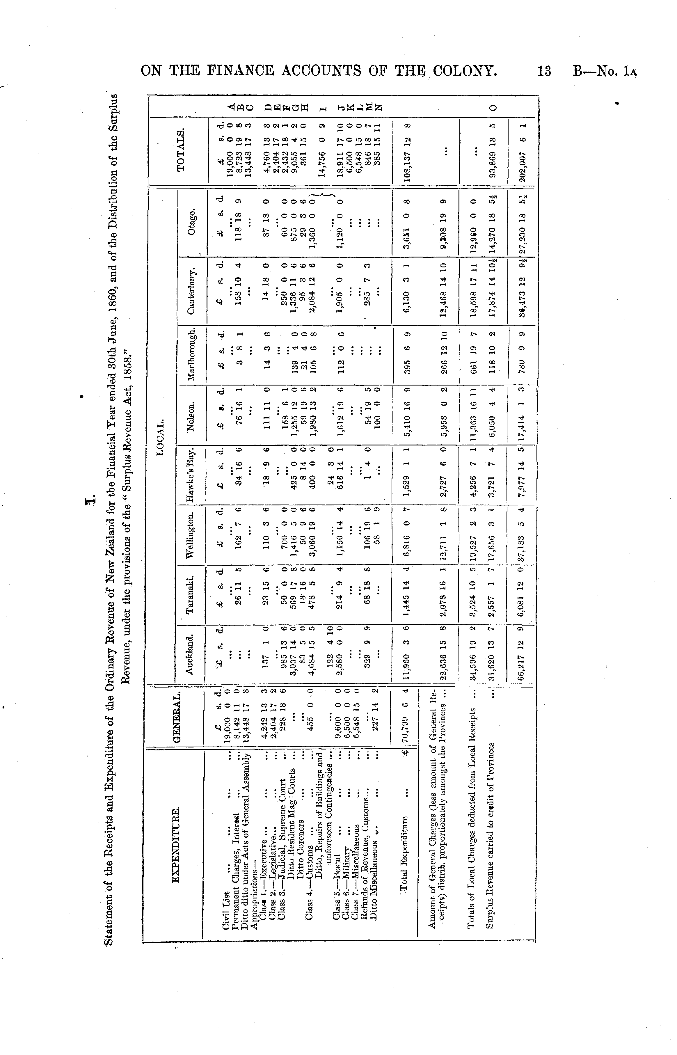 LOCAL. EXPENDITURE. Auckland. Taranaki. Wellington. Hawke's Bay. Nelson. Marlborough. Canterbury. Otago. Civil List Permanent Charges, Interest Ditto ditto under Acts of General Assembly Appropriations — ■ Clas» 1.—Executive ... Class 2.—Legislative... Class 3.—Judicial, Supreme Court Ditto Resident Mag Courts ... Ditto Coroners ... Class 4.—Customs ... Ditto, Repairs of Buildings and unforeseen Contingencies .». Class 5.—Postal Class 6.—Military ... Class 7.—Miscellaneous Refunds of Revenue, Customs... Ditto Miscellaneous .... £ s. a. 19,000 0 0 8,142 11 0 13,448 17 3 £ s. a. £ s. a. 26 11 5 £ s. a. 162 7 6 £ s. a. 34 16 6 £ s. a. 76 16 1 £ s. a. 3 8 1 £ s. a. 158 10 4 £ s. a. 118 18 9 £ s. a. 19,000 0 0 8,723 19 8 13,448 17 3 A B C 4,242 13 3 2,404 17 2 228 18 6 137 1 0 985 13 6 3,037 14 0 83 5 0 4,684 15 5 23 15 6 110 3 6 18 9 6 111 11 0 14 3 6 14 18 0 250 0 0 1,336 11 6 95 3 6 2,084 12 6 87 18 0 4,760 13 3 2,404 17 2 2,432 18 1 9,055 4 2 361 15 0 D E G II 50 0 0 569 17 8 13 16 0 478 5 8 700 0 0 1,416 5 0 50 9 6 3,060 19 6 425 0 0 8 14 0 400 0 0 158 6 1 1,255 12 0 59 19 6 1,980 13 2 139 4 0 21 4 0 105 6 8 60 0 0 875 0 0 29 3 6 1,360 0 0) ... I 1,120 0 0 455 0 0 9,600 0 0 6,500 0 0 6,548 15 0 122 4 10 2,580 0 0 24 3 0 616 14 1 14,756 0 9 I 214 9 4 1,150 14 4 1,612 19 6 ' 112 0 6 1,905 0 0 18,911 17 10 6,500 0 0 6,548 15 0 846 18 7 385 15 11 J K L M N 227 14 2 329 9 9 68 18 8 106 19 6 58 1 9 14 0 54 19 5 100 0 0 285 7 3 ... I • "Total Expenditure ... £ 70,799 6 4 11,960 3 6 5,410 16 9 1,445 14 4 6,816 0 7 1,529 1 1 395 6 9 6,130 3 1 3,651 0 3 108,137 12 8 Amount of General Charges (less amount of General Receipts) distrib. proportionately amongst the Provinces ... 22,636 15 8 2,078 16 1 12,711 1 8 2,727 6 0 5,953 0 2 266 12 10 12,468 14 10 9,308 19 9 Totals of Local Charges deducted from Local Receipts ... 3,524 10 5 4,256 7 1 34,596 19 2 19,527 2 3 11,363 16 11 661 19 7 18,598 17 11 12,960 0 0 Surplus Revenue carried to credit of Provinces 31,620 13 7 2,557 1 7 17,656 3 1 3,721 7 4 6,050 4 4 118 10 2 17,874 14 101 14,270 18 5§ 93,869 13 5 I 66,217 12 9 6,081 12 0 37,183 5 4 7,977 14 5 17,414 1 3 780 9 9 36,473 12 9J 27,230 18 5§ 202,007 6 1