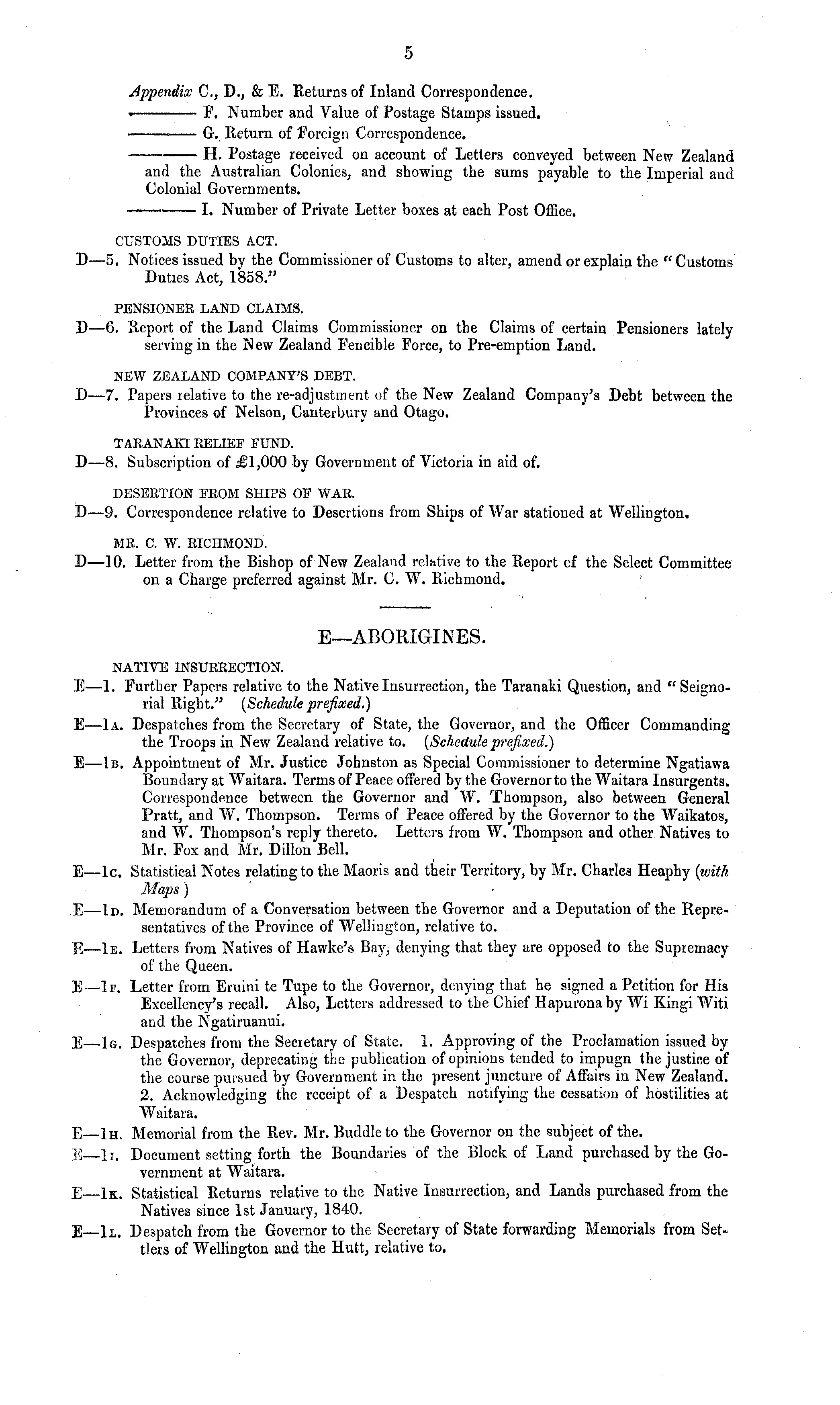 Appendix C, D., & E. Returns of Inland Correspondence. • F. Number and Value of Postage Stamps issued. G. Return of Foreign Correspondence. H. Postage received on account of Letters conveyed between New Zealand and the Australian Colonies, and showing the sums payable to the Imperial and Colonial Governments. I. Number of Private Letter boxes at each Post Office. CUSTOMS DUTIES ACT. D—s. Notices issued by the Commissioner of Customs to alter, amend or explain the "Customs Duties Act, 1858." PENSIONER LAND CLAIMS. D—6. Report of the Land Claims Commissioner on the Claims of certain Pensioners lately serving in the New Zealand Fencible Force, to Pre-emption Land. NEW ZEALAND COMPANY'S DEBT. D—7. Papers relative to the re-adjustment of the New Zealand Company's Debt between the Provinces of Nelson, Canterbury and Otago. TARANAKI RELIEF FUND. D—B. Subscription of £1,000 by Government of Victoria in aid of. DESERTION FROM SHIPS OF WAR. D—9. Correspondence relative to Desertions from Ships of War stationed at Wellington. MR. C. W. RICHMOND. D—lo. Letter from the Bishop of New Zealand relative to the Report cf the Select Committee on a Charge preferred against Mr. C. W. Richmond.