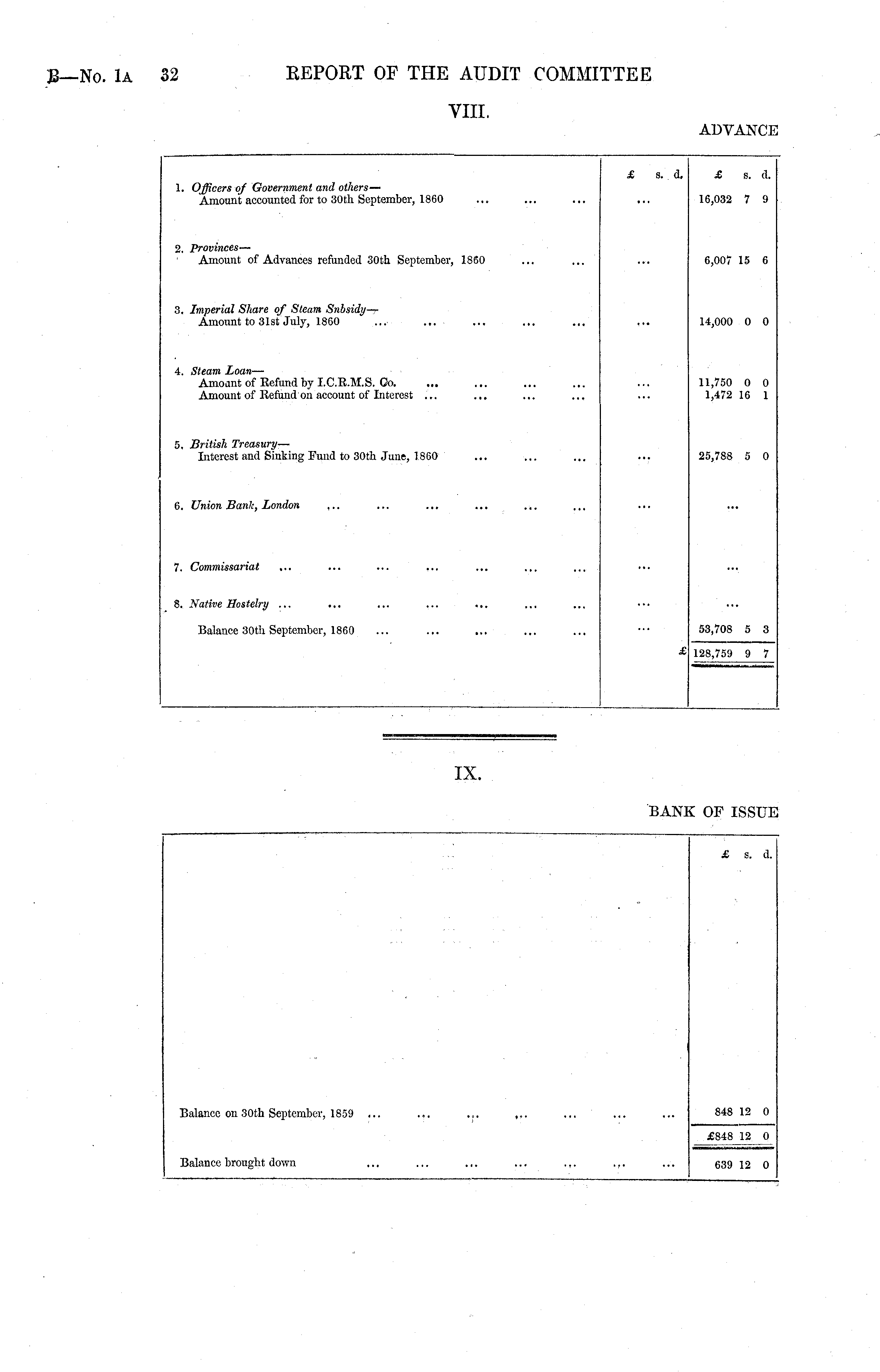 £ s.. a. £ s. a. 1. Officers of Government and others— Amount accountoa for to 30th September, 1860 16,032 7 9 2. Provinces — Amount of Aavances refunaea 30th September, 1860 6,007 15 6 3. Imperial Share of Steam Amount to 31st July, 1860 14,000 0 0 4. Steam Loan — Amount of Refuna by I.C.R.M.S. Oo. Amount of Refuna on account of Interest ... 11,750 0 0 1,472 16 1 5. British Treasury — Interest and Sinking Fund to 30th June, 1.860 25,788 5 0 6. Union Bank, London ,.. 7. Commissariat 8. Native Hostelry ... Balance 30th September, 1860 53,708 5 3 £j 128,759 9 7