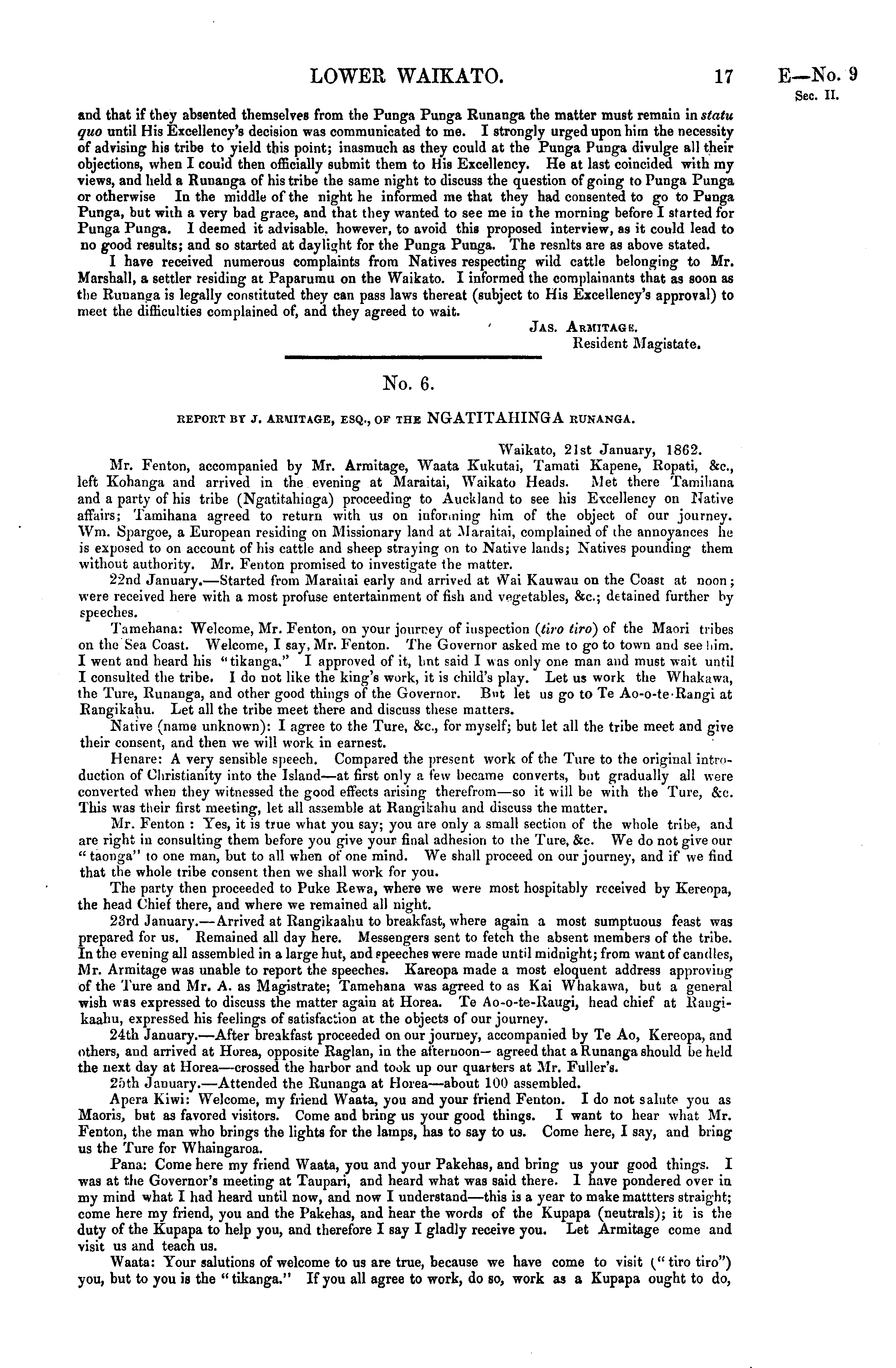 No. 6. EEPOET BY J. ARMITAGE, ESQ., OF THE NGATITAHINGA RUNANGA. Waikato, 21st January, 1862. Mr. Fenton, accompanied by Mr. Armitage, Waata Kukutai, Tamati Kapene, Ropati, &c, left Kohanga and arrived in the evening at Maraitai, Waikato Heads. Met there Tamiliana and a party of his tribe (Ngatitahinga) proceeding to Auckland to see his Excellency on Native affairs; Tamihana agreed to return with us on informing him of the object of our journey. Win. Spargoe, a European residing on Missionary land at Maraitai, complained of the annoyances he is exposed to on account of his cattle and sheep straying on to Native lands; Natives pounding them without authority. Mr. Fenton promised to investigate the matter. 22nd January.—Started from Maraiiai early and arrived at \Vai Kauwau on the Coast at noon; were received here with a most profuse entertainment offish and vegetables, &c; detained further by speeches. Tamehana: Welcome, Mr. Fenton, on your journey of inspection (tiro tiro) of the Maori tribes on the Sea Coast. Welcome, I say, Mr. Fenton. The Governor asked me to go to town and see !iim. I went and heard his "tikanga." I approved of it, lint said I was only one man and must wait until I consulted the tribe. I do not like the king's work, it is child's play. Let us work the Whakawa, the Ture, Runanga, and other good things of the Governor. But let us go to Te Ao-o-teRangi at Rangikahu. Let all the tribe meet there and discuss these matters. Native (name unknown): I agree to the Ture, &c, for myself; but let all the tribe meet and give their consent, and then we will work in earnest. Henare: A very sensible speech. Compared the present work of the Ture to the original introduction of Christianity into the Island—at first only a few became converts, but gradually all were converted when they witnessed the good effects arising therefrom—so it will be with the Ture, &c. This was their first meeting, let all assemble at Rangikahu and discuss the matter. Mr. Fenton : Yes, it is true what you say; you are only a small section of the whole tribe, and are right in consulting them before you give your final adhesion to the Ture, &c. We do not give our " taonga" to one man, but to all when of one mind. We shall proceed on our journey, and if we find that the whole tribe consent then we shall work for you. The party then proceeded to Puke Rewa, where we were most hospitably received by Kereopa, the head Chief there, and where we remained all night. 23rd January.— Arrived at Rangikaahu to breakfast, where again a most sumptuous feast was prepared for us. Remained all day here. Messengers sent to fetch the absent members of the tribe. In the evening all assembled in a large hut, and speeches were made until midnight; from want of candles, Mr. Armitage was unable to report the speeches. Kareopa made a most eloquent address approving of the 'lure and Mr. A. as Magistrate; Tamehana was agreed to as Kai Wbakawa, but a general wish was expressed to discuss the matter again at Horea. Te Ao-o-te-Raugi, head chief at Kaugikaahu, expressed his feelings of satisfaction at the objects of our journey. 24th January.—After breakfast proceeded on our journey, accompanied by Te Ao, Kereopa, and others, and arrived at Horea, opposite Raglan, in the afternoon— agreed that a Runanga should be held the next day at Horea—crossed the harbor and took up our quarters at Mr. Fuller's. Sijth January.—Attended the Runanga at Horea—about 100 assembled. Apera Kiwi: Welcome, my friend Waata, you and your friend Fenton. I do not salute you as Maoris, but as favored visitors. Come and bring us your good things. I want to hear what Mr. Fenton, the man who brings the lights for the lamps, has to say to us. Come here, I say, and bring us the Ture for Whaingaroa. Pana: Come here my friend Waata, you and your Pakehas, and bring us your good things. I was at the Governor's meeting at Taupari, and heard what was said there. 1 have pondered over in my mind what I had heard until now, and now I understand—this is a year to makemattters straight; come here my friend, you and the Pakehas, and hear the words of the Kupapa (neutrals); it is the duty of the Kupapa to help you, and therefore I say I gladly receive you. Let Armitage come and visit us and teach us. Waata: Your salutions of welcome to us are true, because we have come to visit (" tiro tiro") you, but to you is the "tikanga." If you all agree to work, do so, work as a Kupapa ought to do,