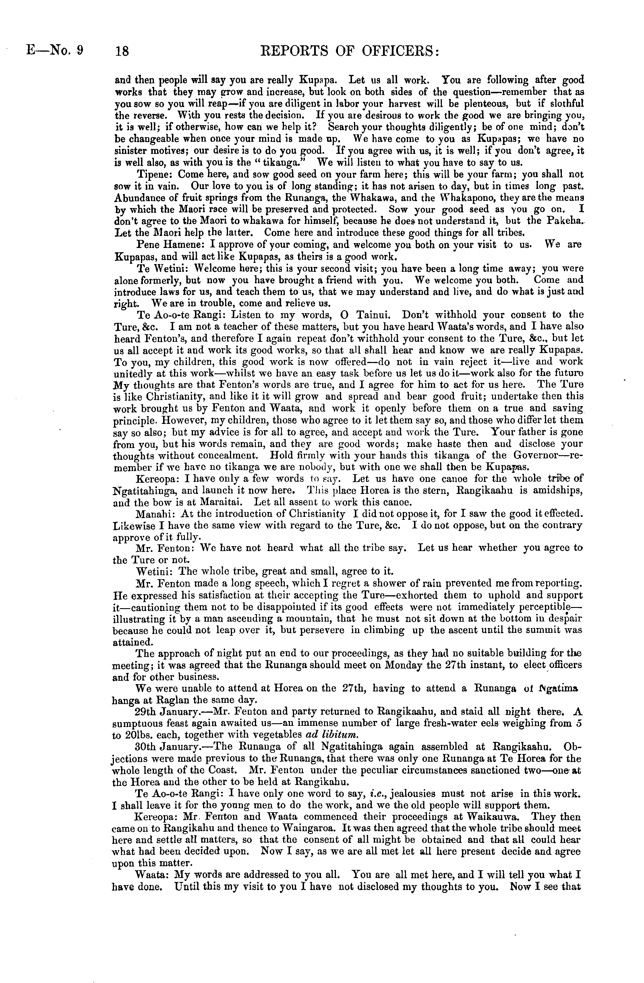 and then people will say you are really Kupapa. Let us all work. You are following after good works that they may arrow and increase, but look on both sides of the question—remember that as you sow so you will reap—if you are diligent in labor your harvest will be plenteous, but if slothful the reverse. With you rests the decision. If you are desirous to work the good we are bringing you, it is well; if otherwise, how can we help it? Search your thoughts diligently; be of one mind; don't be changeable when once your mind is made up. We have come to you as Kupapas; we have no sinister motives; our desire is to do you good. If you agree wilh us, it is well; if you don't agree, it is well also, as with you is the " tikanga." We will listen to what you have to say to us. Tipene: Come here, and sow good seed on your farm here; this will be your farm; you shall not sow it in vain. Our love to you is of long standing; it has not arisen to day, but in times long past. Abundance of fruit springs from the Runanga, the Whakawa, and the Whakapono, they are the means by which the Maori race will be preserved and protected. Sow your good seed as you go on. I don't agree to the Maori to whakawa for himself, because he does not understand it, but the Pakeha. Let the Maori help the latter. Come here and introduce these good things for all tribes. Pene Hamene: I approve of your coming, and welcome you both on your visit to us. We are Kupapas, and will act like Kupapas, as theirs is a good work. Te Wetini: Welcome here; this is your second visit; you have been a long time away; you were alone formerly, but now you have brought a friend with you. We welcome you both. Come and introduce laws for us, and teach them to us, that we may understand and live, and do what is just ami right. We are in trouble, come and relieve us. Te Ao-o-te Rangi: Listen to my words, 0 Tainui. Don't withhold your consent to the Ture, &c. I am not a teacher of these matters, but you have heard Waata's words, and I have also heard Fenton's, and therefore I again repeat don't withhold your consent to the Ture, &c, but let us all accept it and work its good works, so that all shall hear and know we are really Kupapas. To you, my children, this good work is now offered—do not in vain reject it—live and work unitedly at this work—whilst we have an easy task before us let us do it—work also for the future My thoughts are that Fenton's words are true, and I agree for him to act for us here. The Ture is like Christianity, and like it it will grow and spread and bear good fruit; undertake then this work brought us by Fenton and Waata, and work it openly before them on a true and saving principle. However, my children, those who agree to it let them say so, and those who differ let them say so also; but my advice is for all to agree, and accept and work the Ture. Your father is gone from you, but his words remain, and they are good words; make haste then and disclose your thoughts without concealment. Hold firmly with your hands this tikanga of the Governor—remember if we have no tikanga we are nobody, but with one we shall then be Kupapas. Kereopa: I have only a few words to say. Let us have one canoe for the whole tribe of Ngatitahinga, and launch it now here. This place Horea is the stern, Raugikaahu is amidships, and the bow is at Maraitai. Let all assent to work this canoe. Manahi: At the introduction of Christianity I did not oppose it, for I saw the good it effected. Likewise I have the same view with regard to the Ture, &c. I do not oppose, but on the contrary approve of it fully. Mr. Fenton: We have not heard what all the tribe say. Let us hear whether you agree to the Ture or not. Wetini: The whole tribe, great and small, agree to it. Mr. Fenton made a long speech, which I regret a shower of rain prevented me from reporting. He expressed his satisfaction at their accepting the Ture—exhorted them to uphold and support it —cautioning them not to be disappointed if its good effects were not immediately perceptible— illustrating it by a man ascending a mountain, that he must not sit down at the bottom in despair because he could not leap over it, but persevere in climbing up the ascent until the summit was attained. The approach of night put an end to our proceedings, as they had no suitable building for tlie meeting; it was agreed that the Runanga should meet on Monday the 27th instant, to elect officers and for other business. We were unable to attend at Horea on the 27th, having to attend a Runanga oi JNgatima hanga at Raglan the same day. 29th January.—Mr. Feuton and party returned to Rangikaahu, and staid all night there. A sumptuous feast again awaited us—an immense number of large fresh-water eels weighing from 5 to 2Olbs. each, together with vegetables ad libitum. 30th January.—The Runauga of all Ngatitahinga again assembled at Rangikaahu. Objections were made previous to the Runanga, that there was only one Runanga at Te Ilorea for the whole length of the Coast. Mr. Fenton under the peculiar circumstances sanctioned two—one at the Horea and the other to be held at Rangikahu. Te Ao-o-te Rangi: I have only one word to say, i.e., jealousies must not arise in this work. I shall leave it for the young men to do the work, and we the old people will support them. Kereopa: Mr. Fentou and Waata commenced their proceedings at Waikauwa. They then came on to Rangikahu and thenco to Waingaroa. It was then agreed that the whole tribe should meet here and settle all matters, so that the consent of all might be obtained and that all could hear what had been decided upon. Now I say, as we are all met let all here present decide and agree upon this matter. Waata: My words are addressed to you all. You are all met here, and I will tell you what I have done. Until this my visit to you 1 have not disclosed my thoughts to you. Now I see that