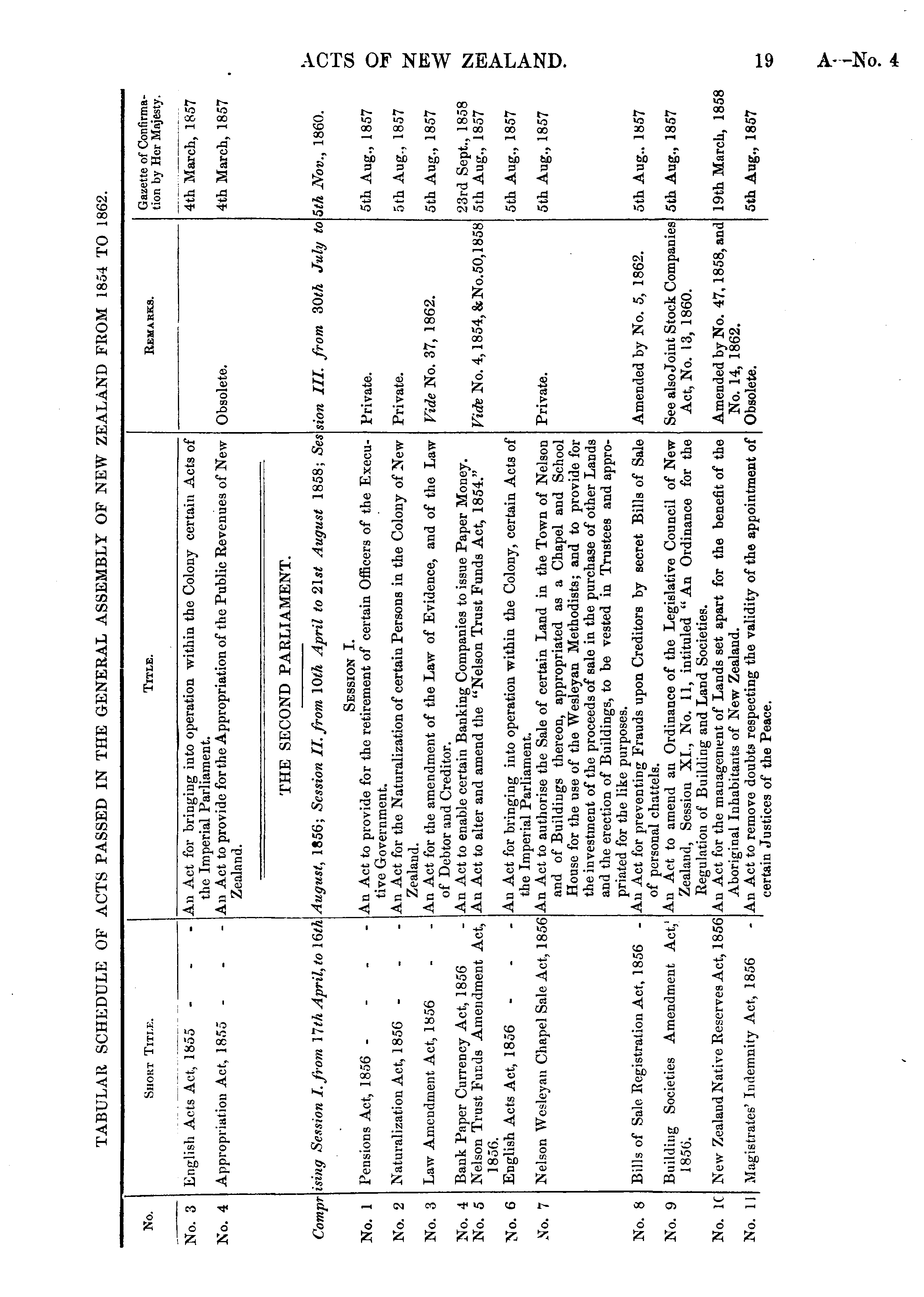 TABULAR SCHEDULE OF ACTS PASSED IN THE GENERAL ASSEMBLY OF NEW ZEALAND FROM 1854 TO 1862. No. SiioitT Title. Title. Remarks. Gazette of Confirmation by Her Majesty. No. 3 English Acts Act, 1855 An Act for bringing into operation within the Colony certain Acts of the Imperial Parliament. An Act to provide for the Appropriation of the Public Revenues of New Zealand. 4th March, 1857 No. 4 Appropriation Act, 18.55 - Obsolete. 4th March, 1857 C'ompr ising Session I. from 11th April, to IGth THE SECOND PARLIAMENT. sion III. from 30th July to Sth Nov., 1860. August, 1856; Session II. from 10th April to 21st August 1858; Ses No. 1 No. 2 No. 3 Pensions Act, 1856 - Naturalization Act, 1856 - Law Amendment Act, 1856 Session I. An Act to provide for the retirement of certain Officers of the Executive Government. An Act for the Naturalization of certain Persons in the Colony of New Zealand. An Act for the amendment of the Law of Evidence, and of the Law of Debtor and Creditor. An Act to enable certain Banking Companies to issue Paper Money. An Act to alter and amend the "Nelson Trust Funds Act, 1854." Private. Private. Fide No. 37, 1862. 5th Aug., 1857 5th Aug., 1857 5th Aug., 1857 No. 4 No. 5 Bank Paper Currency Act, 1856 Nelson Trust Funds Amendment Act, 1856. English Acts Act, 1856 - Vide No. 4,1854, &No.50,1858 23rd Sept., 1858 5th Aug., 1857 No. 6 An Act for bringing into operation within the Colony, certain Acts of the Imperial Parliament. An Act to authorise the Sale of certain Land in the Town of Nelson and of Buildings thereon, appropriated as a Chapel and School House for the use of the Wesleyan Methodists; and to provide for the investment of the proceeds of sale in the purchase of other Lands and the erection of Buildings, to be vested in Trustees and appropriated for the like purposes. An Act for preventing Frauds upon Creditors by secret Bills of Sale of personal chattels. An Act to amend an Ordinance of the Legislative Council of New Zealand, Session XL, No. 11, intituled "An Ordinance for the Regulation of Building and Land Societies. An Act for the management of Lands set apart for the benefit of the Aboriginal Inhabitants of New Zealand. An Act to remove doubts respecting the validity of the appointment of certain Justices of the Peace. Private. 5th Aug., 1857 So. 7 Nelson Wesleyan Chapel Sale Act, 1856 5th Aug., 1857 No. 8 Bills of Sale Registration Act, 1856 - Amended by No. 5, 1862. 5th Aug.. 1857 I No. 9 Building Societies Amendment Act,' 1856. See also Joint Stock Companies Act, No. 13, 1860. 5th Aug., 1857 No. 1C New Zealand Native Reserves Act, 1856 Amended by No. 47, 1858, and No. 14, 1862. Obsolete. 19th March, 1858 No. II Magistrates' Indemnity Act, 1856 5th Aug., 1857