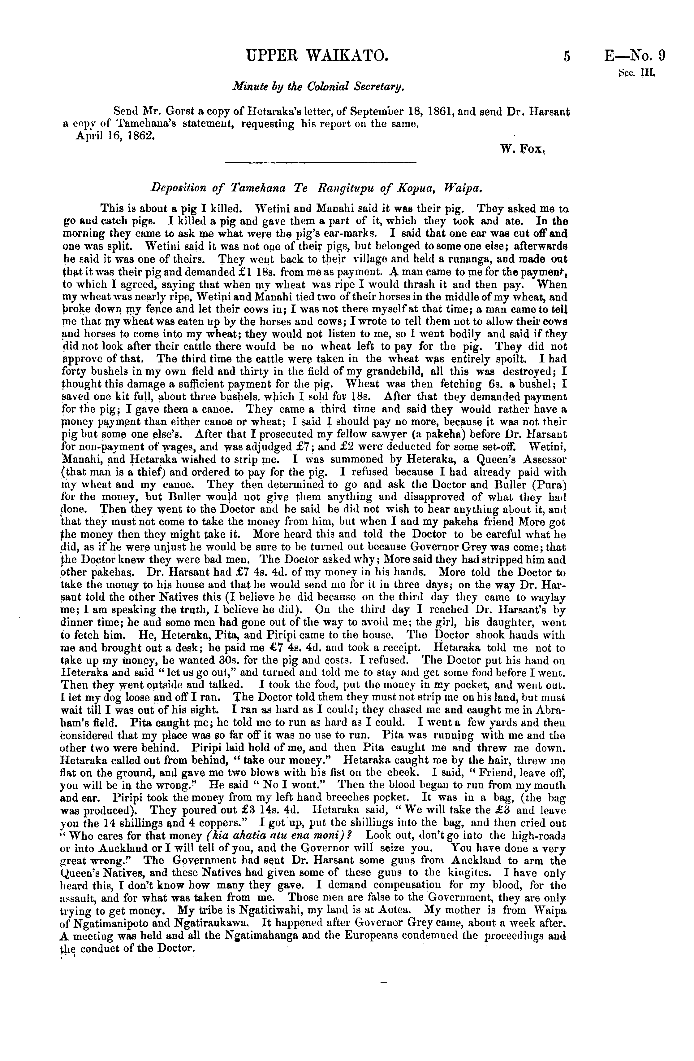 Minute by the Colonial Secretary. Send Mr. Gorst a copy of Hetaraka's letter, of September 18, 1861, and send Dr. Harsant a copy (if Tamehana's statement, requesting his report on the same. April 16, 1862. W. Fox,