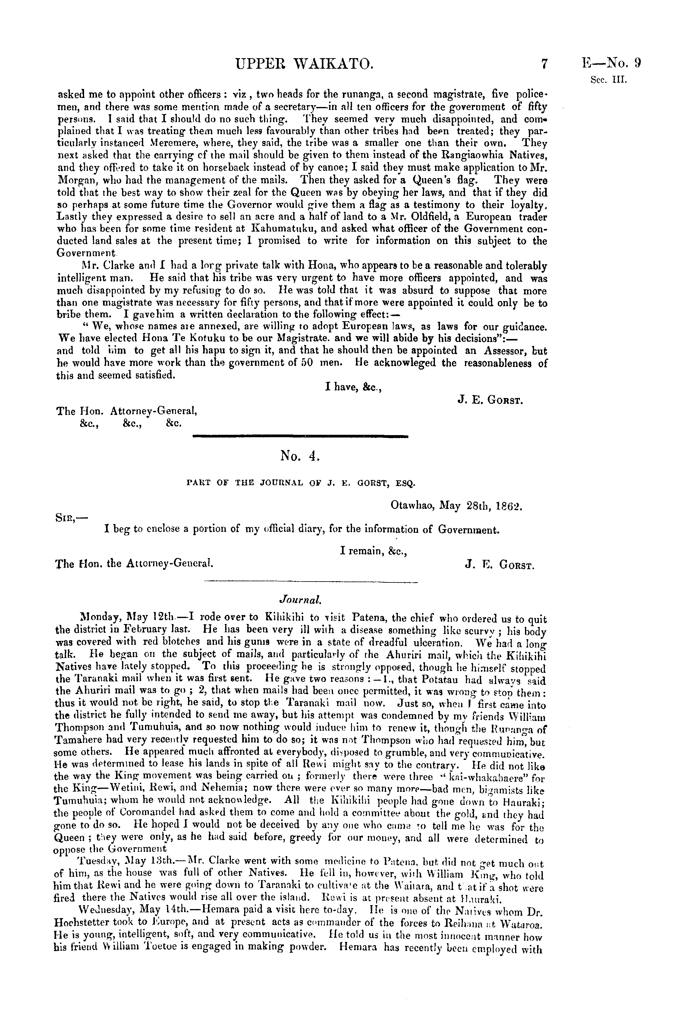 No. 4. PAKT OF THE JOURNAL OF J. E. GORST, ESQ. Otawhao, May 28th, 1862. SlB,— I beg to enclose a portion of my official diary, for the information of Government. I remain, &c, The Hon. the Attorney-General. J. E. Gorst.