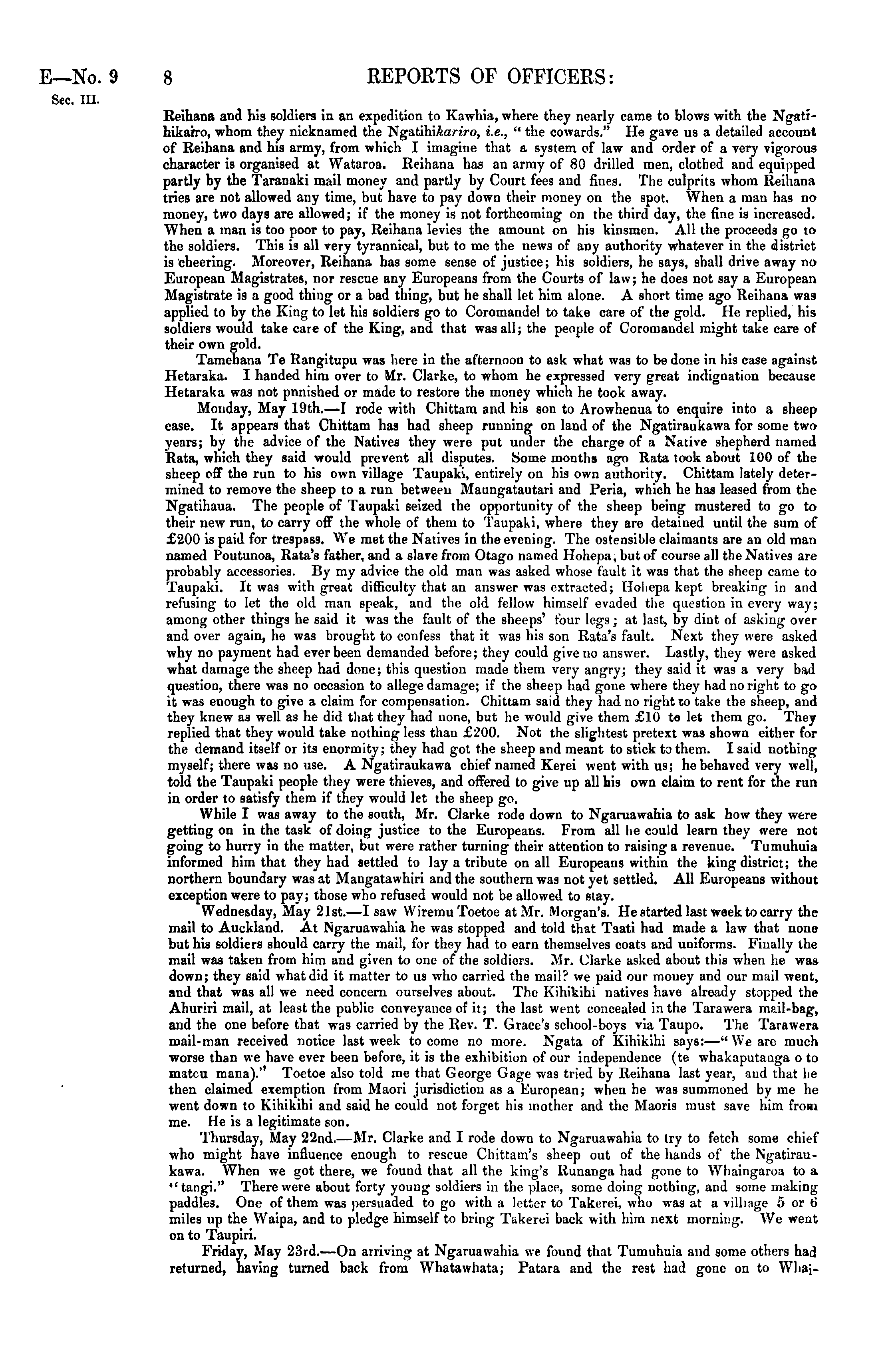 Reihana and his soldiers in an expedition to Kawhia, where they nearly came to blows with the Ngatihikairo, whom they nicknamed the NgatihiAa/iro, i.e., " the cowards." He gave us a detailed account of Reihana and his army, from which I imagine that a system of law and order of a very vigorous character is organised at Wataroa. Reihana has an army of 80 drilled men, clothed and equipped partly by the Taranaki mail money and partly by Court fees and fines. The culprits whom Reihana tries are not allowed any time, but have to pay down their money on the spot. When a man has no money, two days are allowed; if the money is not forthcoming on the third day, the fine is increased. When a man is too poor to pay, Reihana levies the amouut on his kinsmen. All the proceeds go to the soldiers. This is all very tyrannical, but to me the news of any authority whatever in the district is cheering. Moreover, Reihana has some sense of justice; his soldiers, he says, shall drive away no European Magistrates, nor rescue any Europeans from the Courts of law; he does not say a European Magistrate is a good thing or a bad thing, but he shall let him alone. A short time ago Reihana was applied to by the King to let his soldiers go to Coromandel to take care of the gold. He replied, his soldiers would take care of the King, and that was all; the people of Coromandel might take care of their own gold. Tamehana Te Rangitupu was here in the afternoon to ask what was to be done in his case against Hetaraka. I handed him over to Mr. Clarke, to whom he expressed very great indignation because Hetaraka was not pnnished or made to restore the money which he took away. Monday, May 19th.—I rode with Chittam and his son to Arowhenua to enquire into a sheep case. It appears that Chittam has had sheep running on land of the Ngatiraukawa for some two years; by the advice of the Natives they were put under the charge of a Native shepherd named Rata, which they said would prevent all disputes. Some months ago Rata took about 100 of the sheep off the run to his own village Taupaki, entirely on his own authority. Chittam lately determined to remove the sheep to a run between Maungatautari and Peria, which he has leased from the Ngatihaua. The people of Taupaki seized the opportunity of the sheep being mustered to go to their new run, to carry off the whole of them to Taupaki, where they are detained until the sum of £200 is paid for trespass. We met the Natives in the evening. The ostensible claimants are an old man named Poutunoa, Rata's father, and a slave from Otago named Hohepa, but of course all the Natives are probably accessories. By my advice the old man was asked whose fault it was that the sheep came to Taupaki. It was with great difficulty that an answer was extracted; Hohepa kept breaking in and refusing to let the old man speak, and the old fellow himself evaded the question in every way; among other things he said it was the fault of the sheeps' four legs; at last, by dint of asking over and over again, he was brought to confess that it was his son Rata's fault. Next they were asked why no payment had ever been demanded before; they could give no answer. Lastly, they were asked what damage the sheep had done; this question made them very angry; they said it was a very bad question, there was no occasion to allege damage; if the sheep had gone where they had no right to go it was enough to give a claim for compensation. Chittam said they had no right to take the sheep, and they knew as well as he did that they had none, but he would give them £10 te let them go. They replied that they would take nothing less than £200. Not the slightest pretext was shown either for the demand itself or its enormity; they had got the sheep and meant to stick to them. I said nothing myself; there was no use. A Ngatiraukawa chief named Kerei went with us; he behaved very well, told the Taupaki people they were thieves, and offered to give up all his own claim to rent for the run in order to satisfy them if they would let the sheep go. While I was away to the south, Mr. Clarke rode down to Ngaruawahia to ask how they were getting on in the task of doing justice to the Europeans. From all he could learn they were not going to hurry in the matter, but were rather turning their attention to raising a revenue. Tumuhuia informed him that they had settled to lay a tribute on all Europeans within the king district; the northern boundary was at Mangatawhiri and the southern was not yet settled. All Europeans without exception were to pay; those who refused would not be allowed to stay. Wednesday, May 21st.—I saw Wiremu Toetoe at Mr. Morgan's. He started last week to carry the mail to Auckland. At Ngaruawahia he was stopped and told that Taati had made a law that none but his soldiers should carry the mail, for they had to earn themselves coats and uniforms. Finally the mail was taken from him and given to one of the soldiers. Mr. Clarke asked about this wheu lie was down; they said what did it matter to us who carried the mail? we paid our money and our mail went, and that was all we need concern ourselves about. The Kihikihi natives have already stopped the Ahuriri mail, at least the public conveyance of it; the last went concealed in the Tarawera mp_il-bag, and the one before that was carried by the Rev. T. Grace's school-boys via Taupo. The Tarawera mail-man received notice last week to come no more. Ngata of Kihikihi says:—" We are much worse than we have ever been before, it is the exhibition of our independence (te whakaputanga oto matcu mana)." Toetoe also told me that George Gage was tried by Reihana last year, aud that he then claimed exemption from Maori jurisdiction as a European; when he was summoned by me he went down to Kihikihi and said he could not forget his mother and the Maoris must save him froHi me. He is a legitimate son. Thursday, May 22nd.—Mr. Clarke and I rode down to Ngaruawahia to try to fetch some chief w