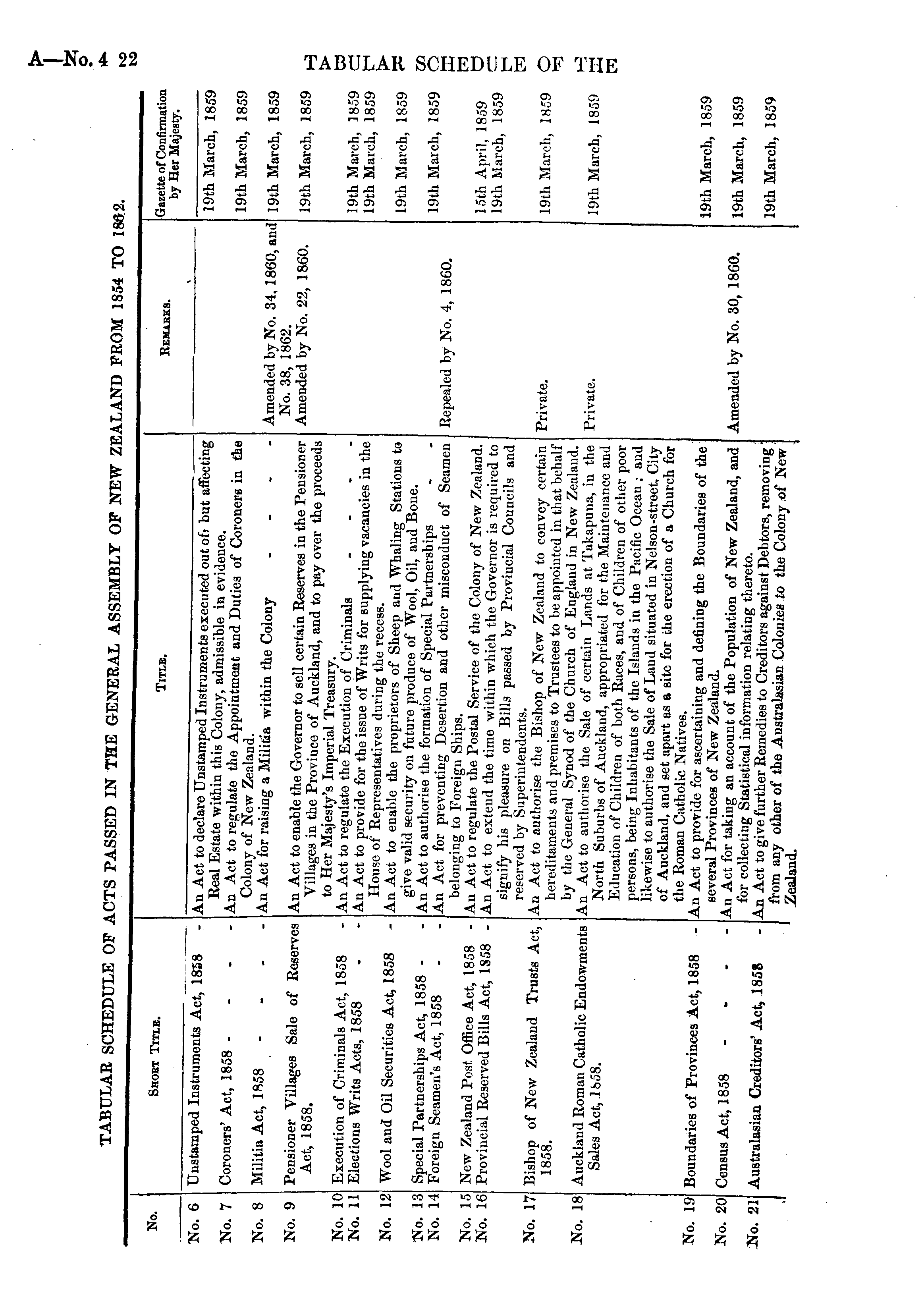 .AR SCHEDULE OF ACTS PASSED IN THE GENERAL ASSEMBLY OF NEW ZEALAND FROM 1854 TO 1«*2. No. Shobt Title. Title. Remarks. Gazette of Confirmation by Her Majesty. ■No. 6 Unstamped Instruments Act, 1858 An Act to declare Unstamped Instruments executed out of) but affecting Real Estate within this Colony, admissible in evidence. An Act to regulate the Appointment and Duties of Coroners in the Colony of New Zealand. An Act for raising a Militia within the Colony - No. 7 Coroners' Act, 1858 - 19th March, 1859 No. 8 19th March, 1859 Militia Act, 1358 - ... No. 9 Amended by No. 34, 1860, and No. 38, 1862. Ameuded by No. 22, 1860. 19th March, 1859 Pensioner Villages Sale of Reserves Act, 1858. An Act to enable the Governor to sell certain Reserves in the Pensioner Villages in the Proviuce of Auckland, and to pay over the proceeds to Her Majesty's Imperial Treasury. An Act to regulate the Execution of Criminals .... An Act to provide for the issue of Writs for supplying vacancies in the House of Representatives during the recess. An Act to enable the proprietors of Sheep and Whaling Stations to give valid security on future produce of Wool, Oil, and Bone. An Act to authorise the formation of Special Partnerships An Act for preventing Desertion and other misconduct of Seamen belonging to Foreign Ships. An Act to regulate the Postal Service of the Colony of New Zealand. An Act to extend the time within which the Governor is required to signify his pleasure on Bills passed by Provincial Councils and reserved by Superintendents. An Act to authorise the Bishop of New Zealand to convey certain hereditaments and premises to Trustees to be appointed in that behalf by the General Synod of the Church of England in New Zealand. An Act to authorise the Sale of certain Lands at Takapuna, in the North Suburbs of Auckland, appropriated for the Maintenance and Education of Children of both Races, and of Children of other poor persons, being Inhabitants of the Islands in the Pacific Ocean ,• and likewise to authorise the Sale of Land situated in Nelson-street, City of Auckland, and set apart as a site for the erection of a Church for the Roman Catholic Natives. An Act to provide for ascertaining and denning the Boundaries of the several Provinces of New Zealand. An Act for taking an account of the Population of New Zealand, and for collecting Statistical information relating thereto. An Act to give further Remedies to Creditors against Debtors, removing from any other of the Australasian Colonies to the Colony of New Zealand. 19th March, 1859 No. 10 So. 11 Execution of Criminals Act, 1858 Elections Writs Acts, 1858 19th March, 1859 19th March, 1859 No. 12 Wool and Oil Securities Act, 1858 Repealed by No. 4, 1860. 1S To. 13 No. 14 19th March, 1859 Special Partnerships Act, 1858 - Foreign Seamen's Act, 1858 19th March, 1859 No. 15 No. 16 New Zealand Post Office Act, 1858 - Provincial Reserved Bills Act, 1S58 - 15th April, 1859 19th March, 1859 No. 17 Bishop of New Zealand Trusts Act, 1858. Private. 19th March, 1859 No. 18 Auckland Romnn Catholic Endowments Sales Act, 1858. Private. 19th March, 1859 No. 19 Boundaries of Provinces Act, 1858 Amended by No. 30, 1860. 19th March, 1859 No. 20 Census Act, 1858 - No. 21 19th March, 1859 Australasian Creditors' Act, 1858 19th March, 1859 .1