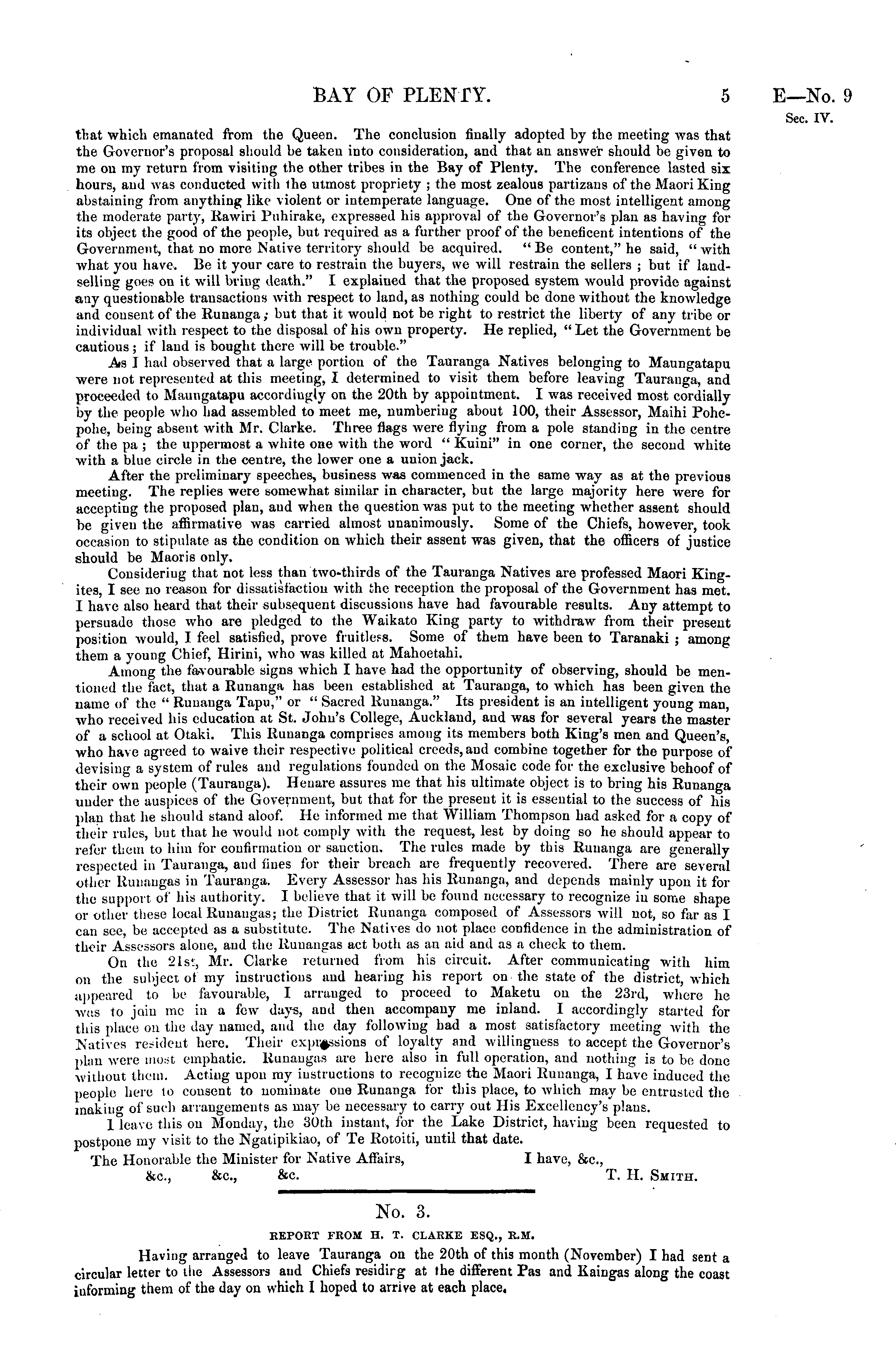No. 3. REPORT FROM H. T. CLARKE ESQ., E.M. Having arranged to leave Tauranga on the 20th of this month (November) I had sent a circular letter to the Assessors and Chiefs residirg at the different Pas and Kaiugas along the coast informing them of the day on which I hoped to arrive at each place.