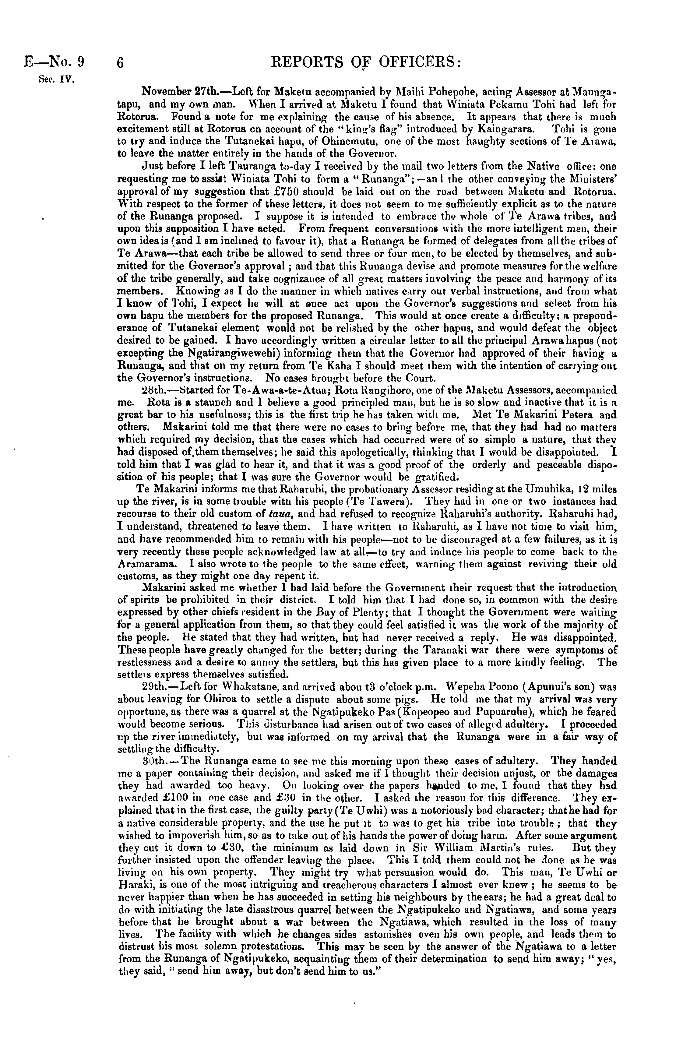 November 27th.—Left for Maketu accompanied by Maihi Pohepohe, acting Assessor at Maungatapu, and my own man. When I arrived at Maketu 1 found that VViniata Pekamu Tohi had left for Rotorua. Found a note for me explaining the cause of his absence. It appears that there is much excitement still at Rotorua on account of the "king's flag" introduced by Kaingarara. Tohi is gone to try and induce the Tutanekai hapu, of Ohinemutu, one of the most haughty sections of Te Arawa, to leave the matter entirely in the hands of the Governor. Just before I left Tauranga to-day I received by the mail two letters from the Native office: one requesting me to assist Winiata Tohi to form a " Runanga";— an 1 the other conveying the Ministers' approval of my suggestion that £750 should belaid out on the road between Maketu and Rotorua. With respect to the former of these letters, it does not seem to me sufficiently explicit as to the nature of the Runanga proposed. I suppose it is intended to embrace the whole of Te Arawa tribes, and upon this supposition I have acted. From frequent conversations with the more intelligent men, their own idea is 'and I am inclined to favour it), that a Runanga be formed of delegates from all the tribes of Te Arawa—that each tribe be allowed to send three or four men, to be elected by themselves, and submitted for the Governor's approval ; and that this Runanga devise and promote measures for the welfare of the tribe generally, and take cognizance of all great matters involving the peace and harmony of its members. Knowing as Ido the manner in which natives carry out verbal instructions, and from what I know of Tohi, I expect he will at once act upon the Governor's suggestions and select from his own hapu the members for the proposed Runanga. This would at once create a difficulty; a preponderance of Tutanekai element would not be relished by the other hapus, and would defeat the object desired to be gained. I have accordingly written a circular letter to all the principal Aravva hapus (not excepting the Ngatirangiwewehi) informing them that the Governor had approved of their having a Runanga, and that on my return from Te Kaha I should meet them with the intention of carrying out the Governor's instructions. No cases brought before the Court. 28th.—Started for Te-Awa-a-te-Atua; Rotu Kangihoro, one of the Maketu Assessors, accompanied me. Rota is a staunch and I believe a good principled man, hut he is so slow and inactive that it is a great bar to his usefulness; this is the first trip he has taken with me. Met Te Makarini Petera and others. Makarini told me that there were no cases to bring before me, that they had had no matters which required my decision, that the cases which had occurred were of so simple a nature, that they had disposed of.them themselves; he said this apologetically, thinking that I would be disappointed. I told him that I was glad to hear it, and that it was a good proof of the orderly and peaceable disposition of his people; that I was sure the Governor would be gratified. Te Makarini informs me that Raharuhi, the probationary Assessor residing at the Umuhika, 12 miles up the river, is in some trouble witn his people (Te Tawera). They had in one or two instances had recourse to their old custom of taua, and had refused to recognize llaharuhi's authority. Raharuhi had, I understand, threatened to leave them. I have written to Raharuhi, as I have not time to visit him, and have recommended him to remain with his people—not to be discouraged at a few failures, as it is very recently these people acknowledged law at all—to try and induce his people to come back to the Aramarama. I also wrote to the people to the same effect, warning them against reviving their old customs, as they might one day repent it. Makarini asked me whether 1 had laid before the Government their request that the introduction of spirits be prohibited in their district. I told him that I had done so, in common with the desire expressed by other chiefs resident in the Bay of Plenty; that I thought the Government were wailing for a general application from them, so that they could feel satislied it was the work of tlie majority of the people. He stated that they had written, but had never received a reply. He was disappointed. These people have greatly changed for the better; during the Taranaki war there were symptoms of restlessness and a desire to annoy the settlers, but this has given place to a more kindly feeling. The settlers express themselves satisfied. 29th. — Left for Whakatane, and arrived about 3 o'clock p.m. Wepeha Poono (Apunui's son) was about leaving for Ohiroa to settle a dispute about some pigs. He told me that my arrival was very opportune, as there was a quarrel at the Ngatipukeko Pas (Kopeopeo and Pupuaruhe), which he feared would become serious. This disturbance had arisen out of two cases of alleged adultery. I proceeded up the river immediately, but was informed on my arrival that the Runanga were in a fair way of settling the difficulty. 30th. — The Runanga came to see me this morning upon these cases of adultery. They handed me a paper containing their decision, and asked me if 1 thought their decision unjust, or the damages they had awarded too heavy. On looking over the papers handed to me, I found that they had awarded £100 in one case and £30 in the other. I asked the reason for this difference They explained that in the first case, the guilty party (Te Uwhi) was a notoriously bad character; that he had for a native considerable property, and the use he put it to was to get his tribe into trouble ; that they wished to impoverish him, so as to take out of his hands the power of doing harm. After some argument they cut it down to 430, the minimum as laid down in Sir William Martin's rules. But they further insisted upon the offender leaving the place. This I told them could not be done as he was living on his own property. They might try wh