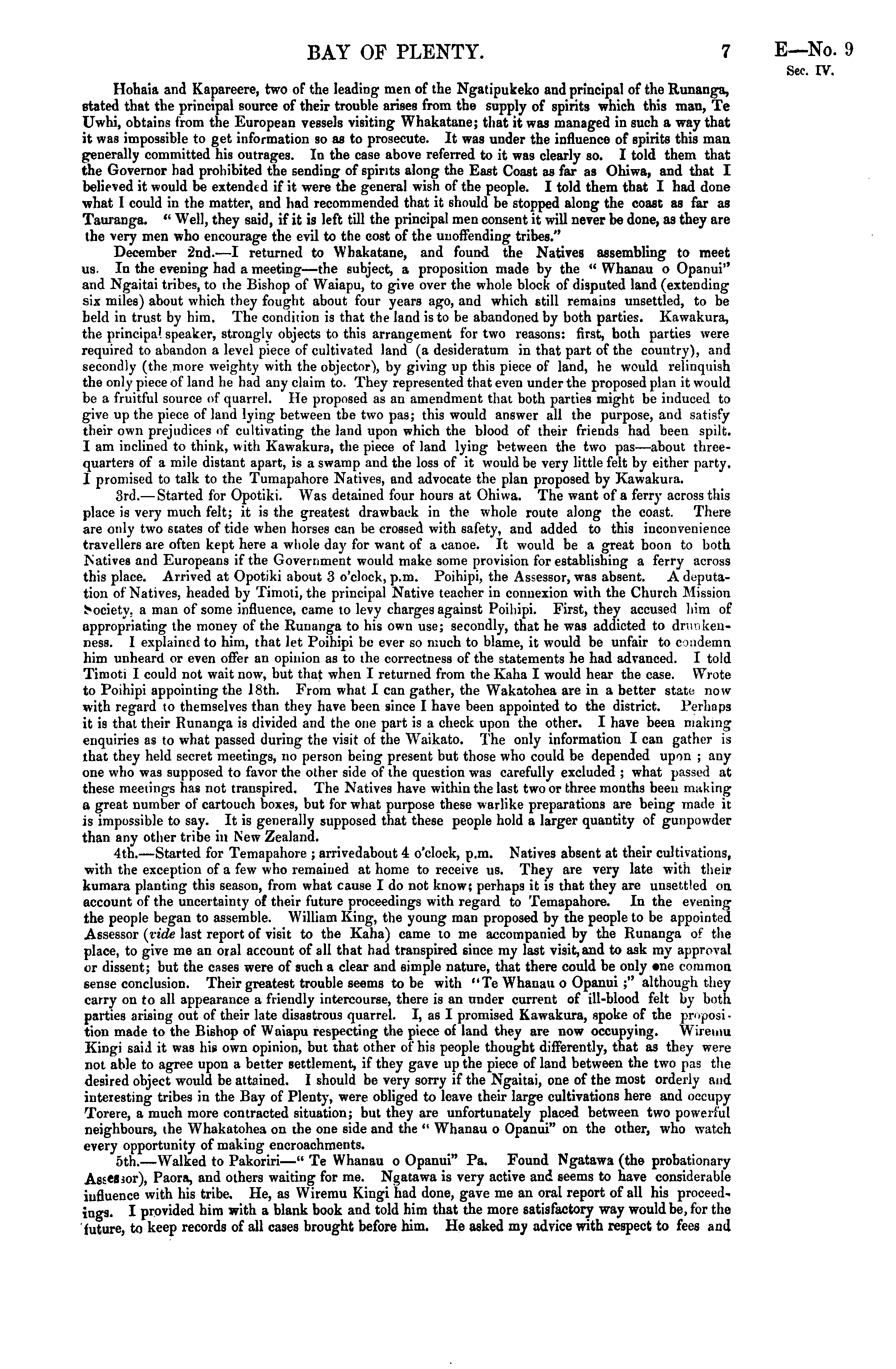 Hohaia and Kapareere, two of the leading men of the Ngatipukeko and principal of the Runanga, stated that the principal source of their trouble arises from the supply of spirits which this man, Te Uwhi, obtains from the European vessels visiting Whakatane; that it was managed in such a way that it was impossible to get information so as to prosecute. It was under the influence of spirits this man generally committed his outrages. In the case above referred to it was clearly so. I told them that the Governor had prohibited the sending of spirits along the East Coast as far as Ohiwa, and that I believed it would be extended if it were the general wish of the people. I told them that I had done what I could in the matter, and had recommended that it should be stopped along the coast as far as Tauranga. " Well, they said, if it is left till the principal men consent it will never be done, as they are the very men who encourage the evil to the cost of the unoffending tribes." December 2nd.—l returned to Whakatane, and found the Natives assembling to meet us. In the evening had a meeting—the subject, a proposition made by the " Whanau o Opanui" and Ngaitai tribes, to the Bishop of Waiapu, to give over the whole block of disputed land (extending six miles) about which they fought about four years ago, and which still remains unsettled, to be held in trust by him. The condition is that the land is to be abandoned by both parties. Kawakura, the principal speaker, strongly objects to this arrangement for two reasons: first, both parties were required to abandon a level piece of cultivated land (a desideratum in that part of the country), and secondly (the more weighty with the objector), by giving up this piece of land, he would relinquish the only piece of land he had any claim to. They represented that even under the proposed plan it would be a fruitful source of quarrel. He proposed as an amendment that both parties might be induced to give up the piece of land lying between the two pas; this would answer all the purpose, and satisfy their own prejudices of cultivating the land upon which the blood of their friends had been spilt. I am inclined to think, with Kawakura, the piece of land lying between the two pas —about threequarters of a mile distant apart, is a swamp and the loss of it would be very little felt by either party. 1 promised to talk to the Tumapahore Natives, and advocate the plan proposed by Kawakura. 3rd.— Started for Opotiki. Was detained four hours at Ohiwa. The want of a ferry across this place is very much felt; it is the greatest drawback in the whole route along the coast. There are only two states of tide when horses can be crossed with safety, and added to this inconvenience travellers are often kept here a whole day for want of a canoe. It would be a great boon to both Natives and Europeans if the Government would make some provision for establishing a ferry across this place. Arrived at Opotiki about 3 o'clock, p.m. Poihipi, the Assessor, was absent. A deputation of Natives, headed by Timoti, the principal Native teacher in connexion with the Church Mission a man of some influence, came to levy charges against Poihipi. First, they accused him of appropriating the money of the Runanga to his own use; secondly, that he was addicted to drunkenness. I explained to him, that let Poihipi be ever so much to blame, it would be unfair to condemn him unheard or even offer an opinion as to the correctness of the statements he had advanced. I told Timoti I could not wait now, but that when I returned from the Kaha I would hear the case. Wrote to Poihipi appointing the 18th. From what I can gather, the Wakatohea are in a better state now with regard to themselves than they have been since I have been appointed to the district. Perhaps it is that their Runanga is divided and the one part is a check upon the other. I have been making enquiries as to what passed during the visit of the Waikato. The only information I can gather is that they held secret meetings, no person being present but those who could be depended upon ; any one who was supposed to favor the other side of the question was carefully excluded ; what passed at these meetings has not transpired. The Natives have within the last two or three months beeu making a great number of cartouch boxes, but for what purpose these warlike preparations are being made it is impossible to say. It is generally supposed that these people hold a larger quantity of gunpowder than any other tribe in New Zealand. 4th. —Started for Temapahore ; arrivedabout 4 o'clock, p.m. Natives absent at their cultivations, with the exception of a few who remained at home to receive us. They are very late with their kumara planting this season, from what cause I do not know; perhaps it is that they are unsettled on account of the uncertainty of their future proceedings with regard to Temapahore. In the evening the people began to assemble. William King, the young man proposed by the people to be appointed Assessor (vide last report of visit to the Kaha) came to me accompanied by the Runanga of the place, to give me an oral account of all that had transpired 6ince my last visit, and to ask my approval or dissent; but the cases were of such a clear and simple nature, that there could be only sne common, sense conclusion. Their greatest trouble seems to be with "Te Whanau o Opanui ;" although they carry on to all appearance a friendly intercourse, there is an under current of ill-blood felt by both parties arising out of their late disastrous quarrel. I, as I promised Kawakura, spoke of the proposition made to the Bishop of Waiapu respecting the piece of land they are now occupying. Wiremu Kingi said it was his own opinion, but that other of his people thought differently, that as they were not able to agree upon a better settlement, if they gave up the piece of land between the two pas the desired object would be attained. I should be very sorry