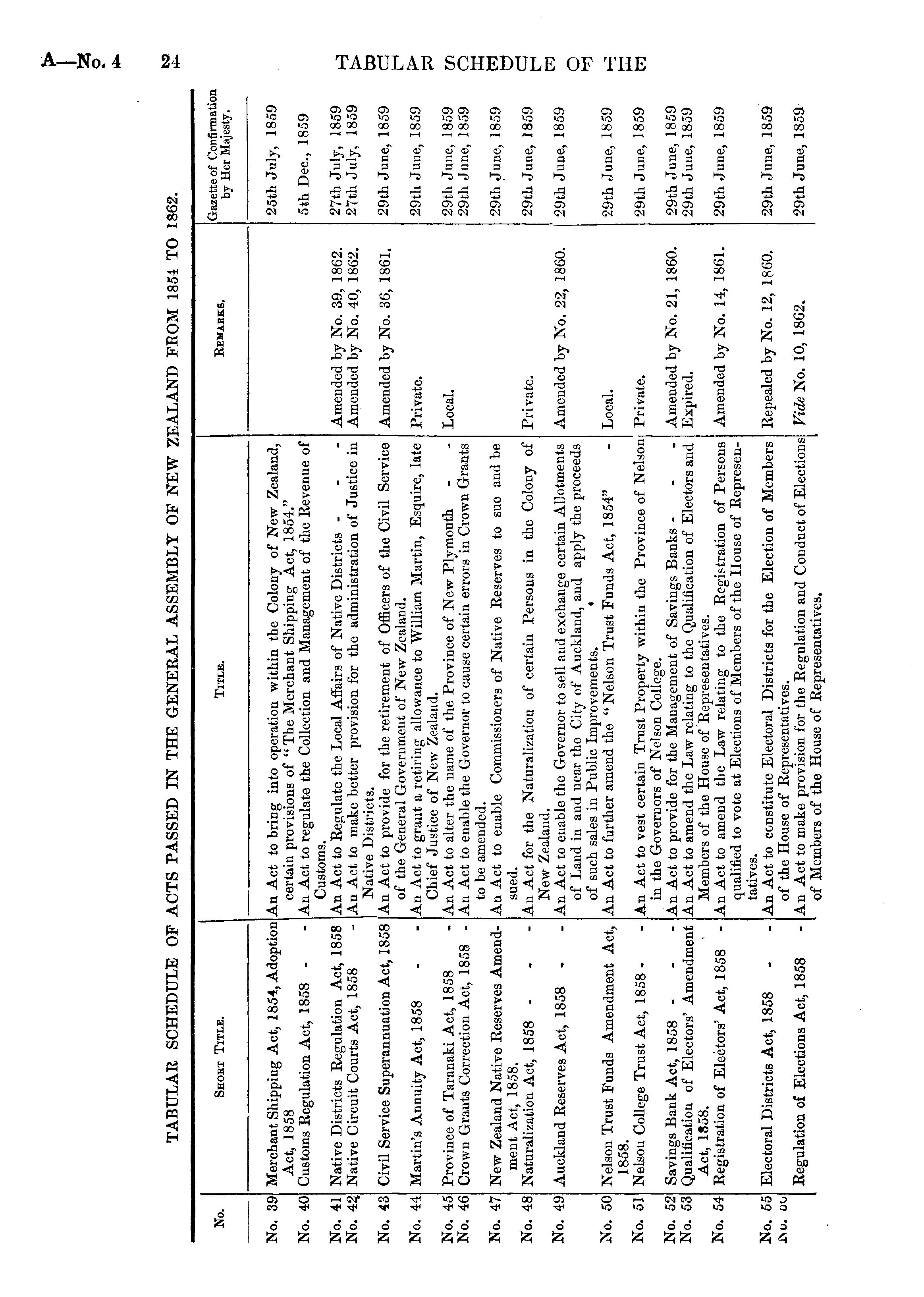 TABULAR SCHEDULE OF ACTS PASSED IN THE GENERAL ASSEMBLY OF NEW ZEALAND FROM 1854 TO 1862. No. Short Title. Title. Eemakks. Gazette of Confirmation by Her Majesty. No. 39 Merchant Shipping Act, 1854, Adoption Act, 1858 Customs Regulation Act, 1858 - An Act to bring into operation within the Colony of New Zealand, certain provisions of "The Merchant Shipping Act, 1854." An Act to regulate the Collection and Management of the Revenue of Customs. An Act to Regulate the Local Affairs of Native Districts - - - An Act to make better provision for the administration of Justice in Native Districts. An Act to provide for the retirement of Officers of the Civil Service of the General Government of New Zealand. An Act to grant a retiring allowance to William Martin, Esquire, late Chief Justice of New Zealand. An Act to alter the name of the Province of New Plymouth An Act to enable the Governor to cause certain errors in Crown Grants to be amended. An Act to enable Commissioners of Native Reserves to sue and bo sued. An Act for the Naturalization of certain Persons in the Colony of New Zealand. An Act to enable the Governor to sell and exchange certain Allotments of Land in and near the City of Auckland, and apply the proceeds of such sales in Public Improvements. ' An Act to further amend the "Nelson Trust Funds Act, 1854" 25th July, 1859 No. 40 5th Dec, 1859 No. 41 No. 42. Native Districts Regulation Act, 1858 Native Circuit Courts Act, 1858 Amended by No. 39, 1862. Amended by No. 40, 1862. 27th July, 1859 27th July, 1859 No. 43 Civil Service Superannuation Act, 1858 Amended by No. 36, 1861. 29th June, 1859 No. 44 Martin's Annuity Act, 1858 Private. 29th June, 1859 No. 45 No. 46 Province of Taranaki Act, 1858 Crown Grants Correction Act, 1858 - Local. 29th June, 1859 29th June, 1859 No. 47 New Zealand Native Reserves Amendment Act, 1858. Naturalization Act, 1858 - Private. 29th June, 1859 No. 48 29th June, 1859 No. 49 Auckland Reserves Act, 1858 - Amended by No. 22, 1860. 29th June, 1859 No. 50 Nelson Trust Funds Amendment Act, 1858. Nelson College Trust Act, 1858 - Local. 29th June, 1859 No. 51 An Act to vest certain Trust Property within the Province of Nelson in the Governors of Nelson College. An Act to provide for the Management of Savings Banks - An Act to amend the Law relating to the Qualification of Electors and Members of the House of Representatives. An Act to amend the Law relating to the Registration of Persons qualified to vote at Elections of Members of the House of Representatives. An Act to constitute Electoral Districts for the Election of Members of the House of Representatives. An Act to make provision for the Regulation and Conduct of Elections of Members of the House of Representatives. Private. 29th June, 1859 No. 52 No. 53 Savings Bank Act, 1858 - Qualification of Electors' Amendment Act, 1858. Registration of Electors' Act, 1858 - Amended by No. 21, 1860. Expired. 29th June, 1859 29th June, 1859 No. 54 Amended by No. 14, 1861. 29th June, 1859 No. 55 Electoral Districts Act, 1858 Repealed by No. 12, I860. 29th June, 1859 Regulation of Elections Act, 1858 Vide No. 10, 1862. 29th June, 1859 I