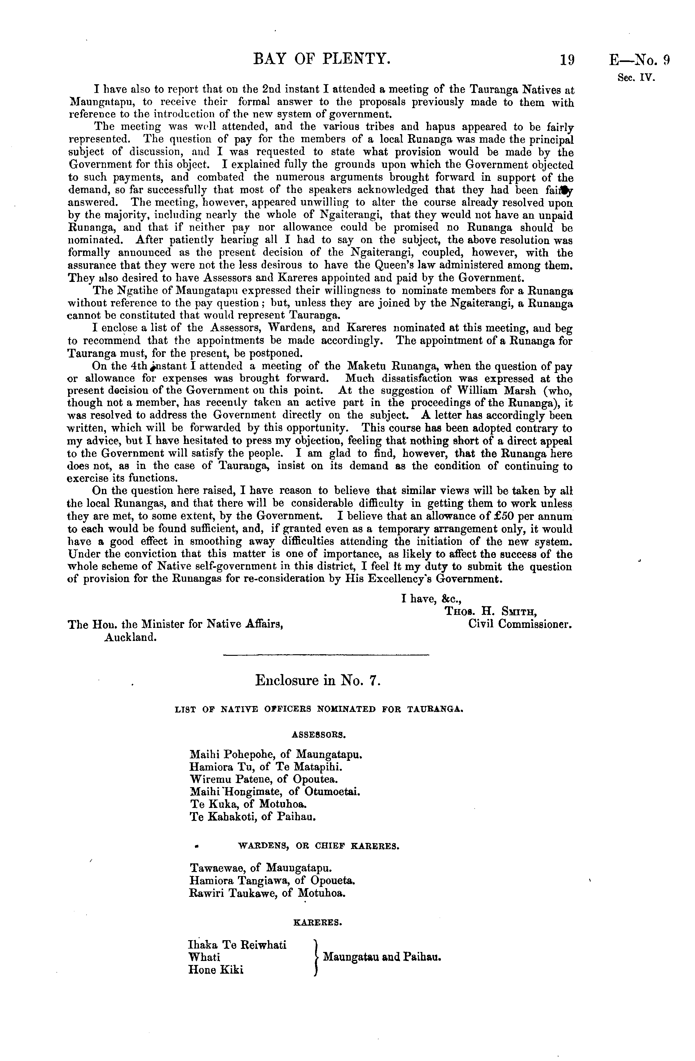 I have also to report that on the 2nd instant I attended a meeting of the Tauranga Natives at Maungntapu, to receive their formal answer to the proposals previously made to them -with reference to the introduction of the new system of government. The meeting was well attended, and the various tribes and hapus appeared to be fairly represented. The question of pay for the members of a local Runanga was made the principal subject of discussion, and I was requested to state what provision would be made by the Government for this object. I explained fully the grounds upon which the Government objected to such payments, and combated the numerous arguments brought forward in support of the demand, so far successfully that most of the speakers acknowledged that they had been faiity answered. The meeting, however, appeared unwilling to alter the course already resolved upon by the majority, including nearly the whole of Ngaiterangi, that they would not have an unpaid Runanga, and that if neither pay nor allowance could be promised no Runanga should be nominated. After patiently hearing all I had to say on the subject, the above resolution was formally announced as the present decision of the Ngaiterangi, coupled, however, with the assurance that they were not the less desirous to have the Queen's law administered among them. They also desired to have Assessors and Kareres appointed and paid by the Government. The Ntratihe of Maungatapu expressed their willingness to nominate members for a Runanga without reference to the pay question; but, unless they are joined by the Ngaiterangi, a Runanga cannot bo constituted that would represent Tauranga. I enclose a list of the Assessors, Wardens, and Kareres nominated at this meeting, and beg to recommend that the appointments be made accordingly. The appointment of a Runanga for Tauranga must, for the present, be postponed. On the 4th I attended a meeting of the Maketu Runanga, when the question of pay or allowance for expenses was brought forward. Much dissatisfaction was expressed at the present decisiou of the Government on this point. At the suggestion of William Marsh (who, though not a member, has recently taken an active part in the proceedings of the Runanga), it was resolved to address the Government directly on the subject. A letter has accordingly been written, which will be forwarded by this opportunity. This course has been adopted contrary to my advice, but I have hesitated to press my objection, feeling that nothing short of a direct appeal to the Government will satisfy the people. I am glad to find, however, that the Runanga here Joes not, as in the case of Tauranga, insist on its demand as the condition of continuing to exercise its functions. On the question here raised, I have reason to believe that similar views will be taken by all the local Runangas, and that there will be considerable difficulty in getting them to work unless they are met, to some extent, by the Government. I believe that an allowance of £50 per annum to each would be found sufficient, and, if granted even as a temporary arrangement only, it would have a good effect in smoothing away difficulties attending the initiation of the new system. Under the conviction that this matter is one of importance, as likely to affect the success of the whole scheme of Native self-government in this district, I feel It my duty to submit the question of provision for the Ruuangas for re-consideration by His Excellency's Government. I have, &c, Thos. H. Smith, The Hon. the Minister for Native Affairs, Civil Commissioner. Auckland.